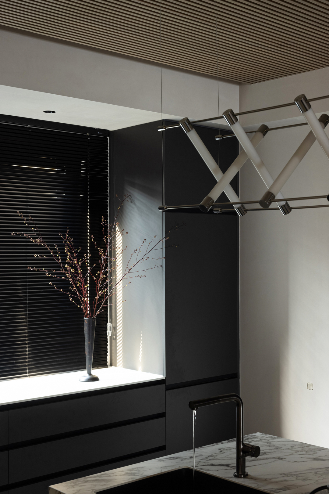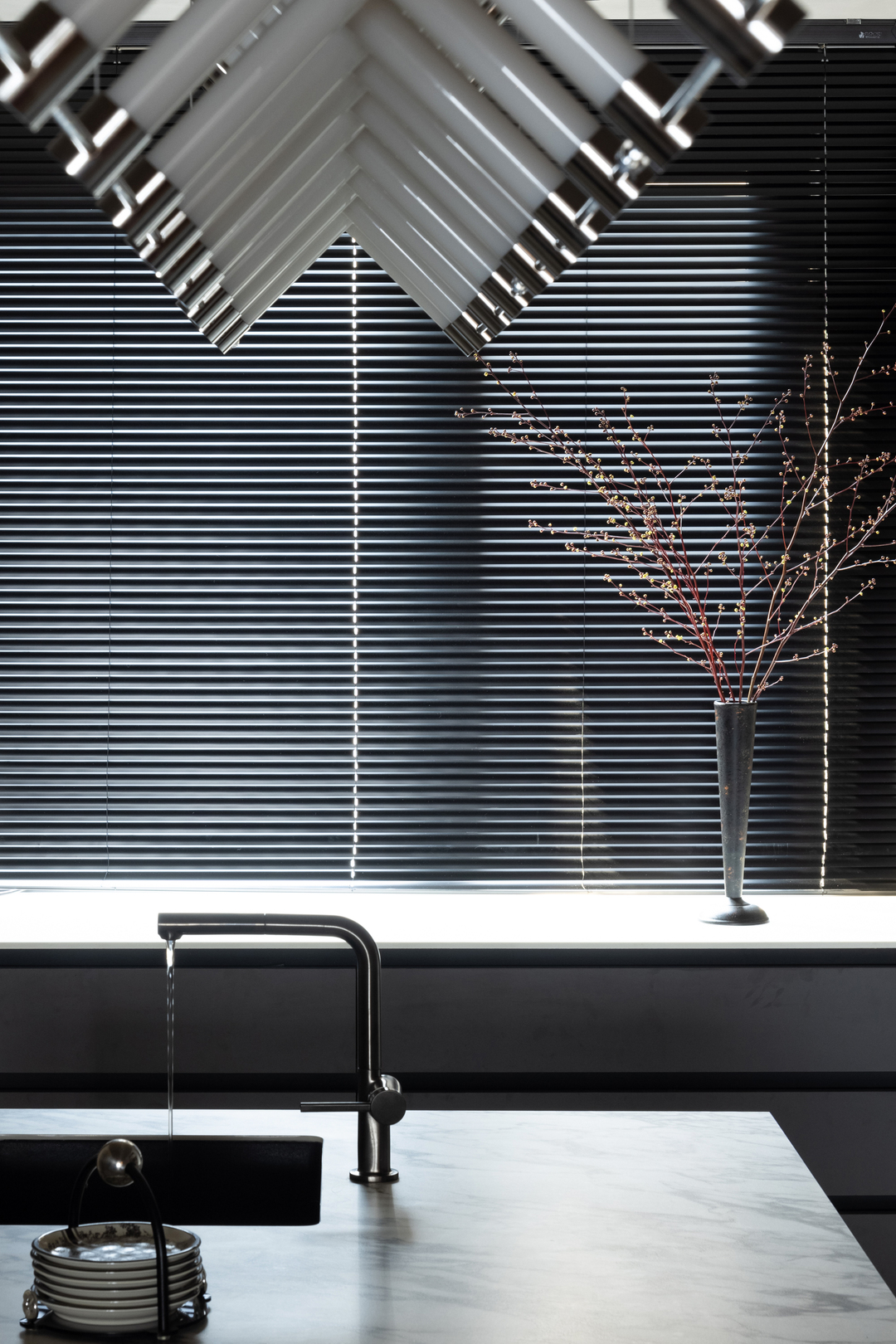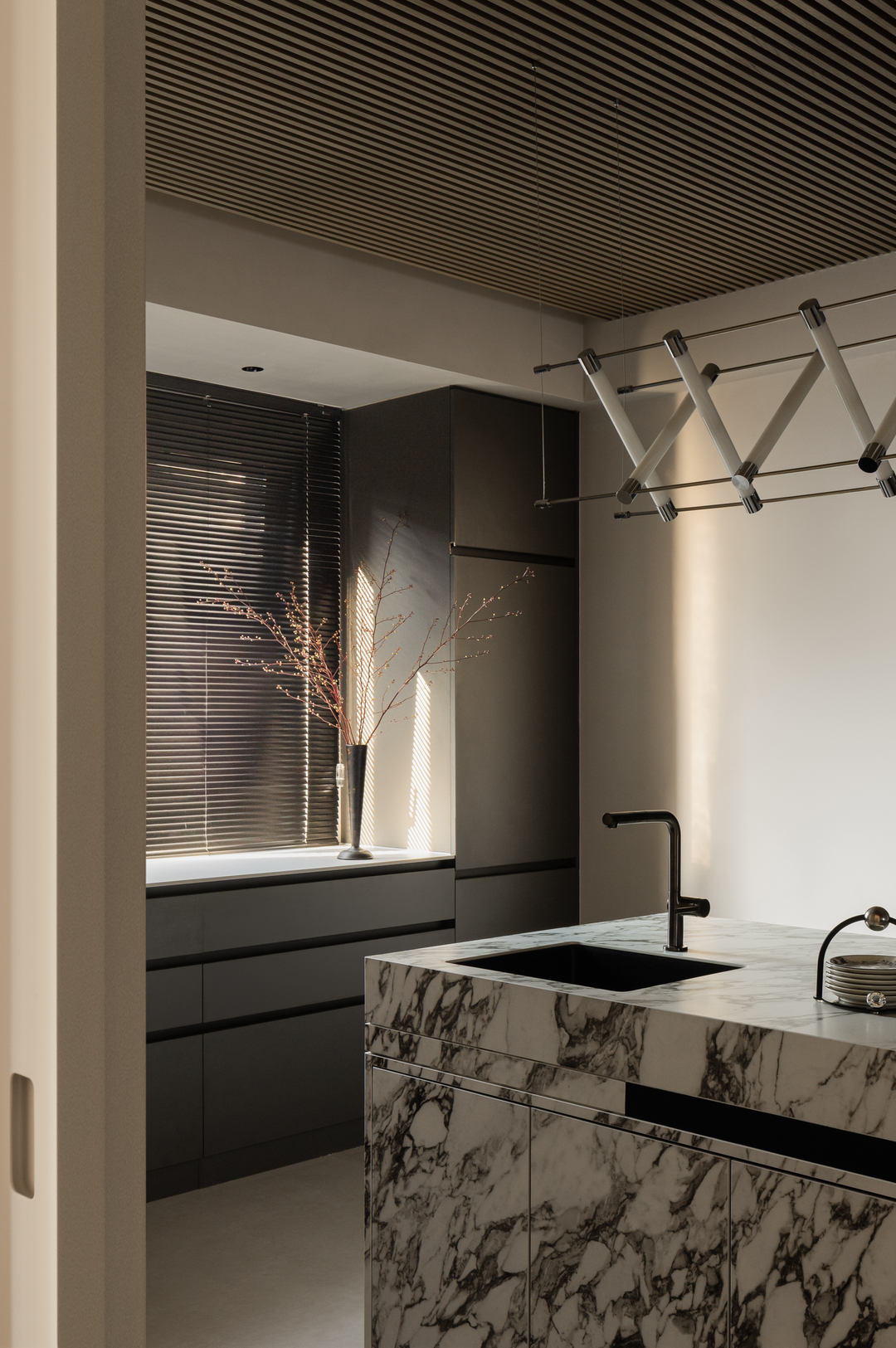 百叶窗把光线裁成细缕,照映出大理石台面的水墨画稿,几何吊灯以金属与玻璃的交织,在头顶织就现代艺术的肌理。