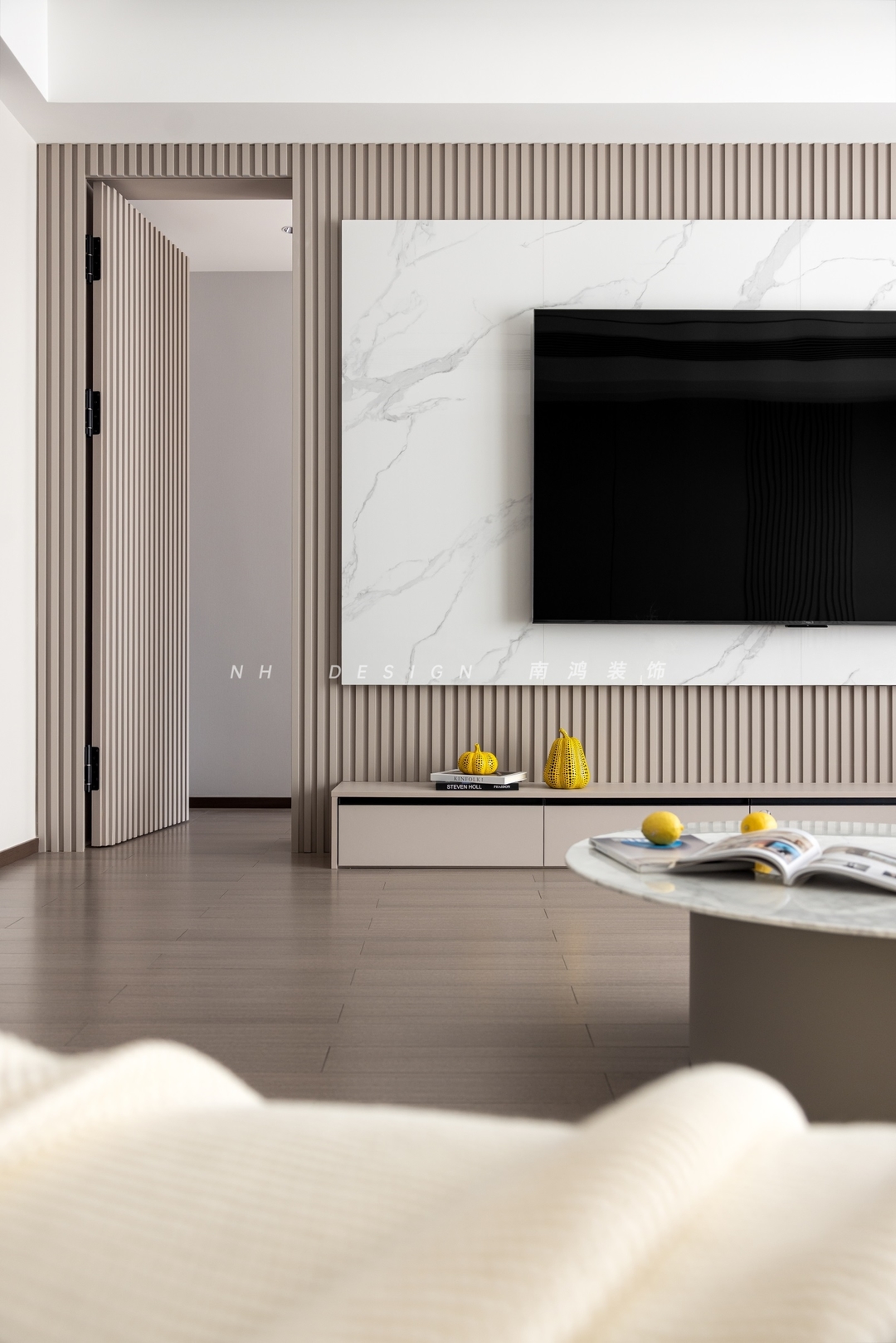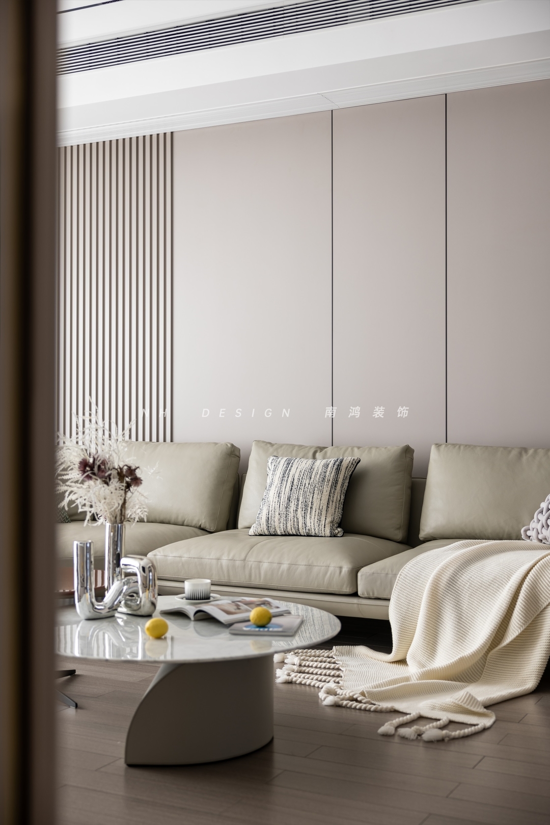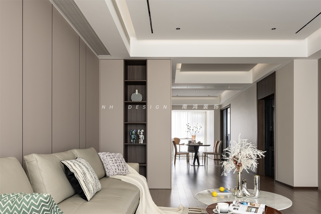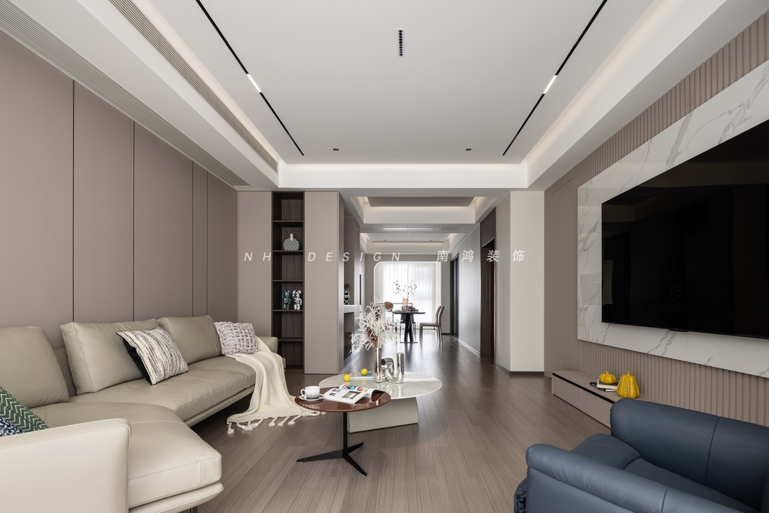 客厅电视、沙发背景墙以体块和线条的艺术设计,让空间层次更显分明。软装陈设亦以低调内敛为要义,米灰色皮艺沙发表现出简约轮廓,强化空间的素雅氛围与现代气质。