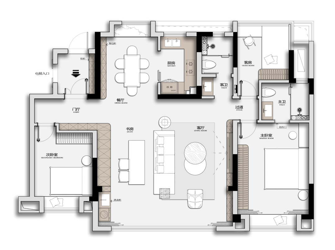 ①客厅与书房区结合做大横厅,并入阳台预留家政区。