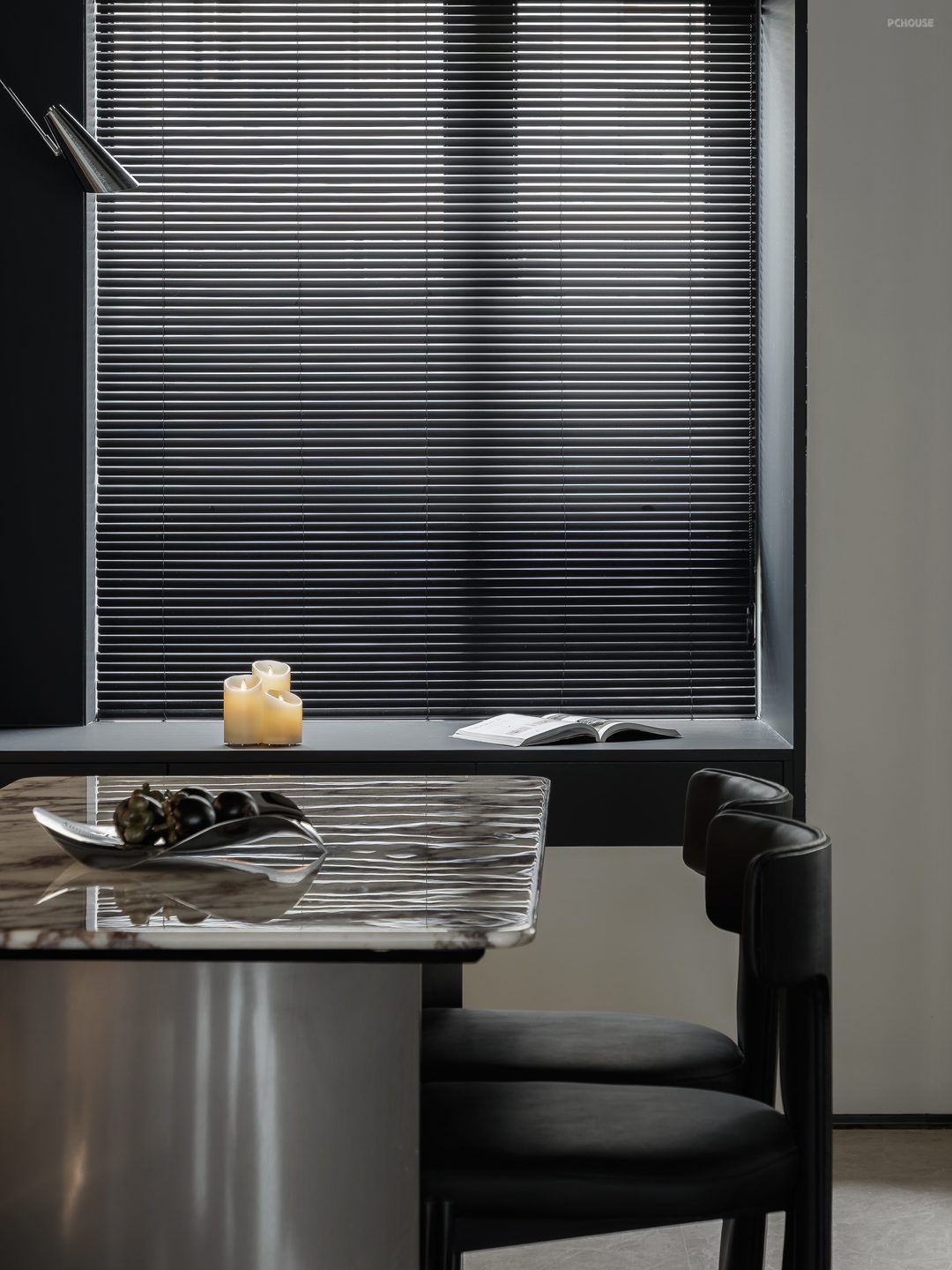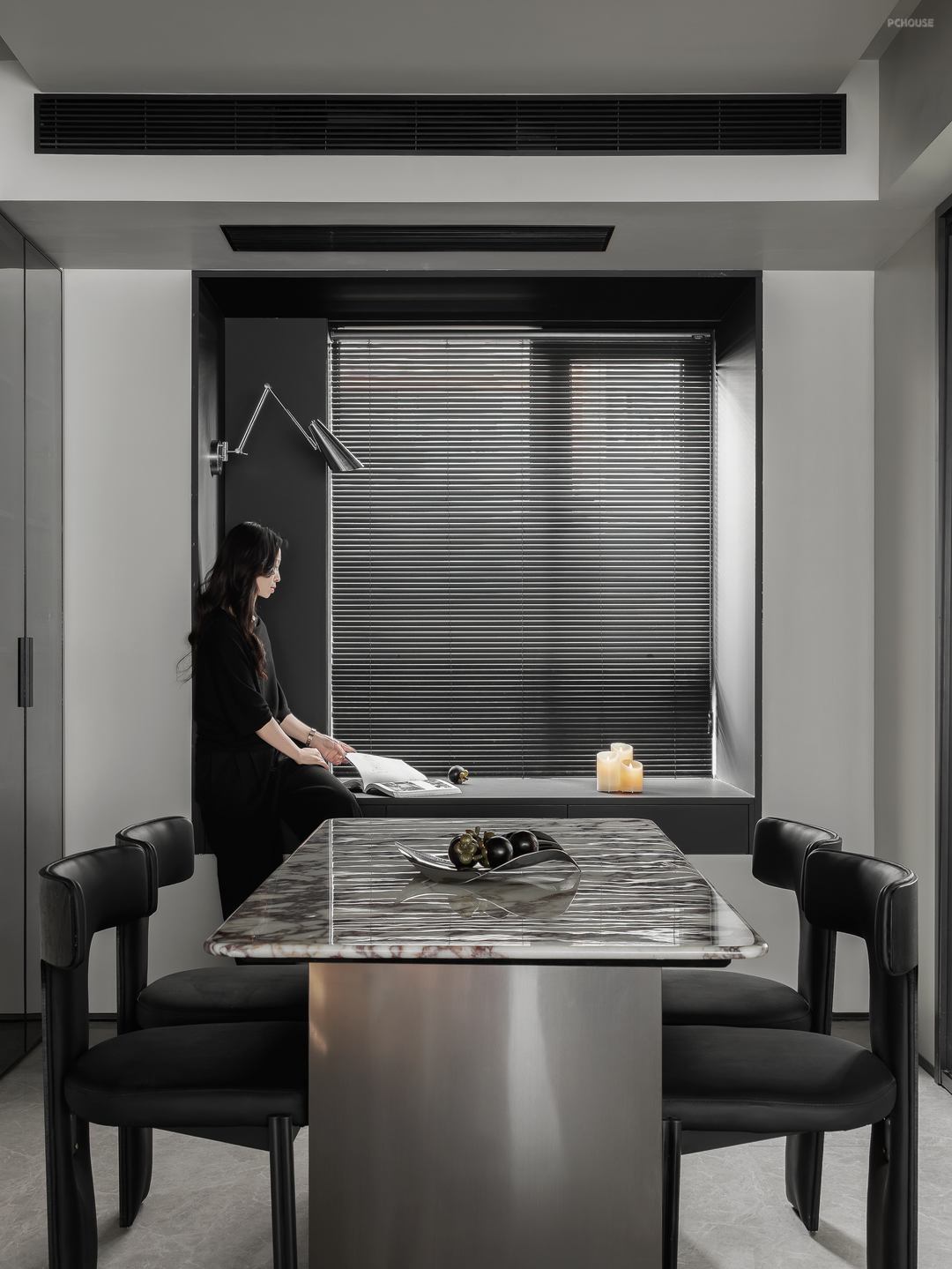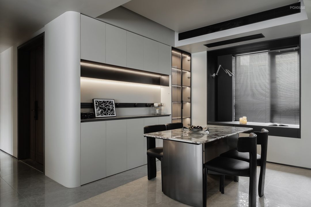 餐厅的飘窗用高级灰木作包制,加高台面增加抽屉收纳,侧面用壁灯点缀,打造休闲角。整面餐边柜的置入,预留操作台面,满足收纳与咖啡角。
