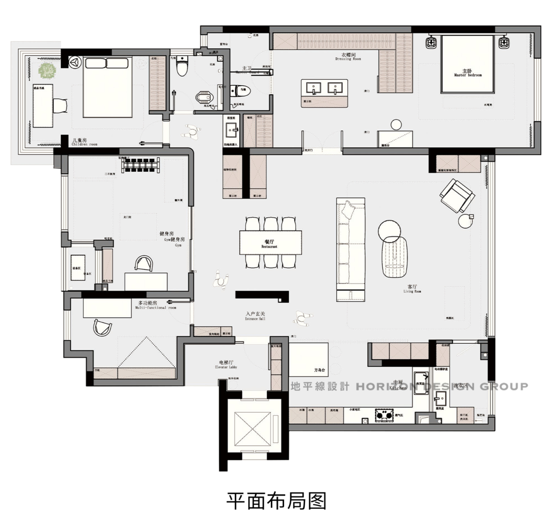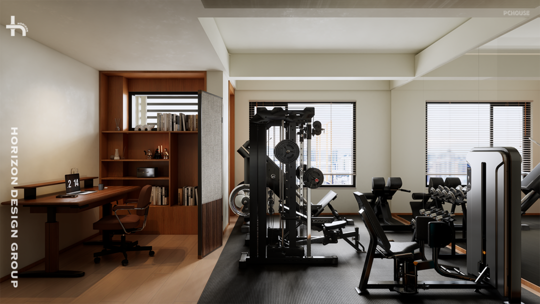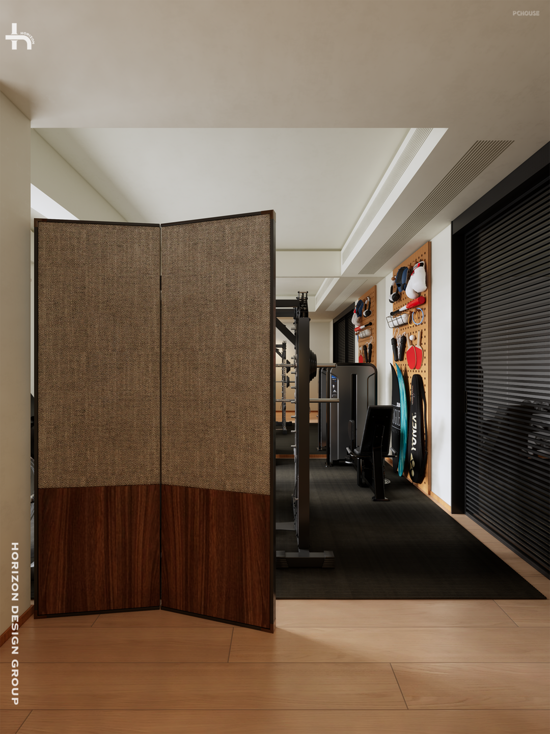 本案的设计核心在于通过大胆的空间动线重组,彻底化解原始狭长户型的局促和割裂。设计团队巧妙释放玄关空间,将书房、健身房整合,儿童房纳入阳台等,从而开辟出一条高效开阔的环形过道。这条灵动的主脉无缝串联起公区与各个房间,消除阻隔,极大提升了空间的通透感。客厅、餐厅各自独立定位且均占据关键枢纽:客厅成为家庭核心,餐厅则激活原过道区域,主卧门洞位移优化内部流线并融入公区背景。
