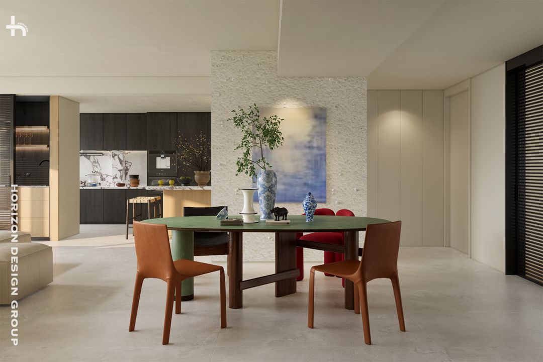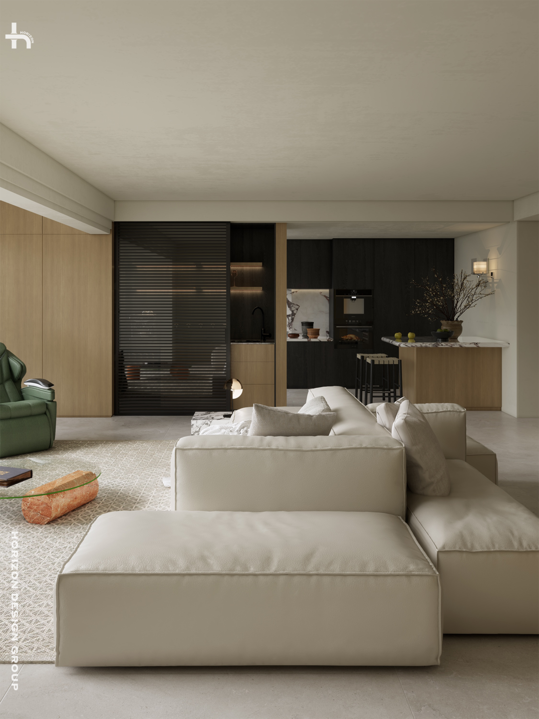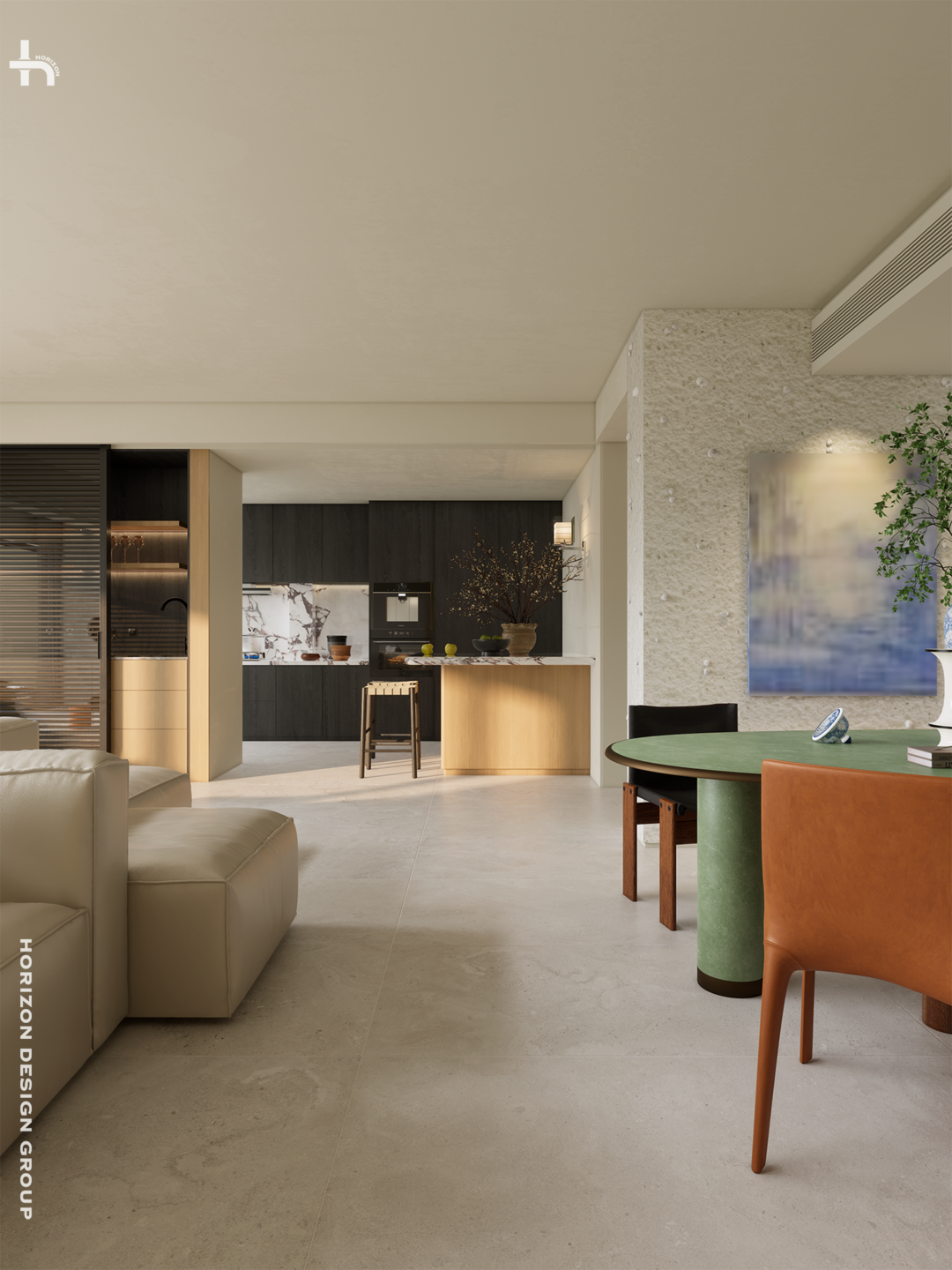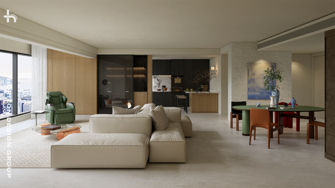 基于「重组动线」的思路,客厅的设计导向也发生根本性的转变。我们打破了以电视为中心的固化布局,取而代之的是,将「社交互动」置于空间设计的核心位置,引入了具有高度灵活性的多向模块化沙发,营造一个聚拢式、互动性的空间氛围,使其名副其实地成为家的「枢纽」。