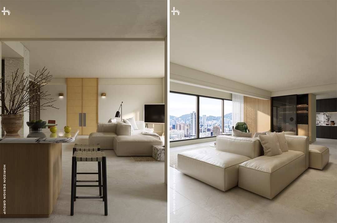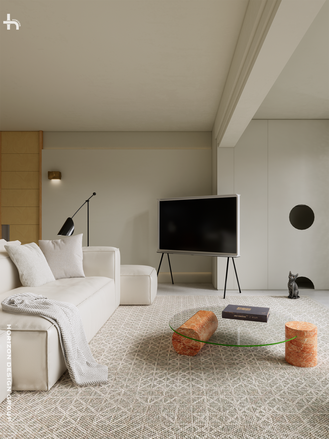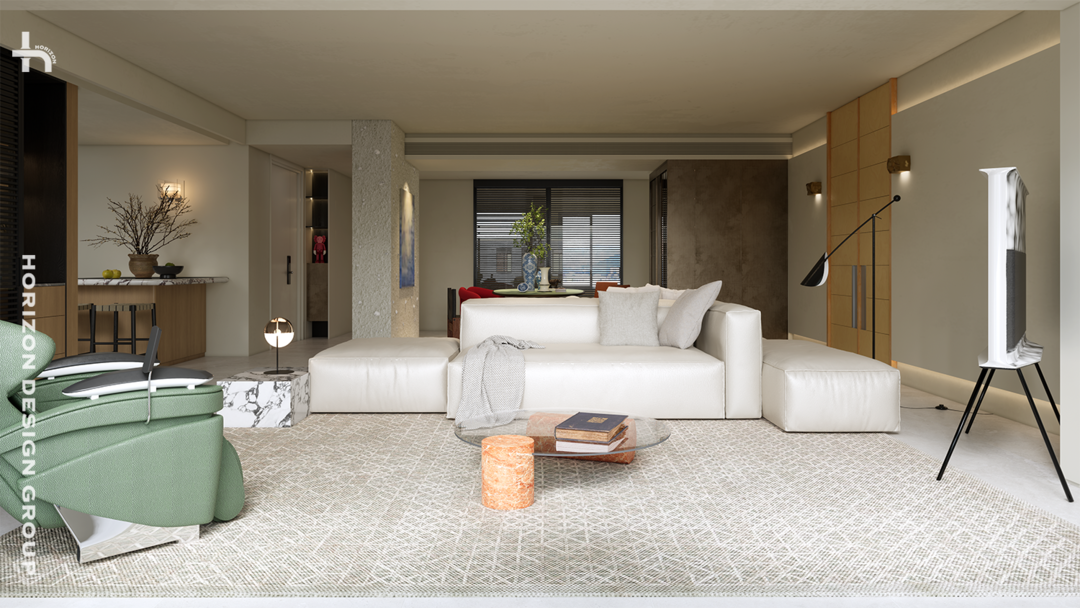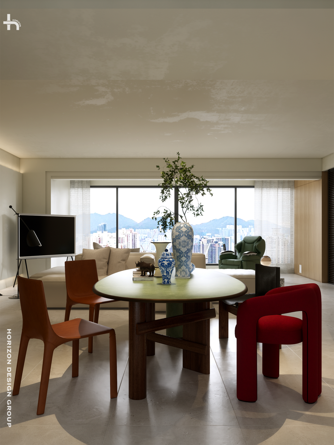 基于「重组动线」的思路,客厅的设计导向也发生根本性的转变。我们打破了以电视为中心的固化布局,取而代之的是,将「社交互动」置于空间设计的核心位置,引入了具有高度灵活性的多向模块化沙发,营造一个聚拢式、互动性的空间氛围,使其名副其实地成为家的「枢纽」。