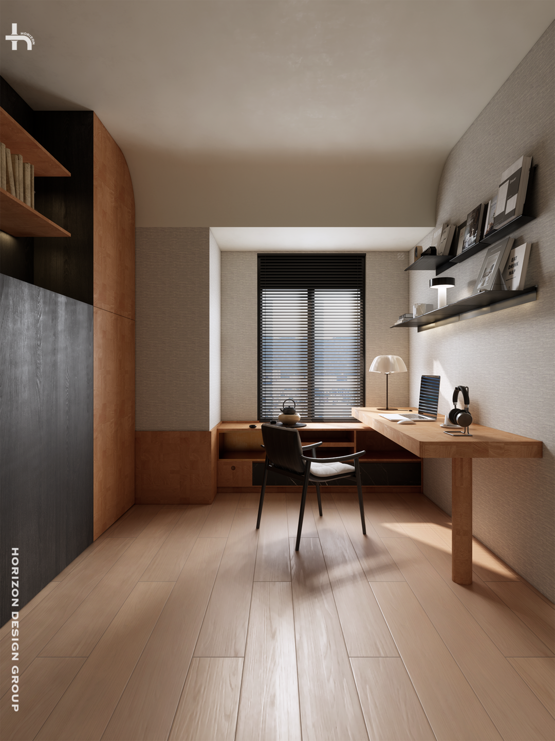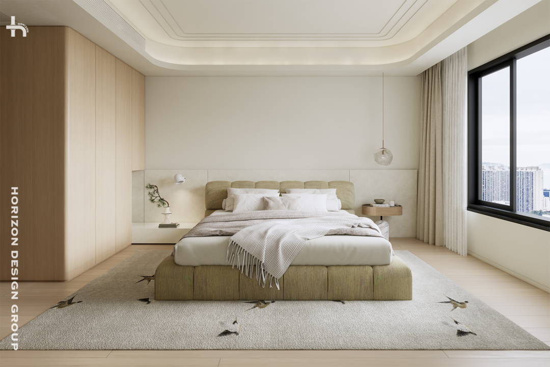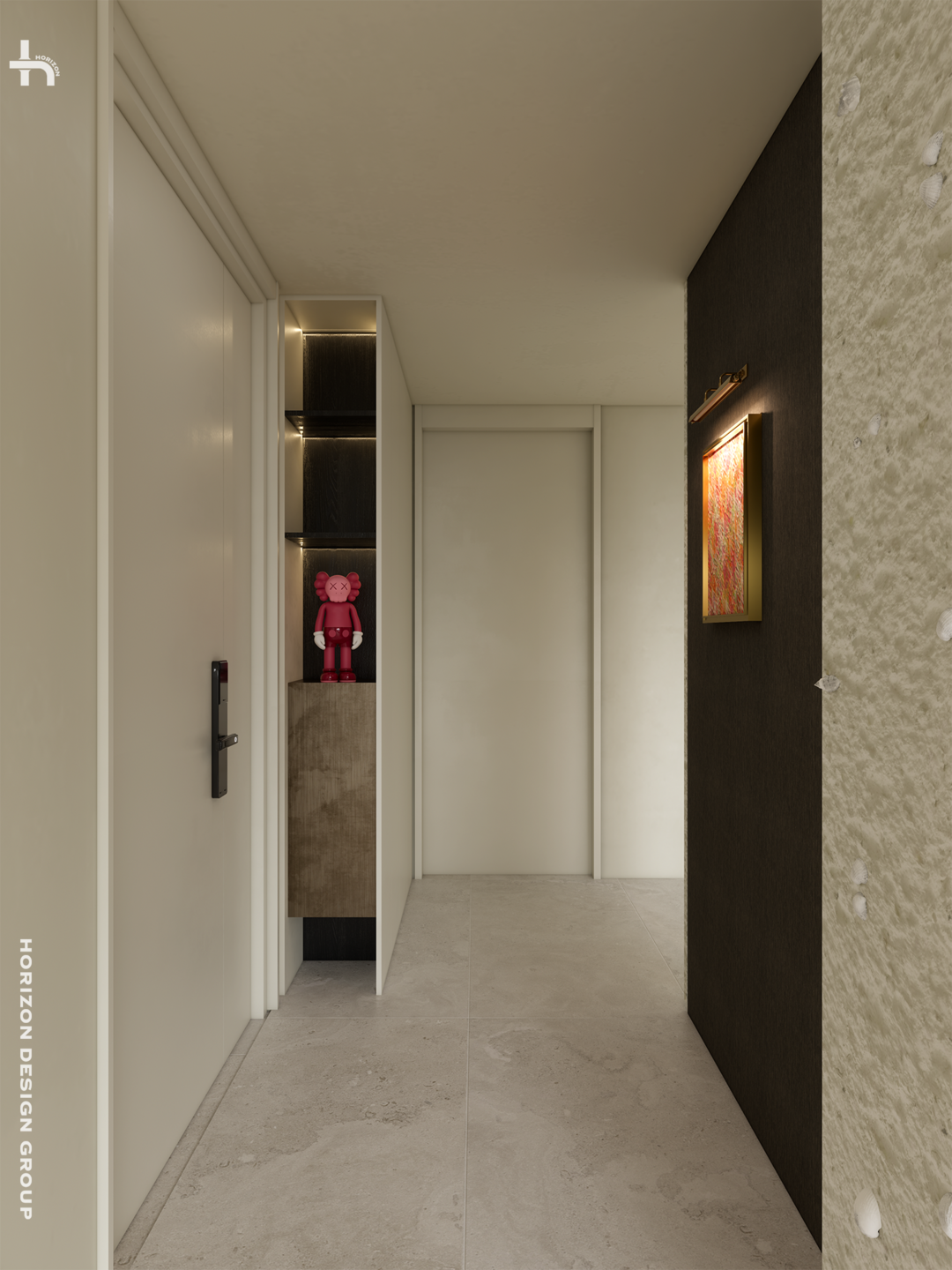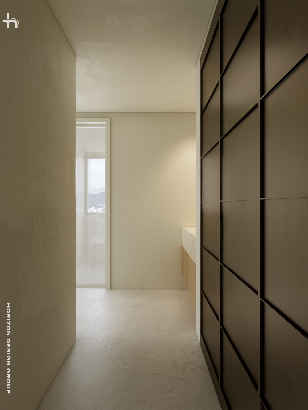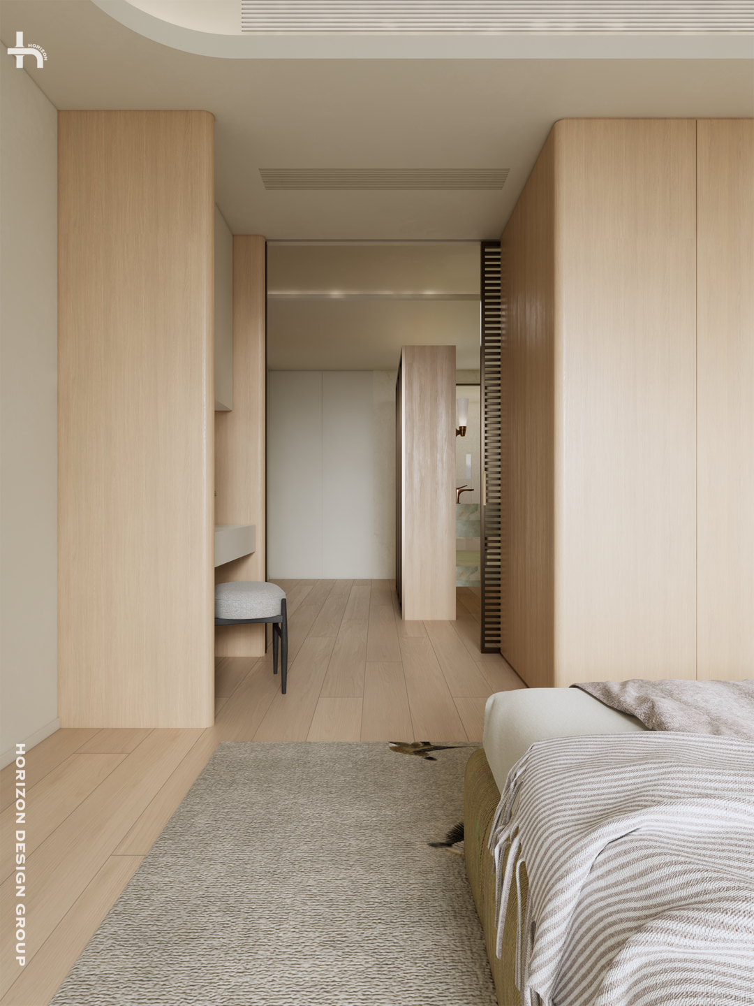 在整体的视觉语言上,以宁静、克制的极简主义为基调。大面积墙面与顶面采用质感统一、色调柔和的艺术漆,予以空间纯净背景。为了中和极简的冷感并注入温暖与自然的气息,立面融入些许原木材质元素,比如水吧台、主卧双开门等。