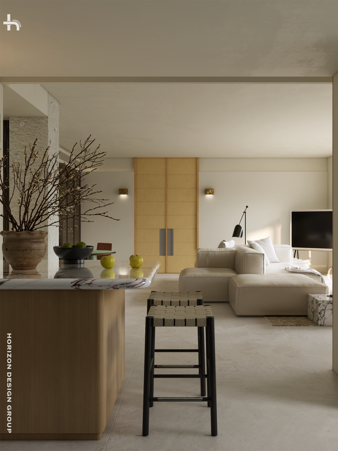 得益于厨房的宽敞尺度,设计师沿墙构筑了一个方形岛台,更无意间塑造了一处绝佳的观景视角,可将整个客厅的舒展气度尽收眼底,视线顺势延伸,最终落定于精心位移后正对岛台的主卧双开门。两者皆以温润的原木本色呈现,在材质与色调上形成跨越空间的默契唱和,一近一远,构筑起一条充满韵律的视觉轴线。