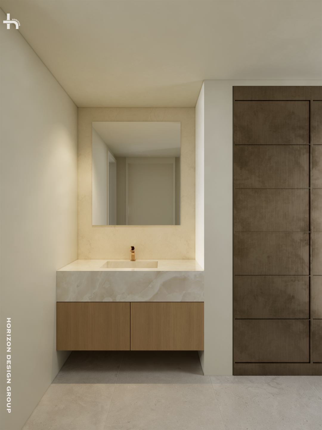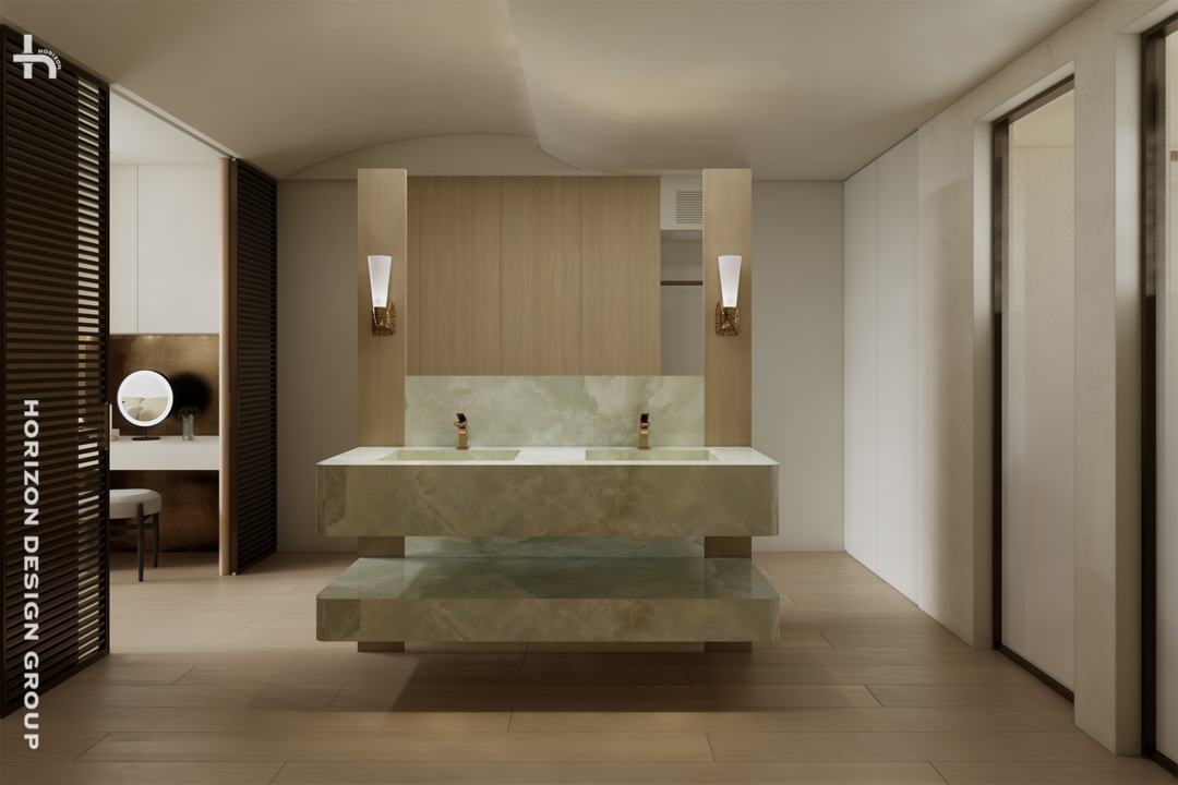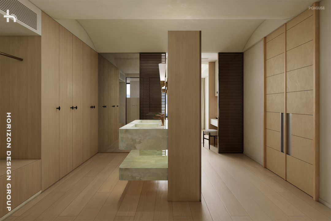双开门开启的瞬间,你能感受空间重组与洄游动线的设计理念正在延续。一方回形衣物收纳区域,中央则以天然大理石打造超大洗手台,独特的肌理和色彩,成为空间中不容忽视的艺术注脚。