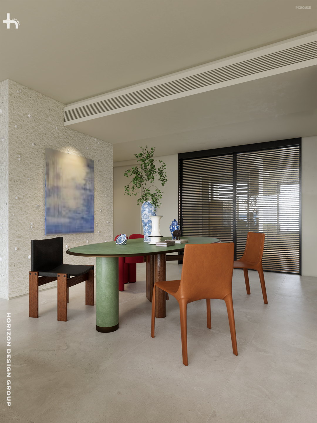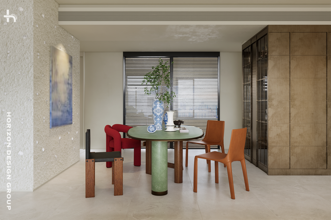 在保持整体视觉简洁高级的同时,通过小体量、色彩明快的家具、挂画进行点缀。这些充满活力的多巴胺色系小件(黄棕、靛蓝、草绿),如同跳动的音符,瞬间激活空间情绪,创造出了趣味的层次。