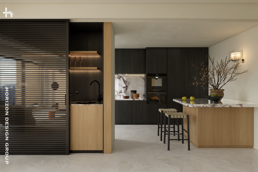 格栅滑门系统如同一道灵动的屏风,双向联动,实现了厨房及水吧台两个功能区域开合状态的优雅切换。