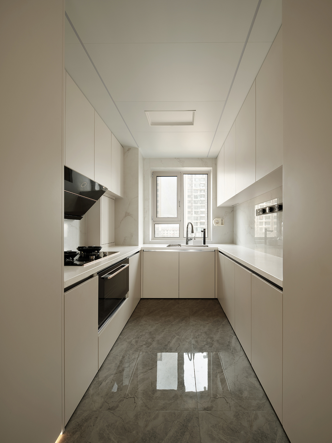 开放式厨房采用一字型动线,石英石台面与哑光柜门形成质感碰撞