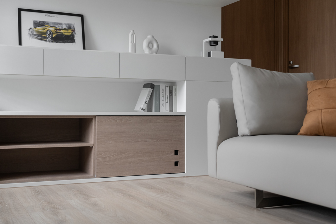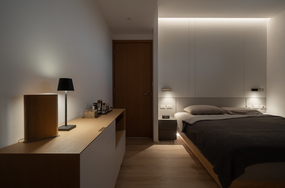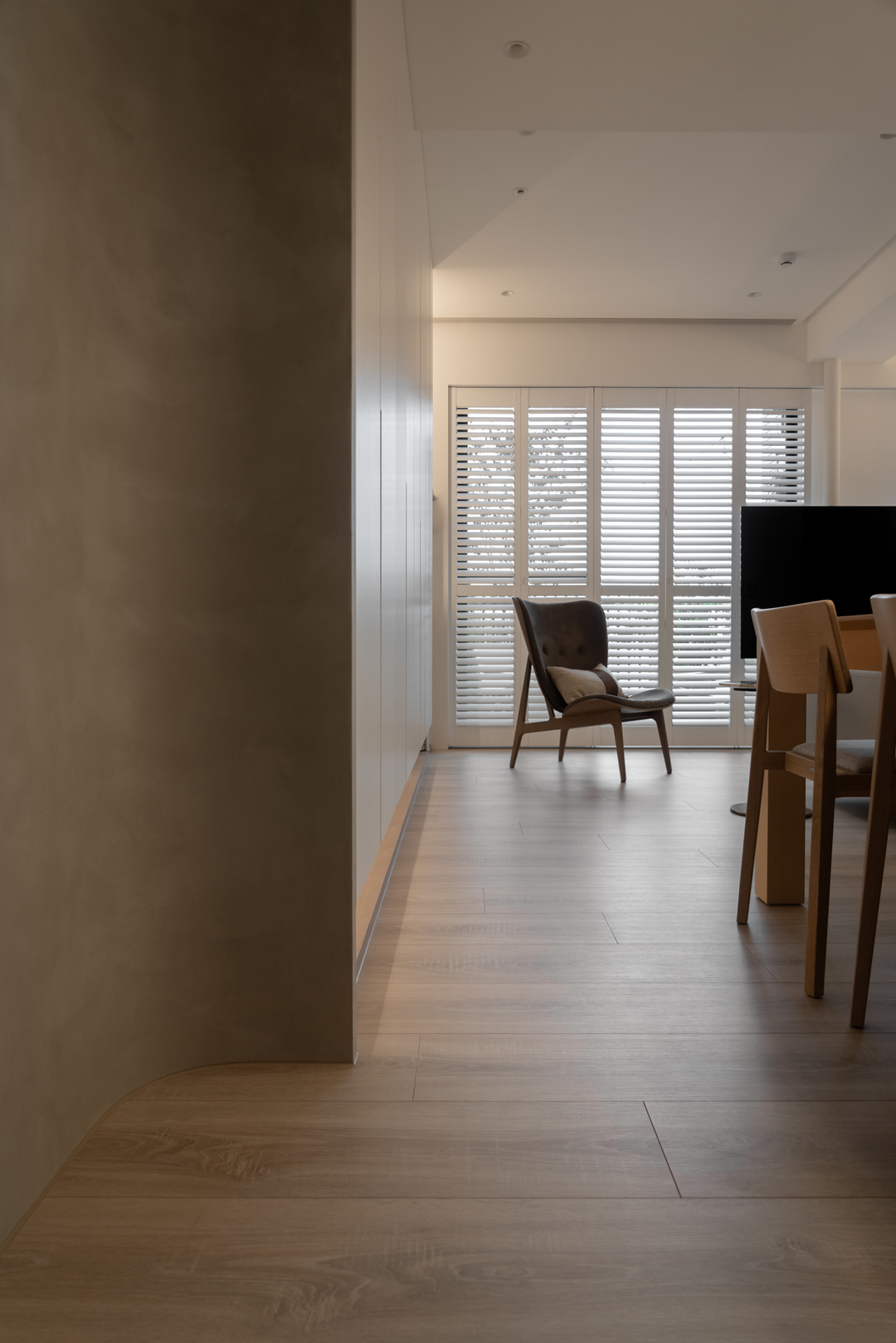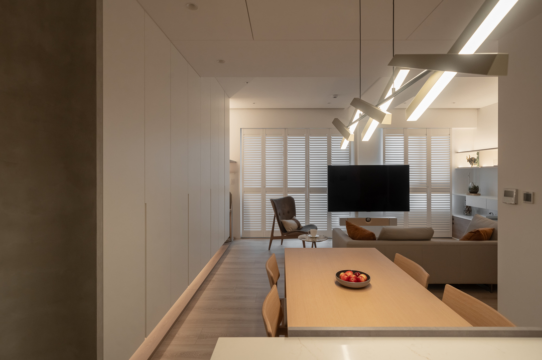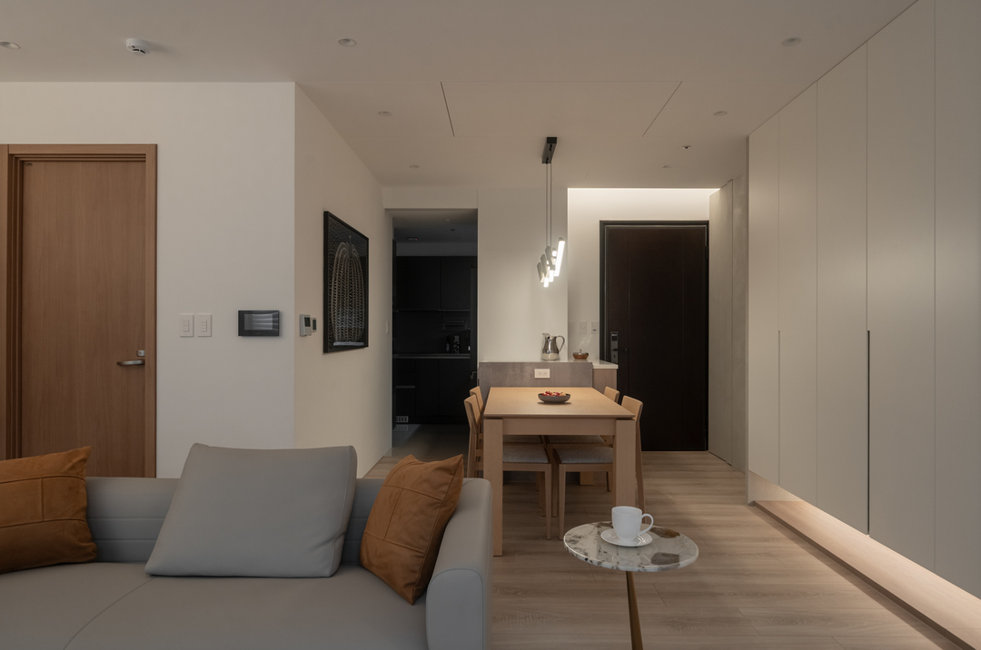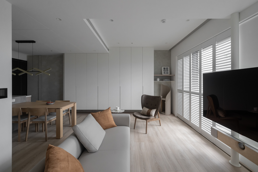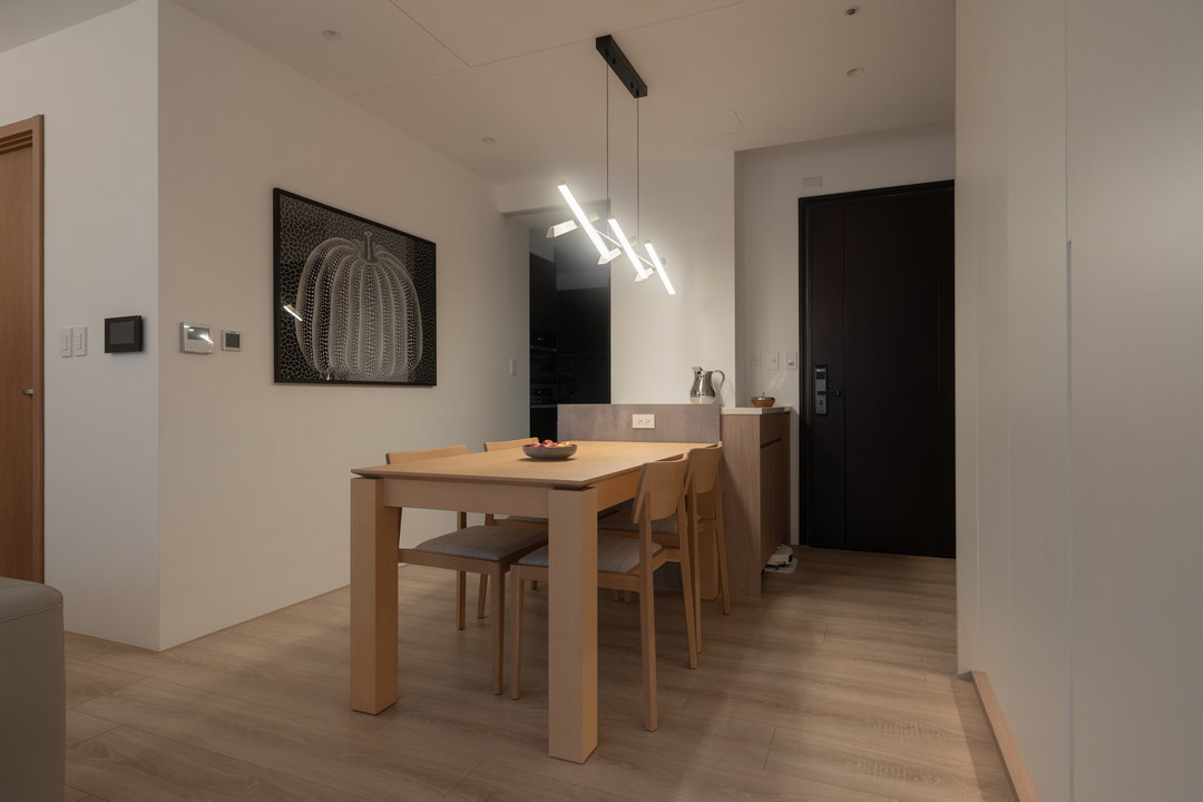 从玄关延伸至公领域,立面以连续门板整合收纳,消弭界线,使空间维持纯粹与秩序。