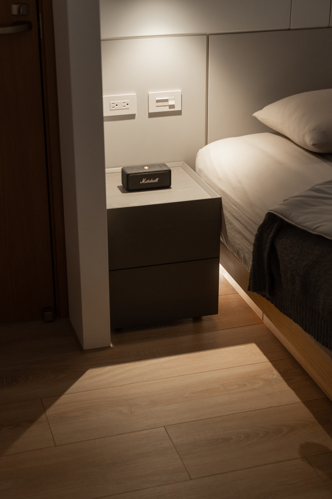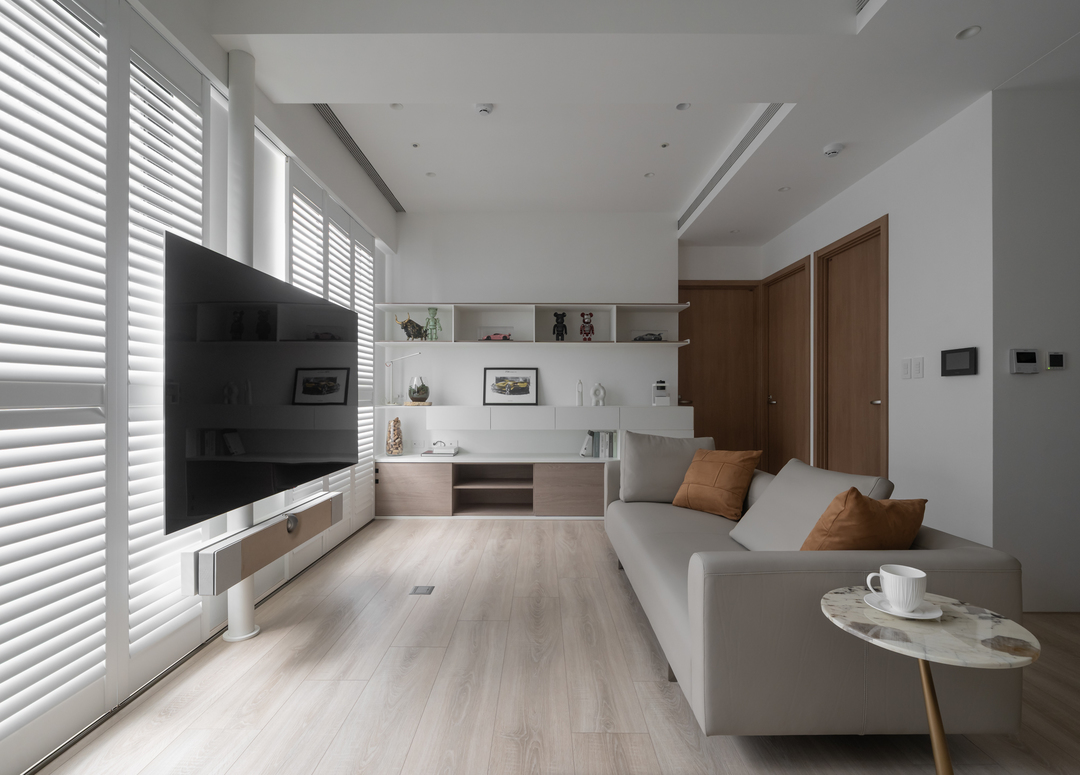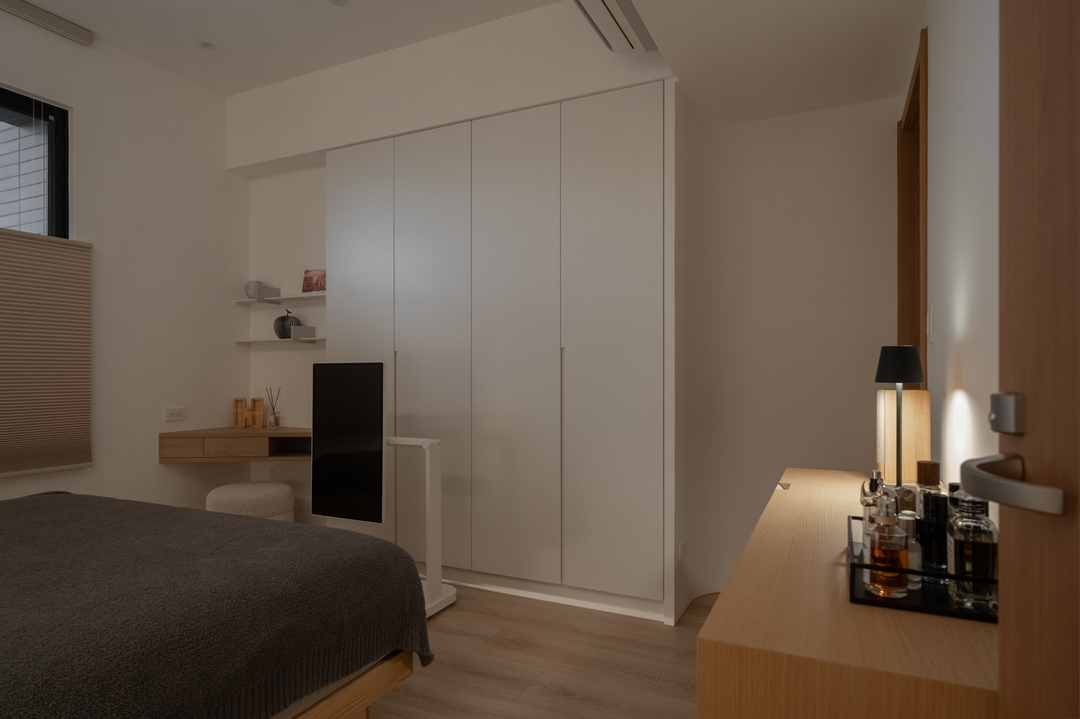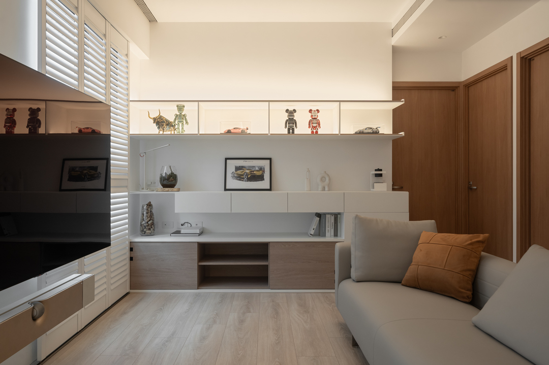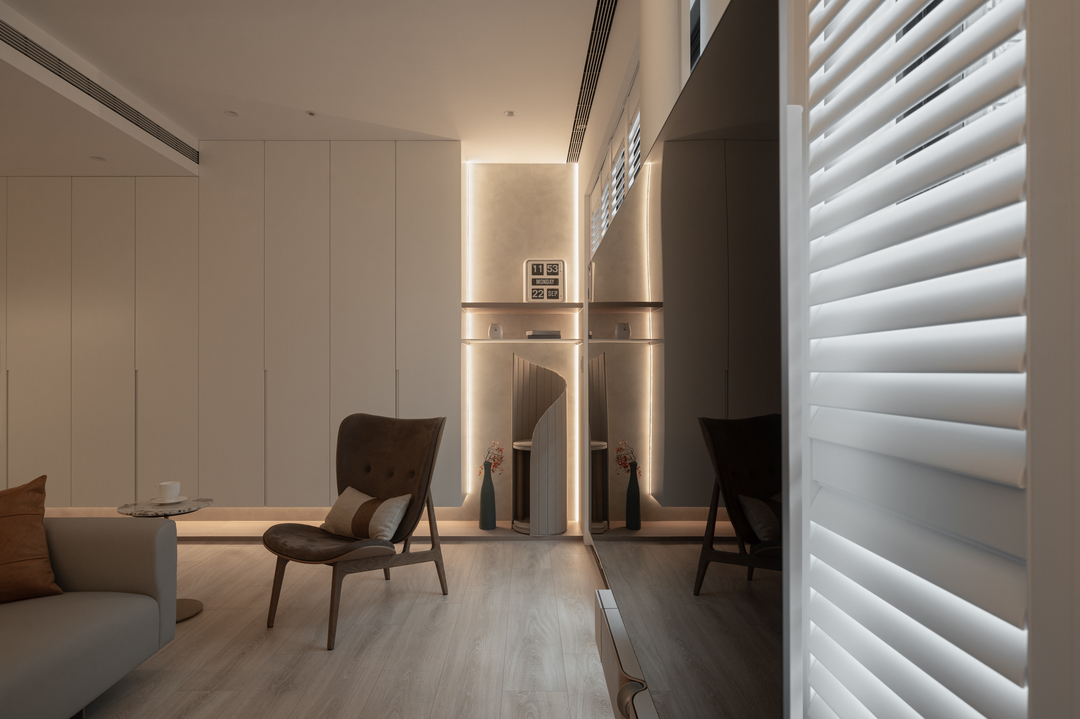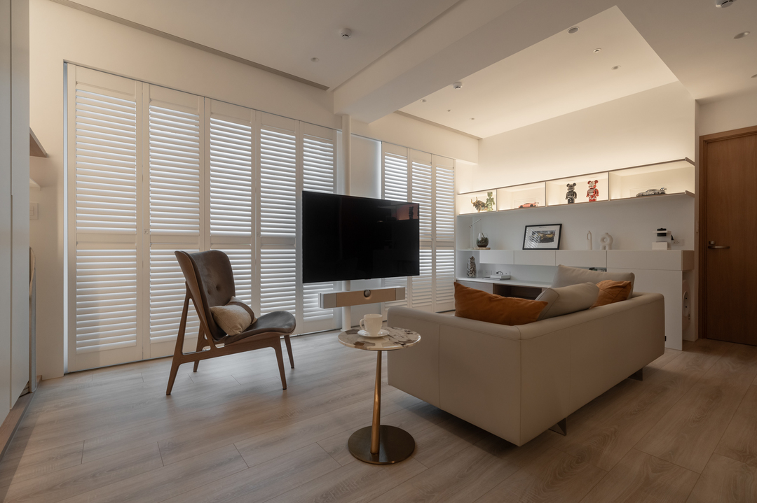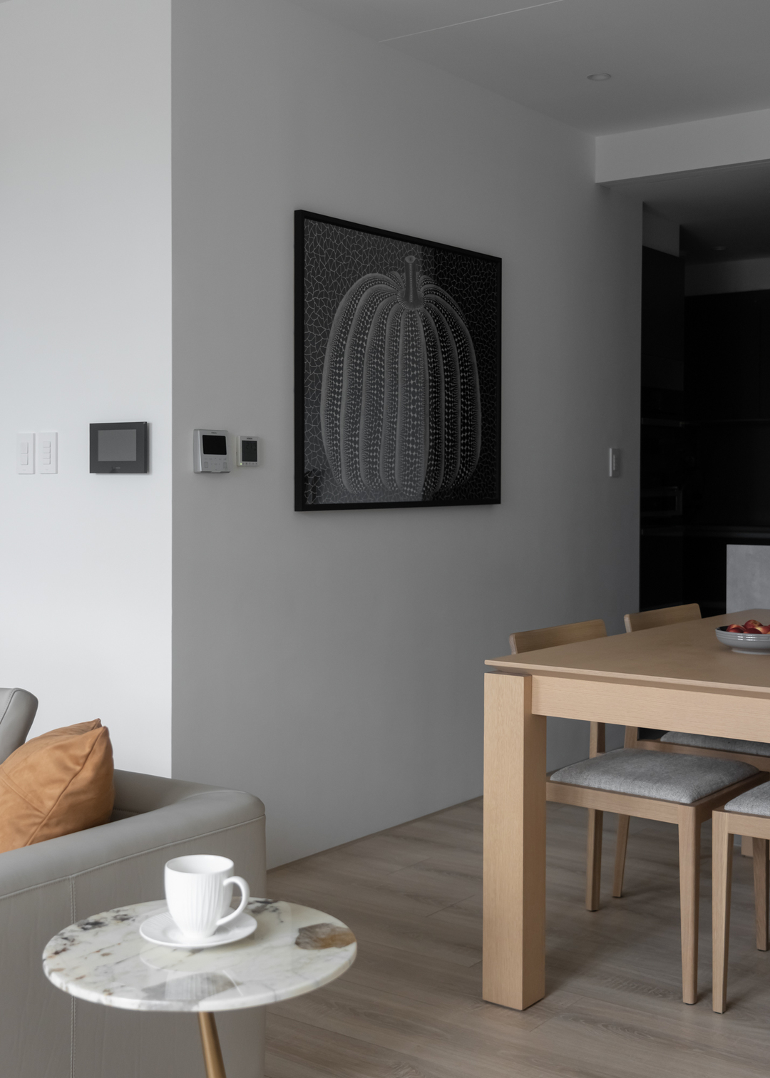 从玄关延伸至公领域,立面以连续门板整合收纳,消弭界线,使空间维持纯粹与秩序。