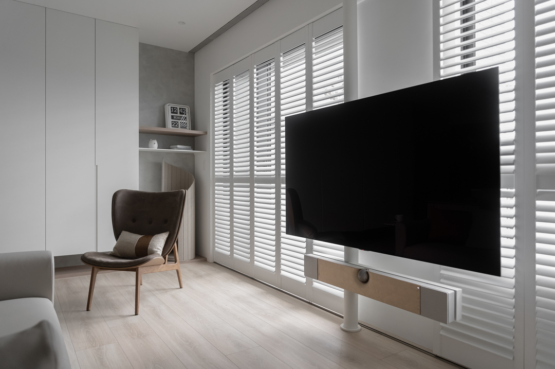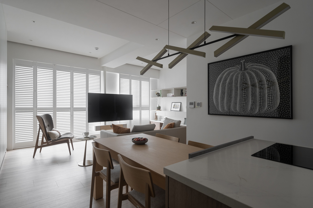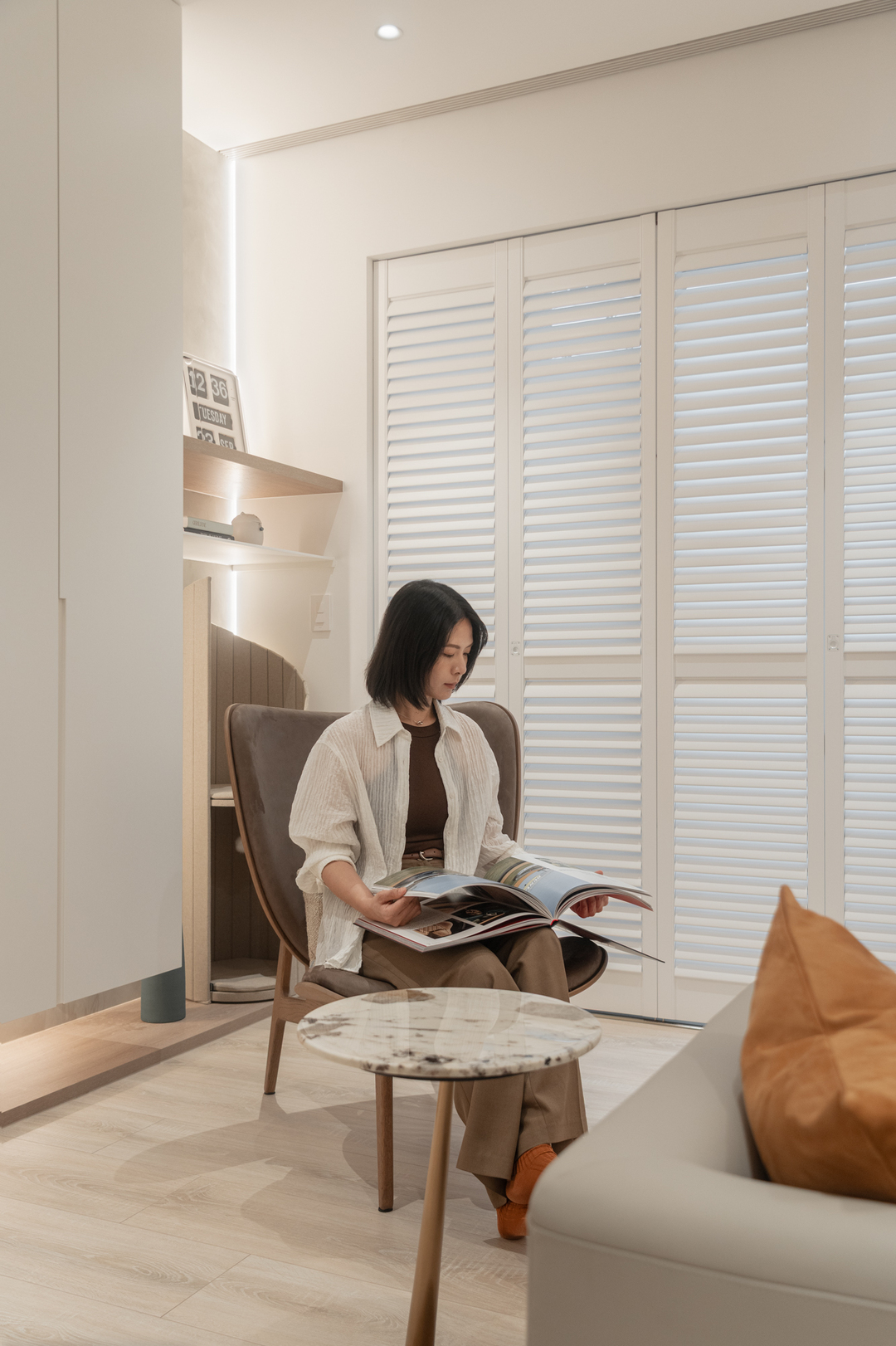 当人坐在沙发上,视线横向展开,左右两侧的延伸感随之放大,使公领域呈现出开阔而平衡的张力,也透过这样的改向,重新定义了生活的轴线。
