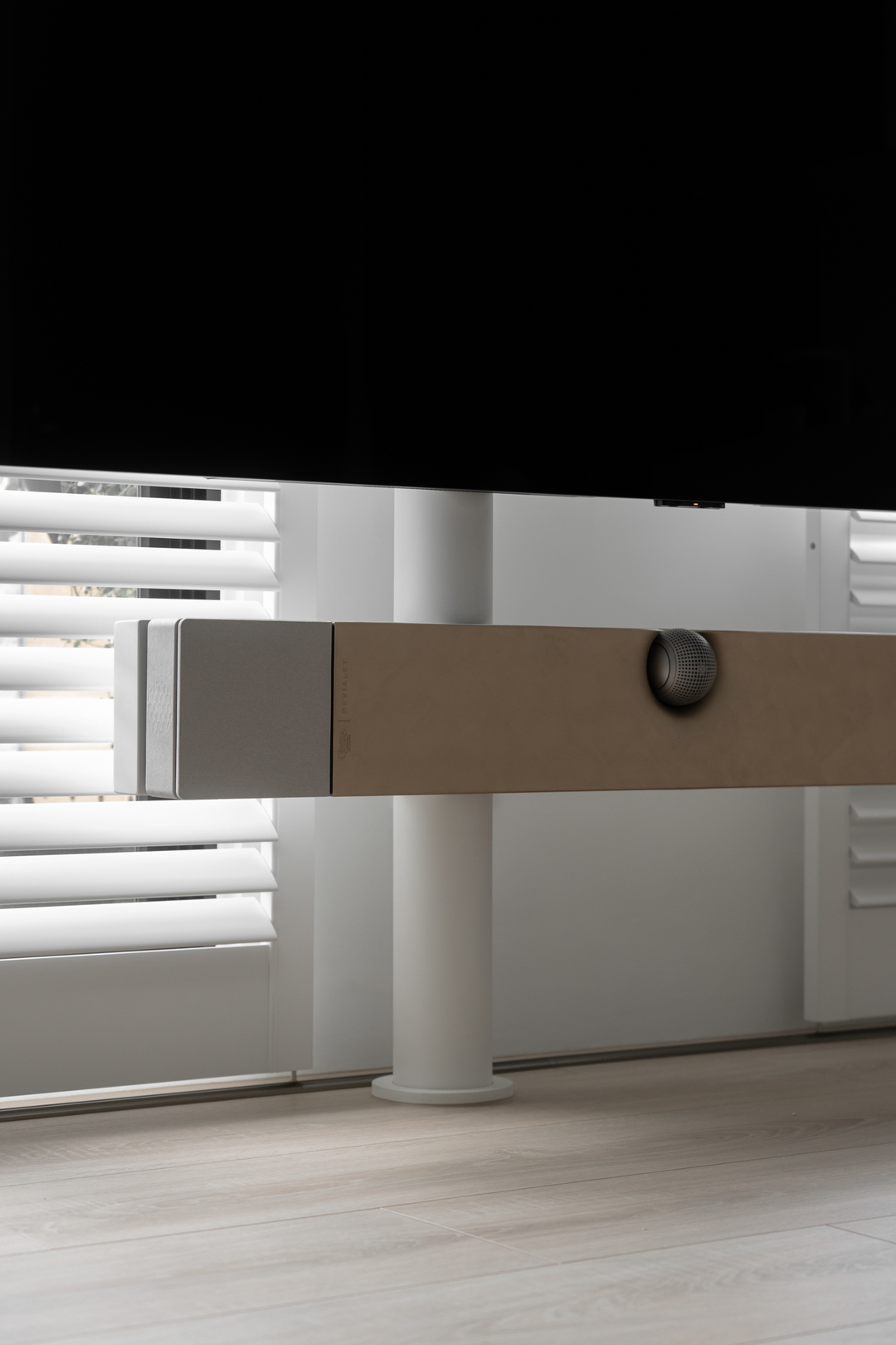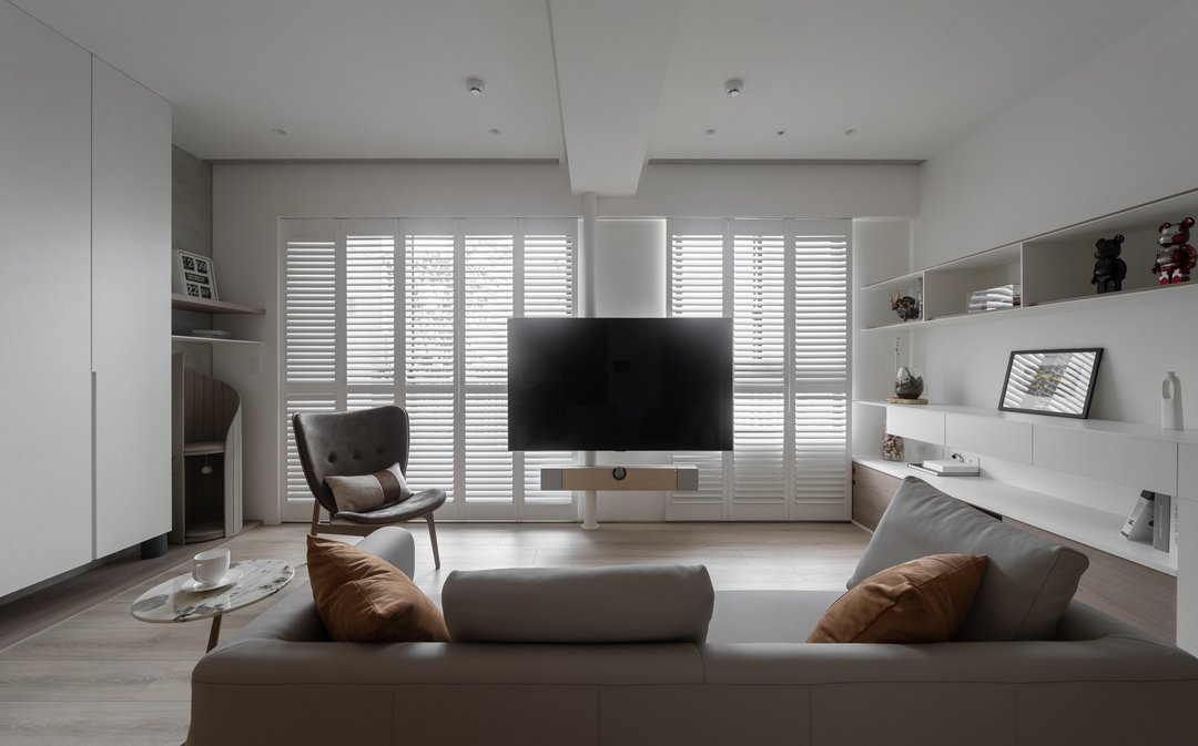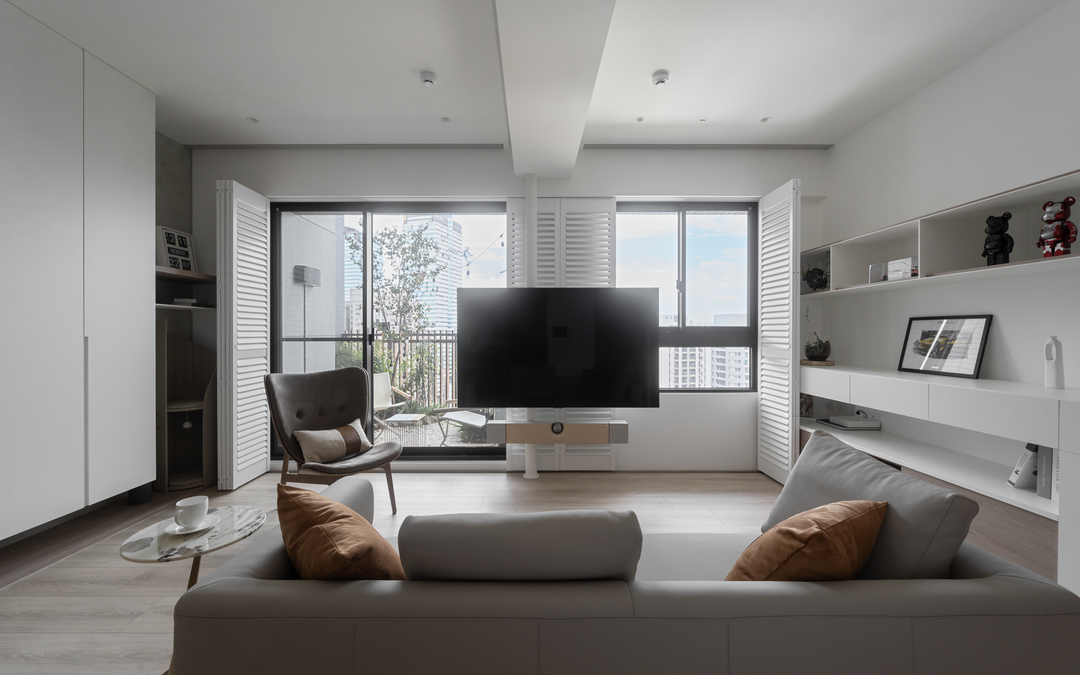 客厅的沙发与电视墙整体布局旋转改向,将电视以悬浮立架形式呈现,设于两扇窗之间的墙面上。