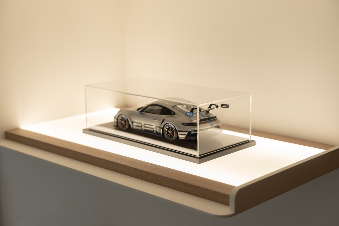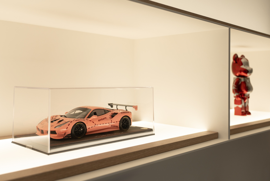 可收折的木百叶与错落的展示层板,共同构筑空间的光影层次。