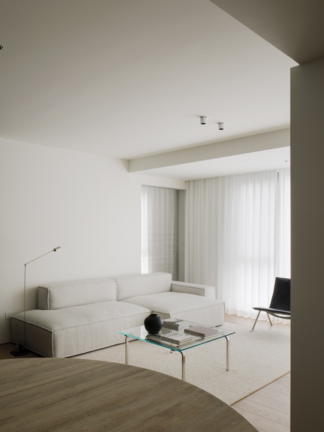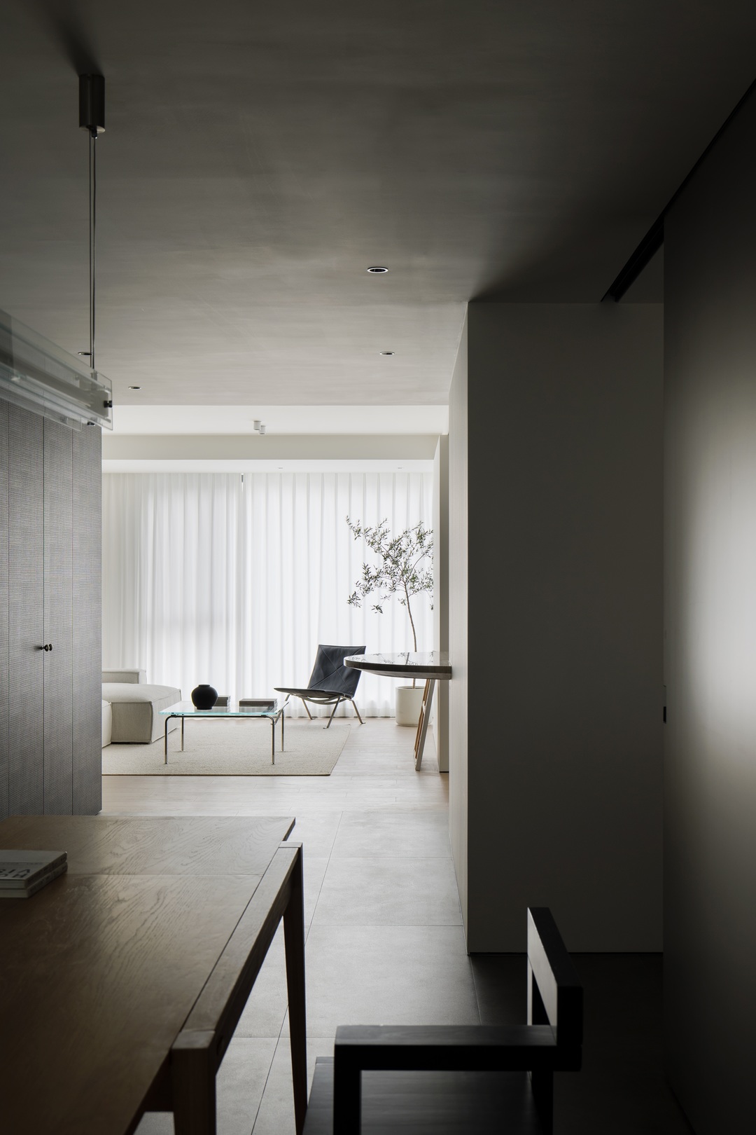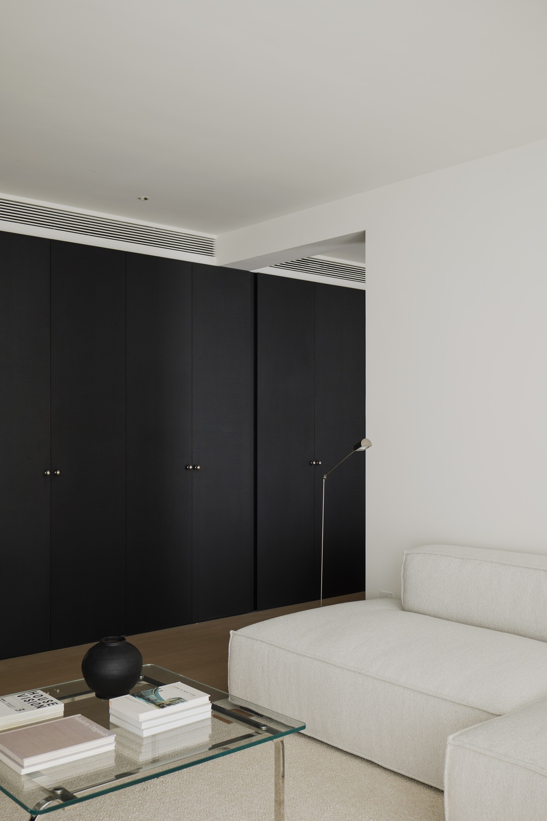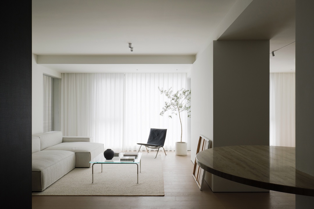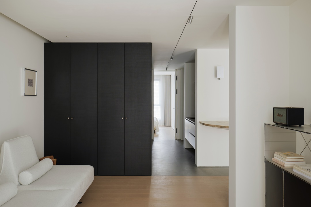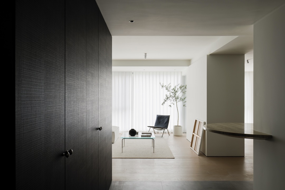 从入户开始,一处 L 型盒体成为空间收纳的 “纽带”,将入户、客厅到卧室的储物需求无缝整合,让各区域收纳既独立又连贯。