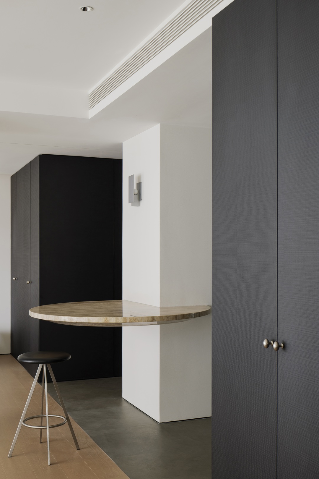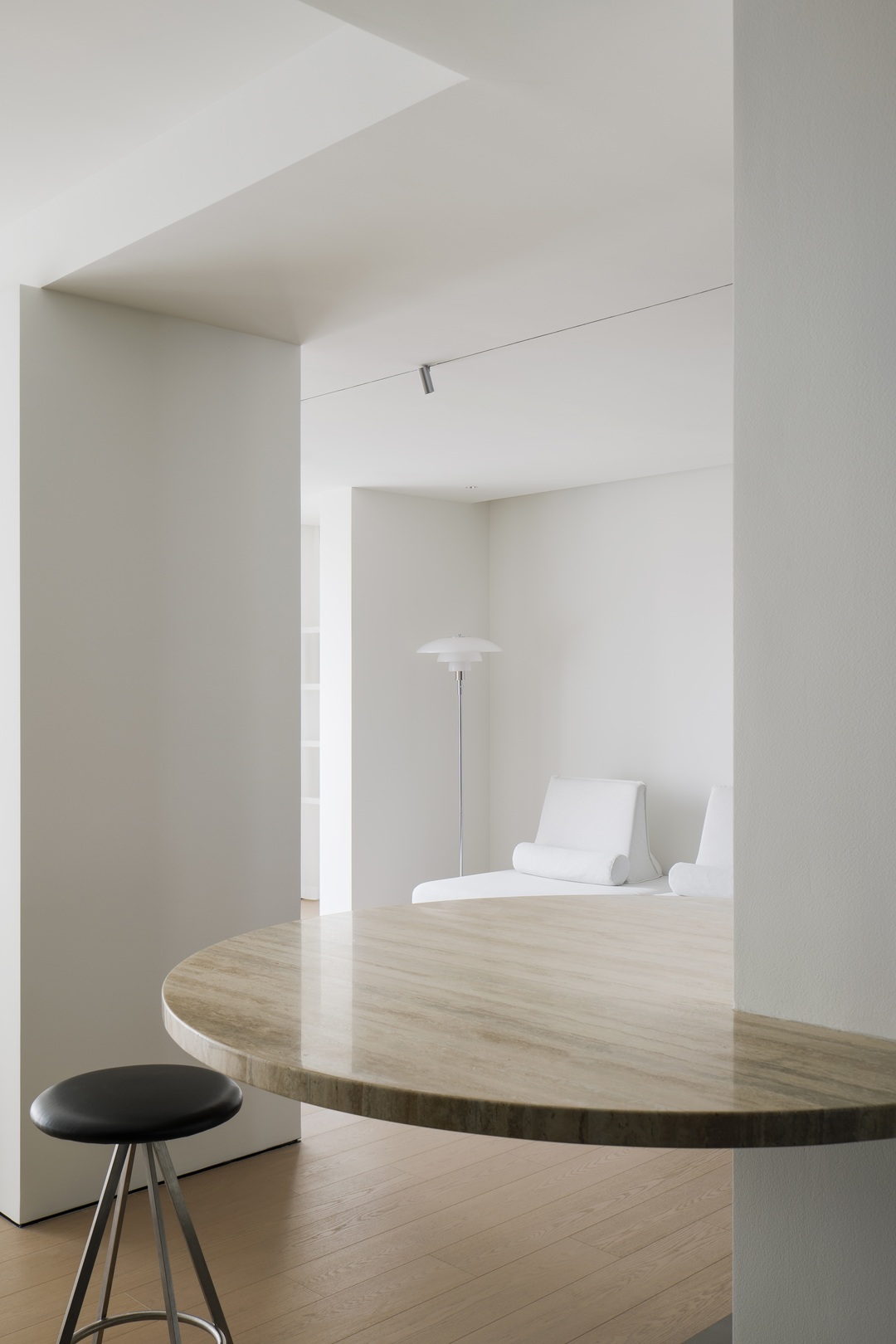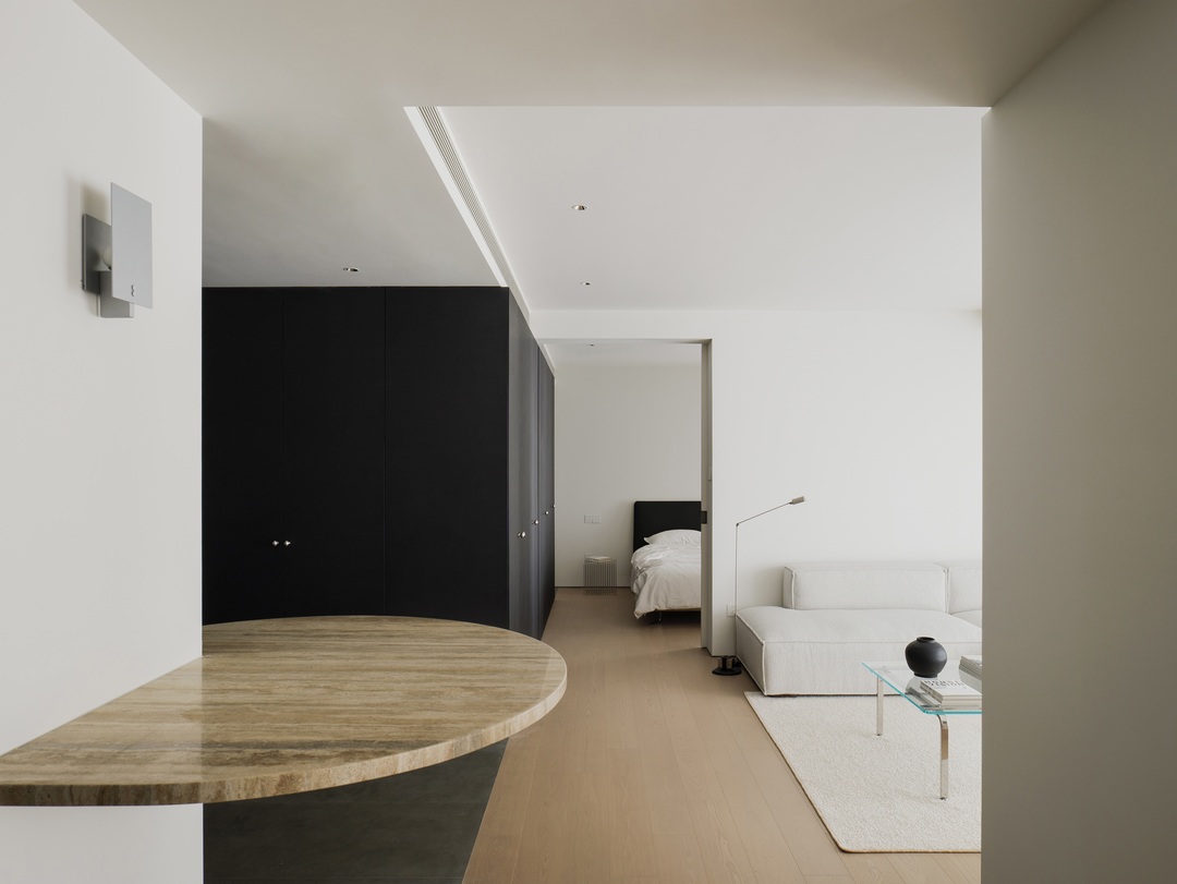 岛台跟着空间动线做了流畅转折,材质用了洞石,天然的纹路和小孔能留下特别的触觉感受。哑光表面能柔化光线,弧形边角也让近距离使用更安全舒适。