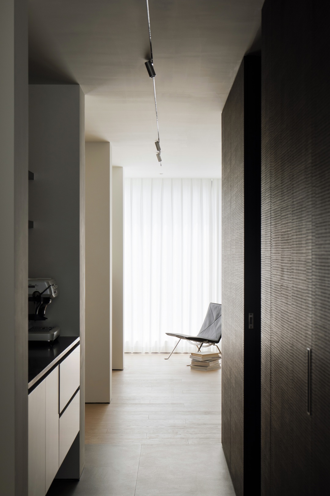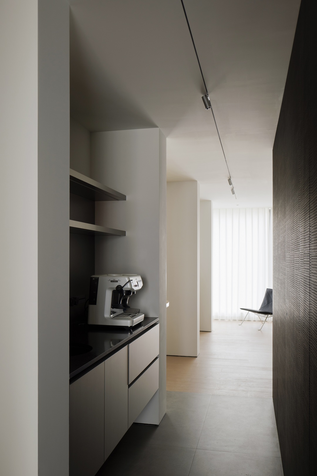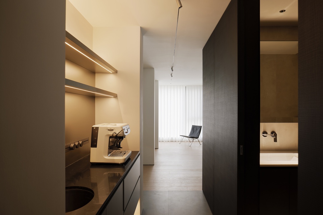 从岛台转折过渡至水吧台,核心围绕功能整合展开:一方面为屋主留出了制作咖啡、放松休憩的区域,另一方面也通过设计增加了收纳,让空间利用更高效。