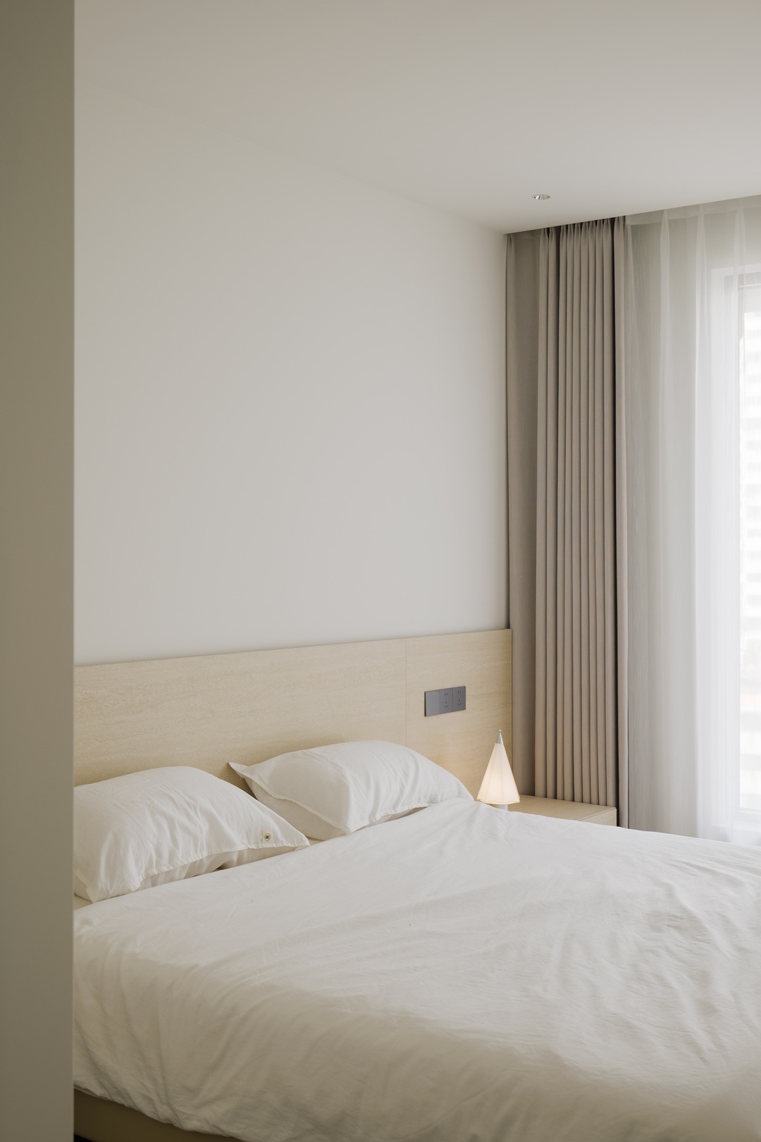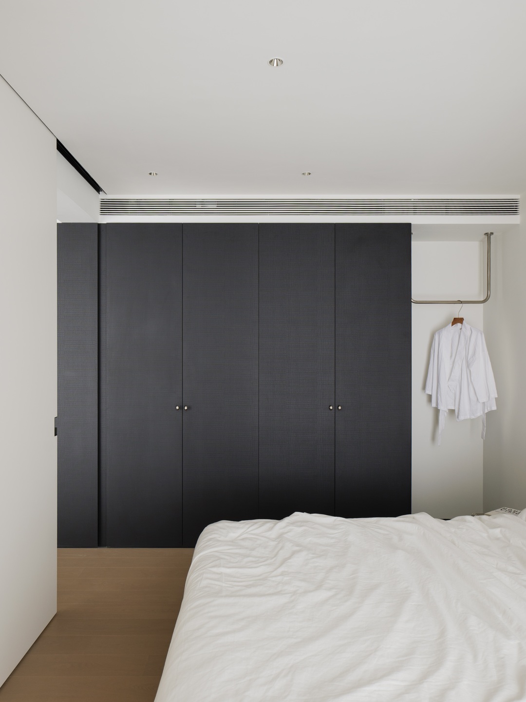 从客厅到卧室的空间动线中,除了延续柜体收纳的规整设计,还特意增设一处开放式挂衣区,让衣物拿取无需翻找,随手可得间更显便捷。