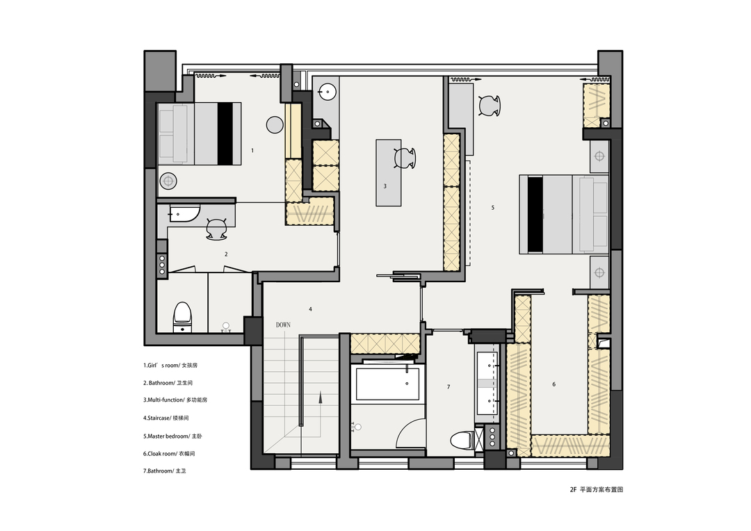 6.二楼布局放大了主卧在整体的比例,以套房的形式增设了衣帽间与主卫,增加了收纳空间与酒店式卫浴体验。