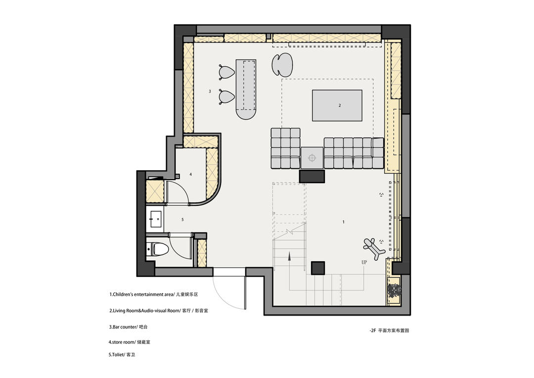 2.负二楼作为日常主要的会客区域,增加地下室的使用频率,且离车库最近,方便朋友拜访时先来到此空间进行招待。