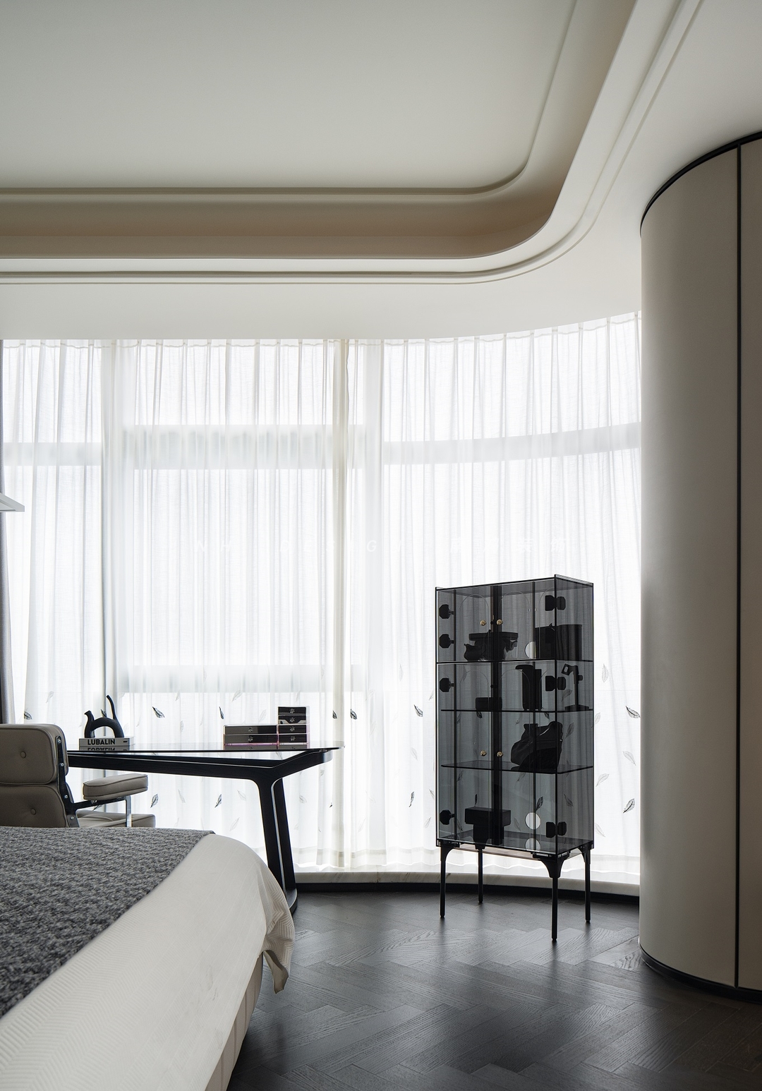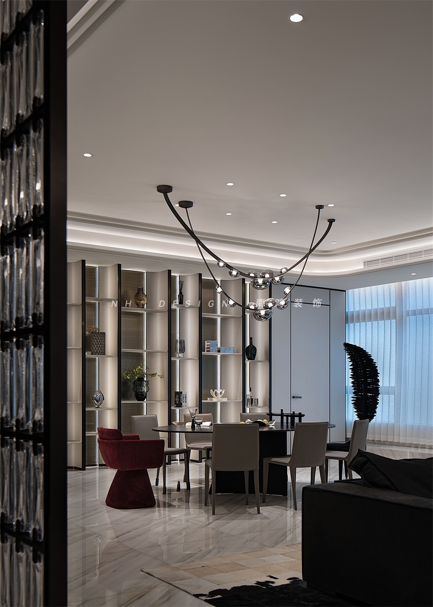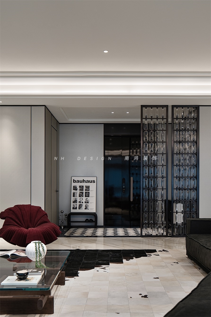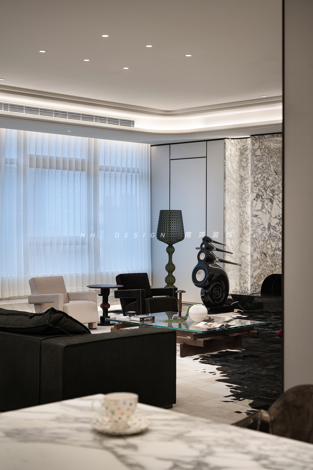 入户,一首摩登现代的都市序曲旋即奏响。大平层的开阔视野,借由镂空玻璃隔断巧妙过渡,界定区域的同时维持住了空间的流动感,继而透过若隐若现的视觉延伸,加之黑色线条的勾勒,强化风格上的张力与节奏。