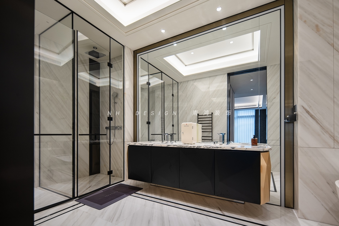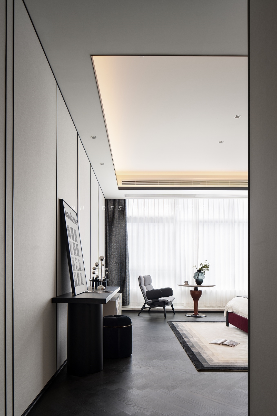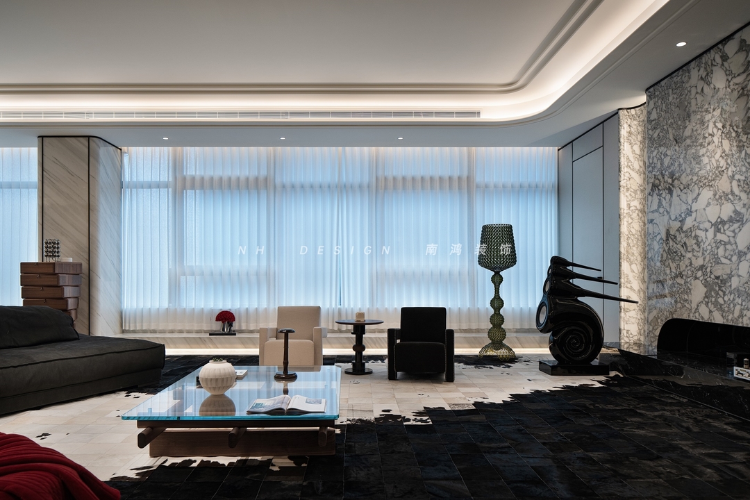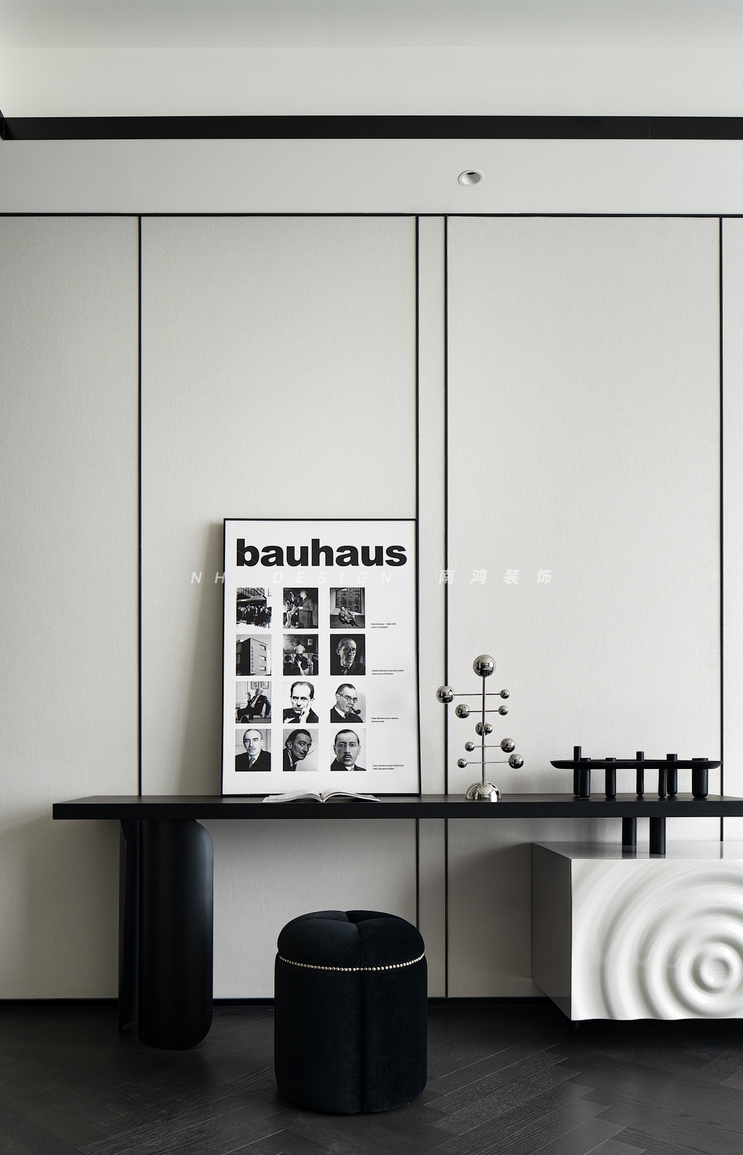 入户,一首摩登现代的都市序曲旋即奏响。大平层的开阔视野,借由镂空玻璃隔断巧妙过渡,界定区域的同时维持住了空间的流动感,继而透过若隐若现的视觉延伸,加之黑色线条的勾勒,强化风格上的张力与节奏。