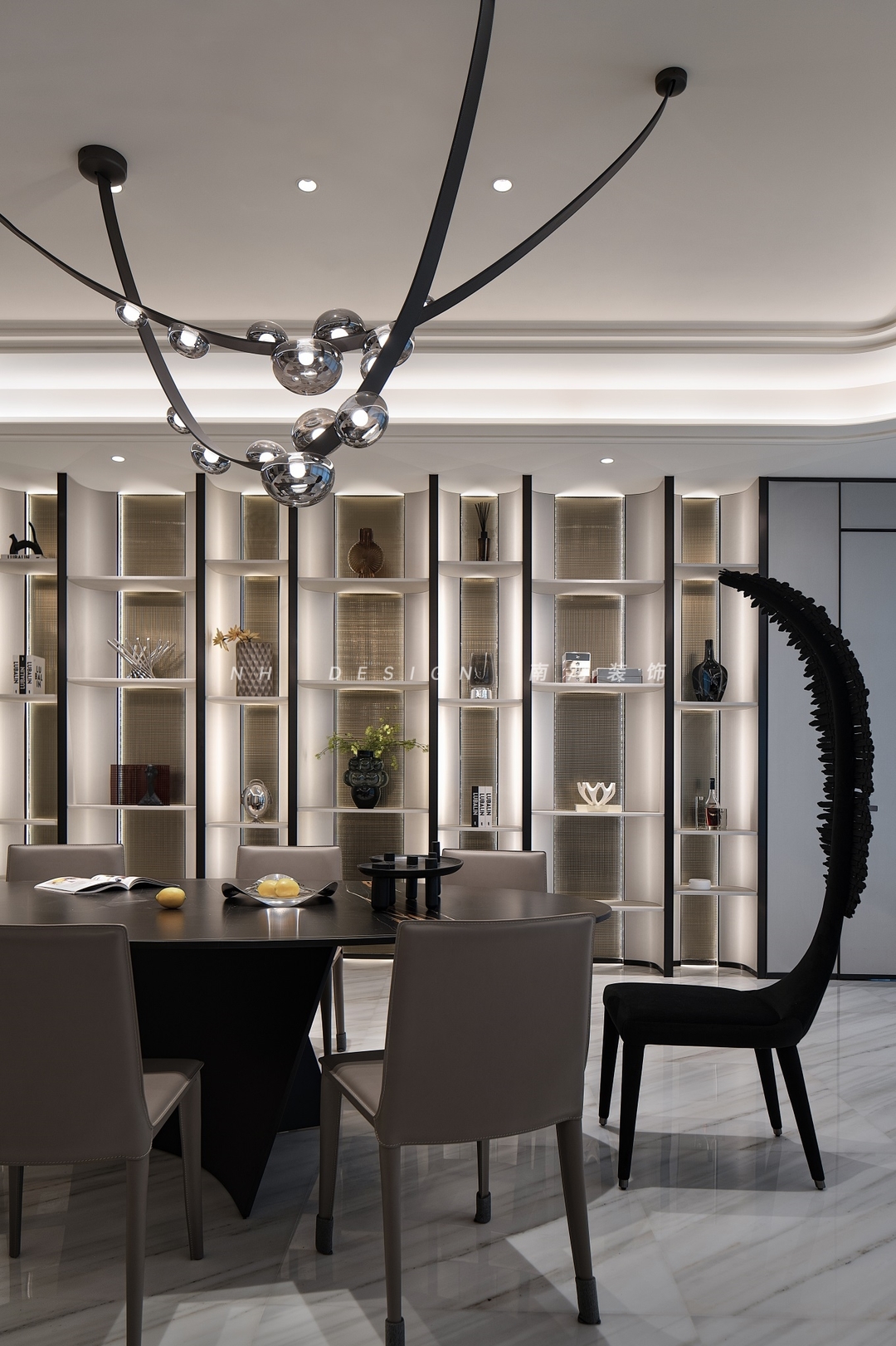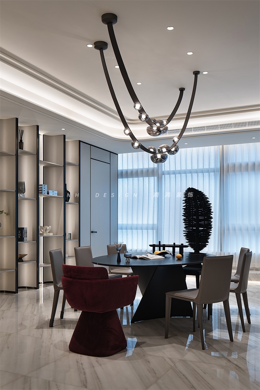 餐厅选用椭圆形岩板餐桌,围合搭配不同色调与造型的餐椅,上方则垂坠有一盏流线型创意吊灯,优雅而利落的光影语言,塑造出极富氛围感的就餐场景。