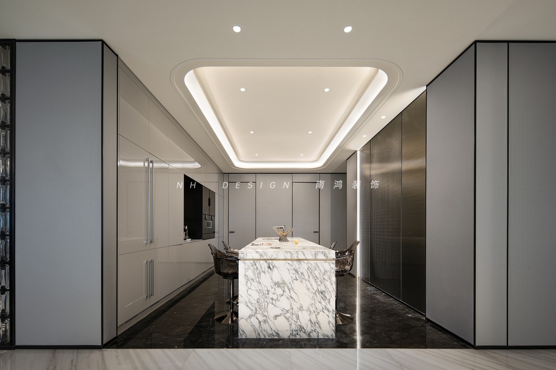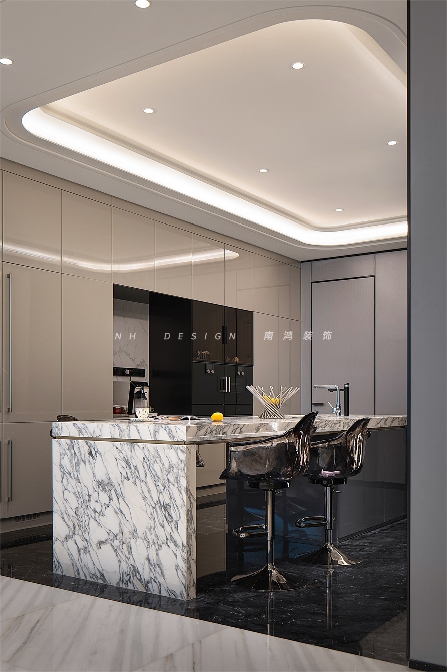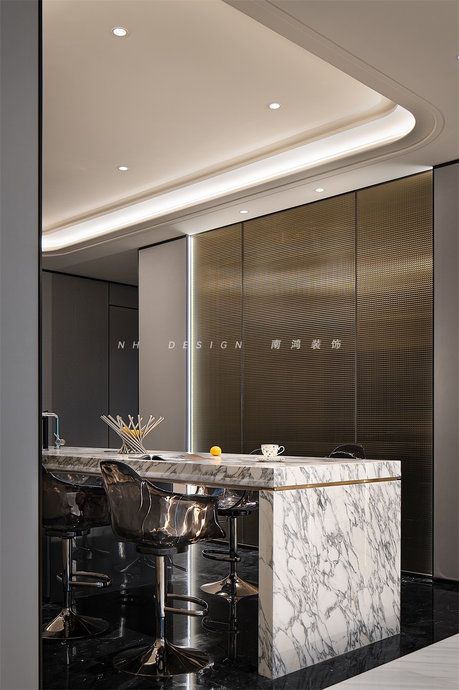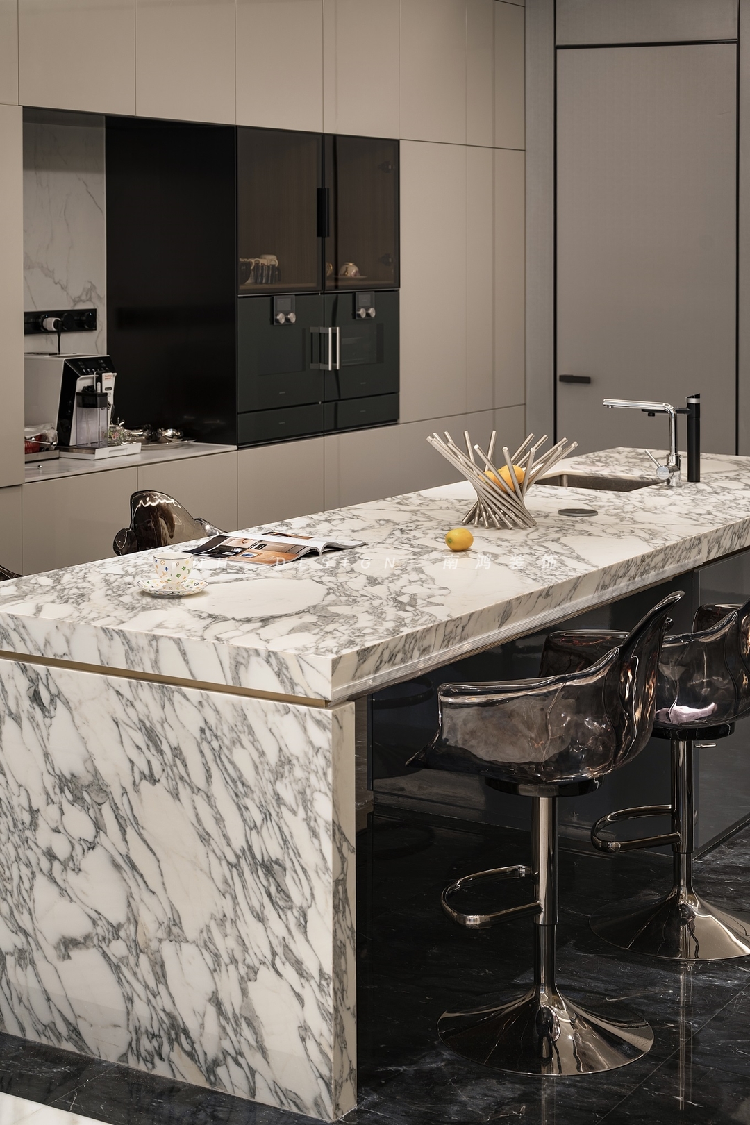 西厨中央配置一张奢华大理石岛台作视觉的核心聚焦点,金属质感吧椅轻盈环绕,打造出精致且大气的洄游型餐厨场域。