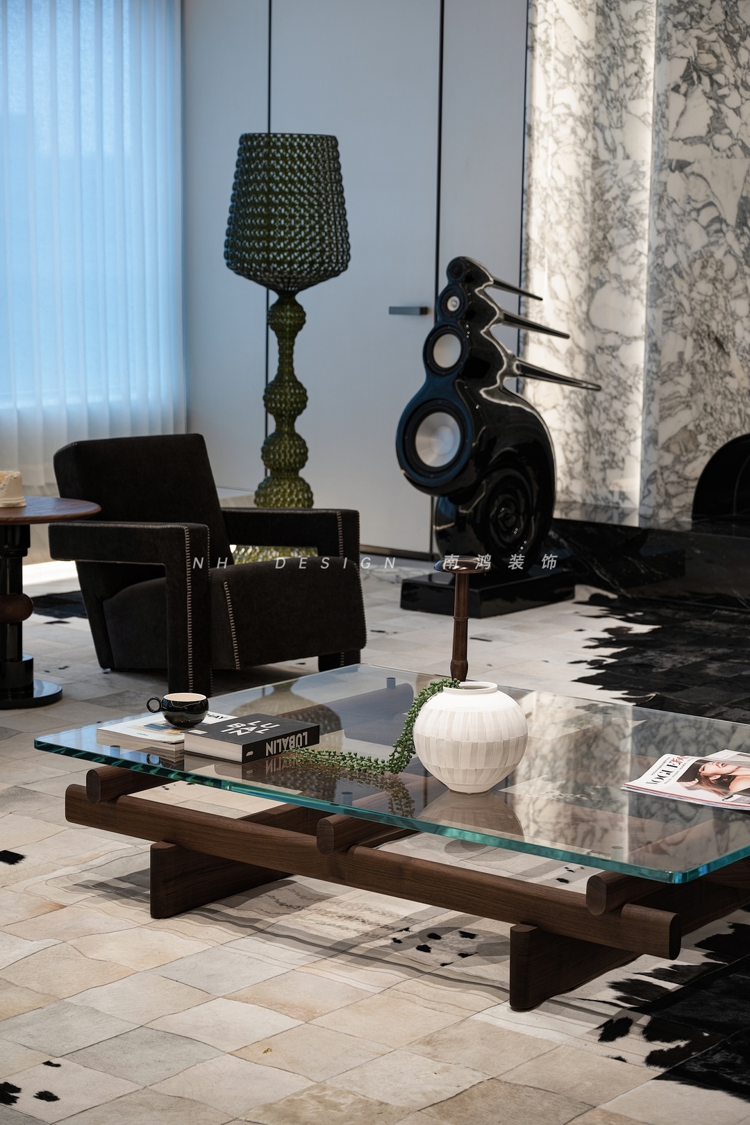 优雅、时尚与大气,是这方客厅的主旋律。主背景墙两侧,落地式复古蓝牙音箱静立其间,实现功用与美学的统一。软装家具精准把握多元场域关系,宽适的主沙发搭配左右休闲单椅,不对称中见平衡,无声构筑起开放又自在的现代化社交场景。