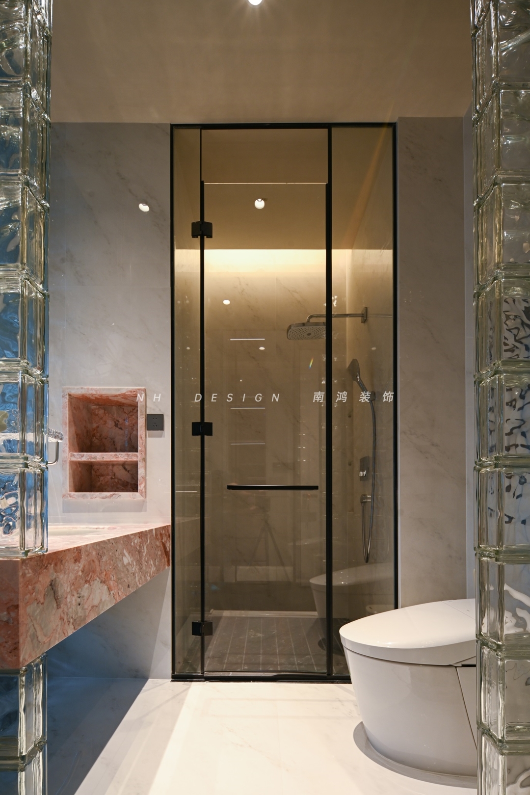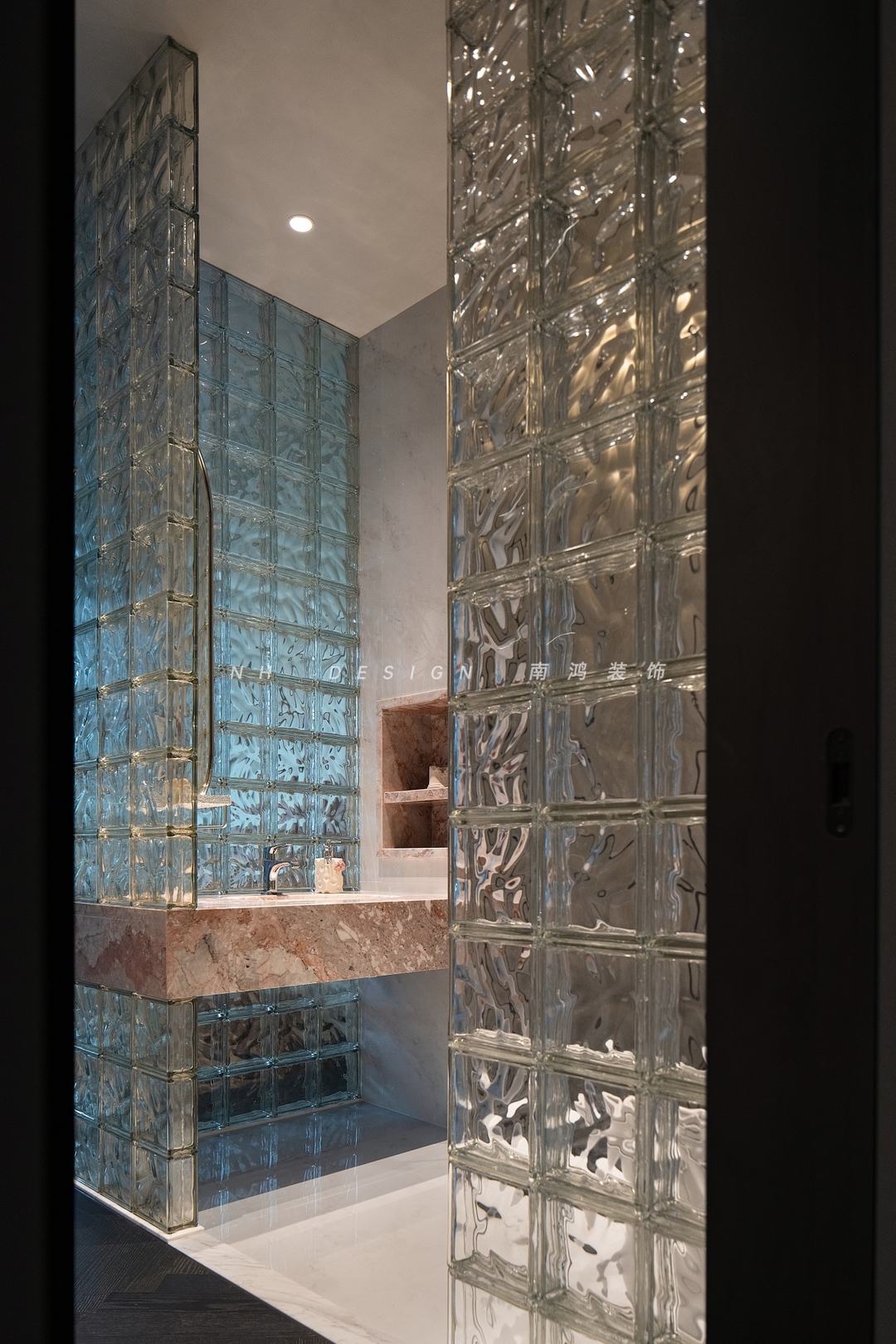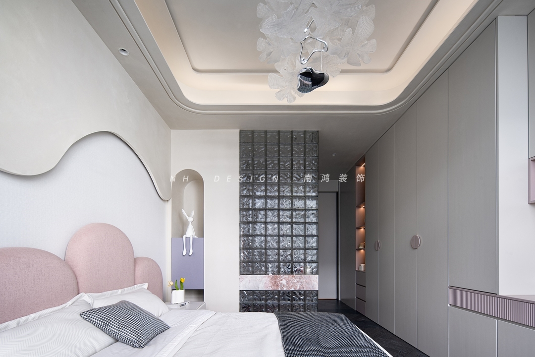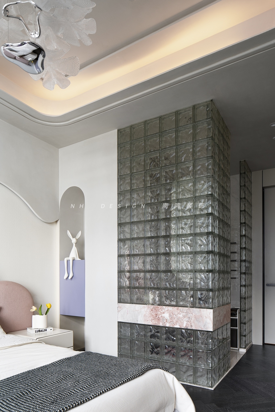 儿卧这间暗卫,通过设计大改造,成功摆脱了无窗的压抑和昏暗。大面积透光玻璃砖,既能自然引光,本身又是一大装饰亮点。内部以极简线条勾勒轮廓,营造轻盈美学。