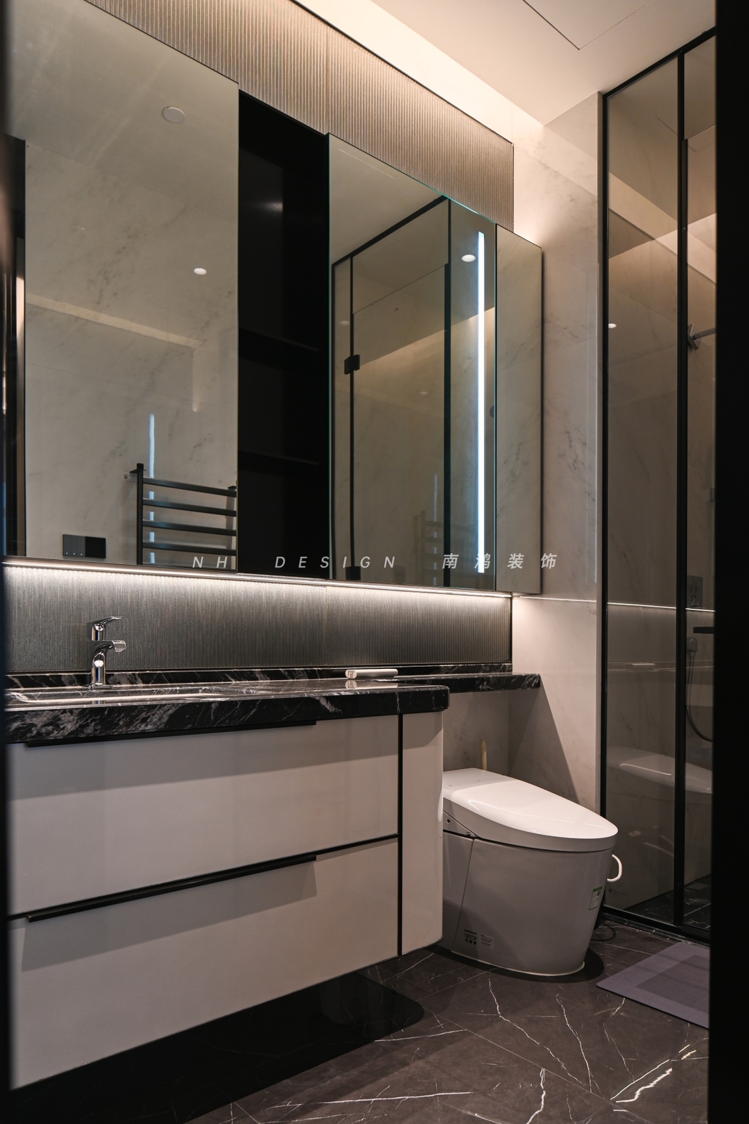 这间次卫则借助镜柜最大化收纳考量,台盆一体延伸至座便器后方,连贯利落的台面,既显统一整洁,又顺势增加了墙面区域的收纳空间,方便放置洗漱用品或装饰小物。
