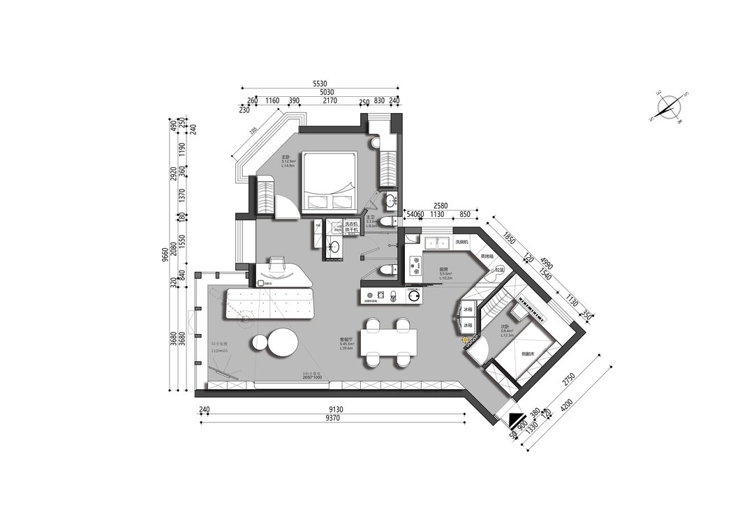 A:平面布局的改动主要是开放空间,书房&厨房设计开放区域,与客厅连通起来。另外就是改动洗手间,从客厅和主卧室都可以通向洗手间,形成双动线。