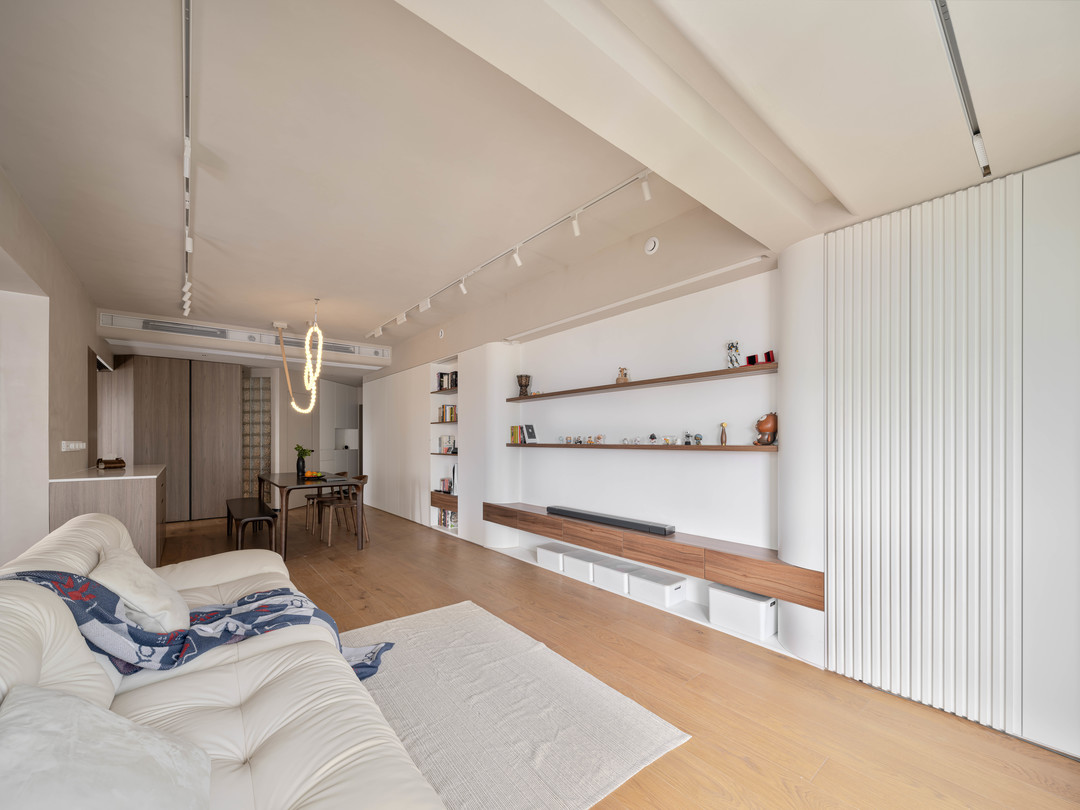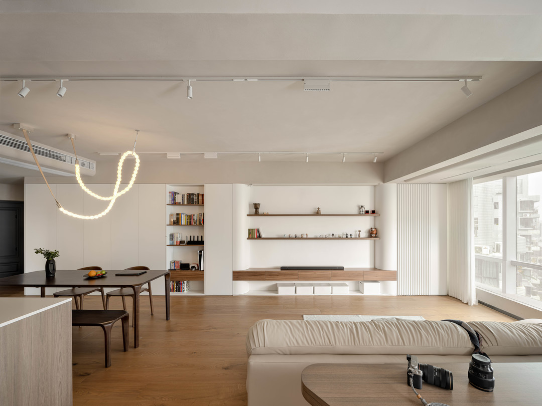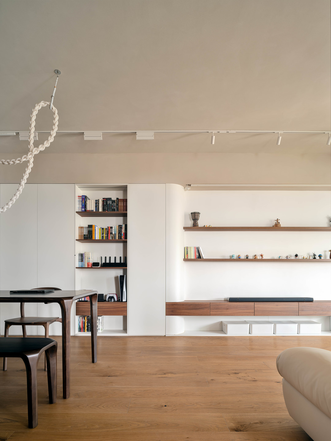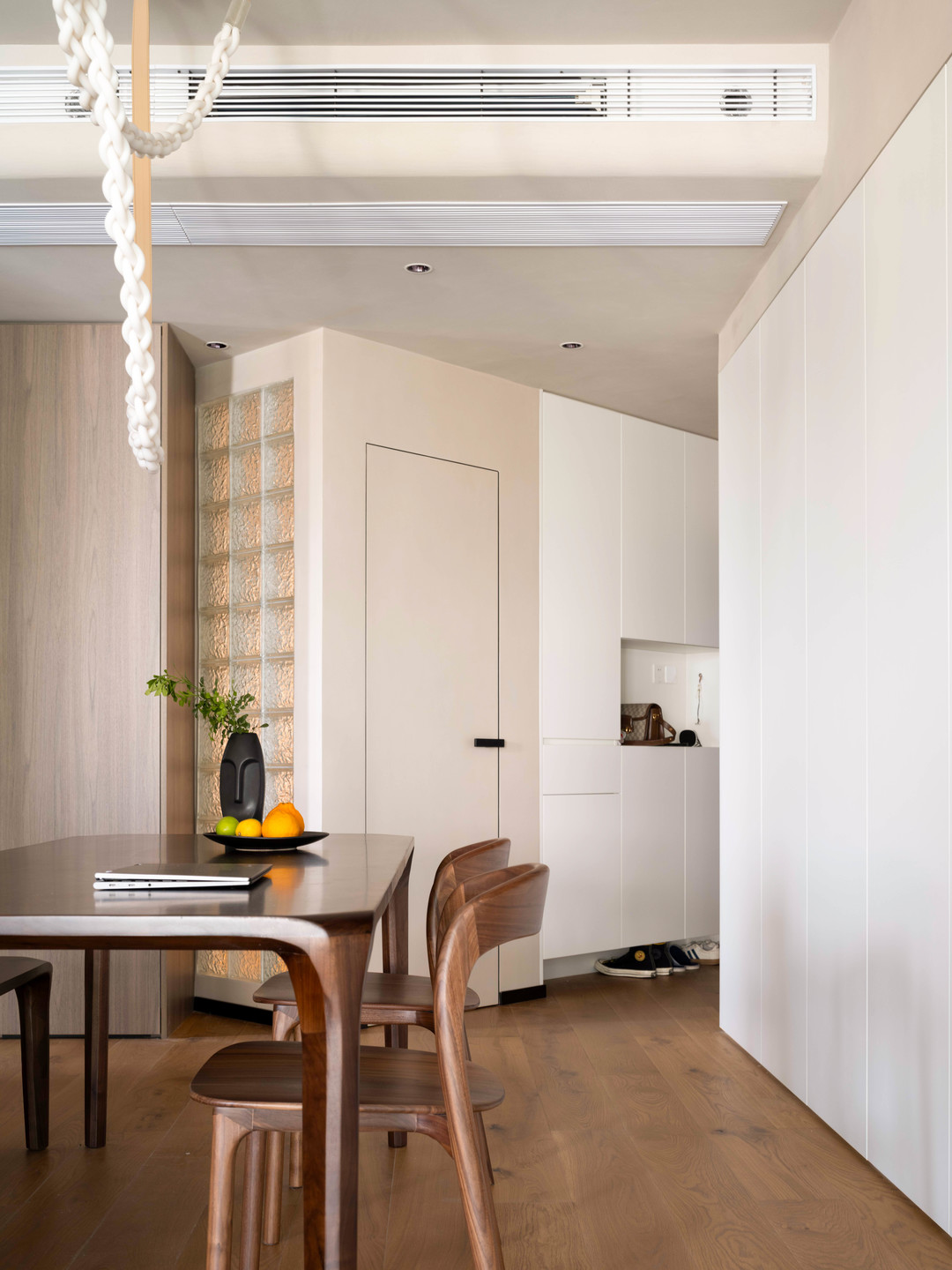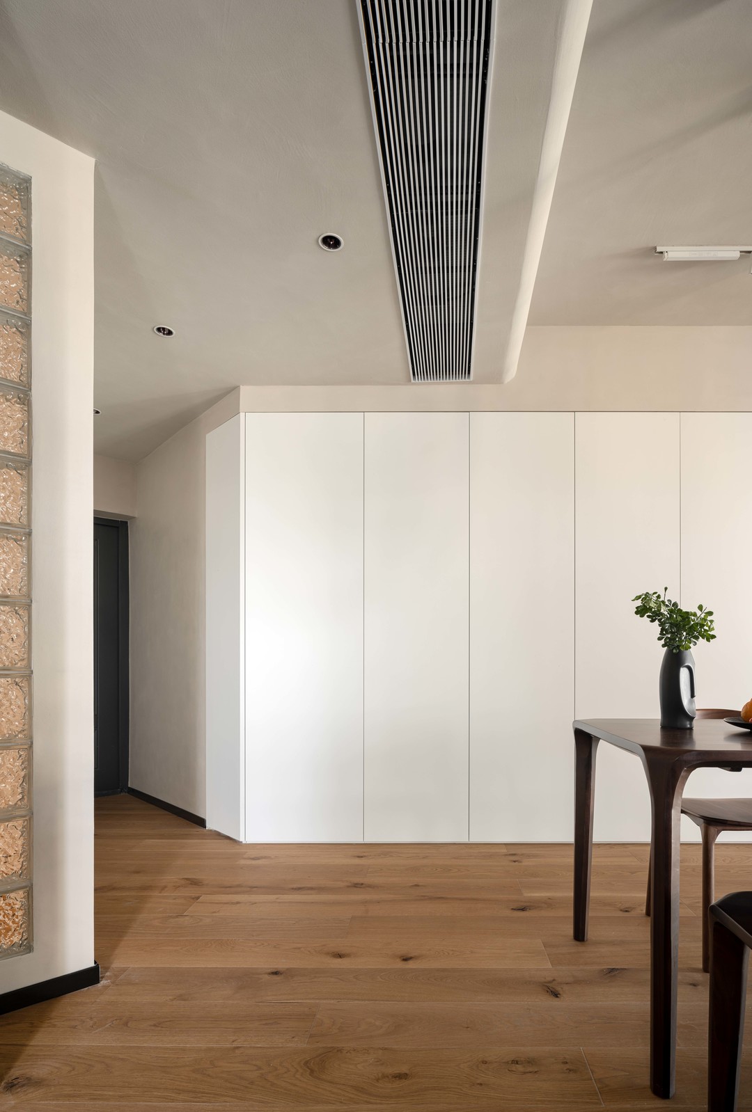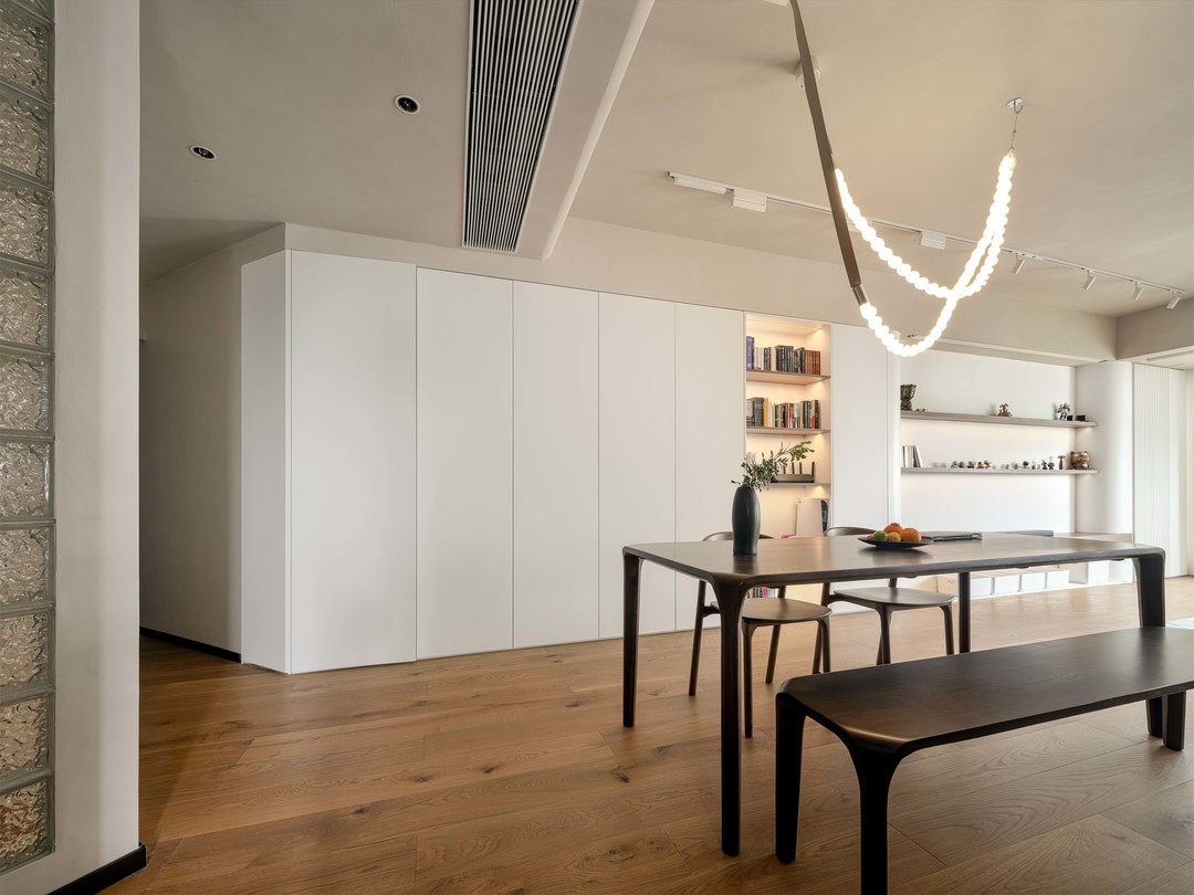 接着进来便是餐厅空间,白色的柜体依旧沿着玄关往室内空间进行延伸,储物空间充足了,室内的布置自然会更加简洁。