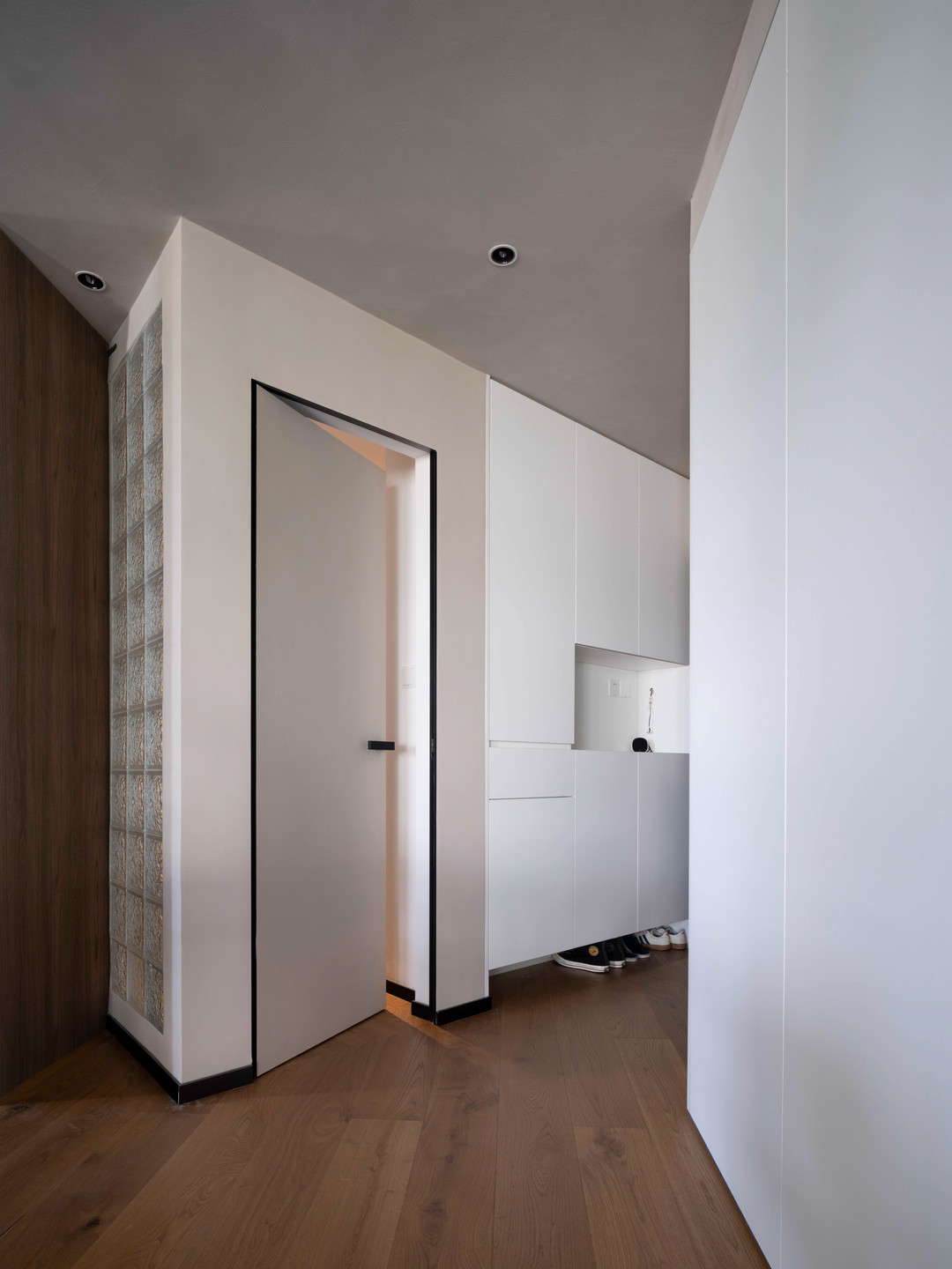 玄关的部分非常简洁,一组白色鞋柜收纳好进屋来的各种东西。中间凹陷一个开放格,用来收纳快递和随身小物件,地面抬高则是为了收纳经常换用的拖鞋。