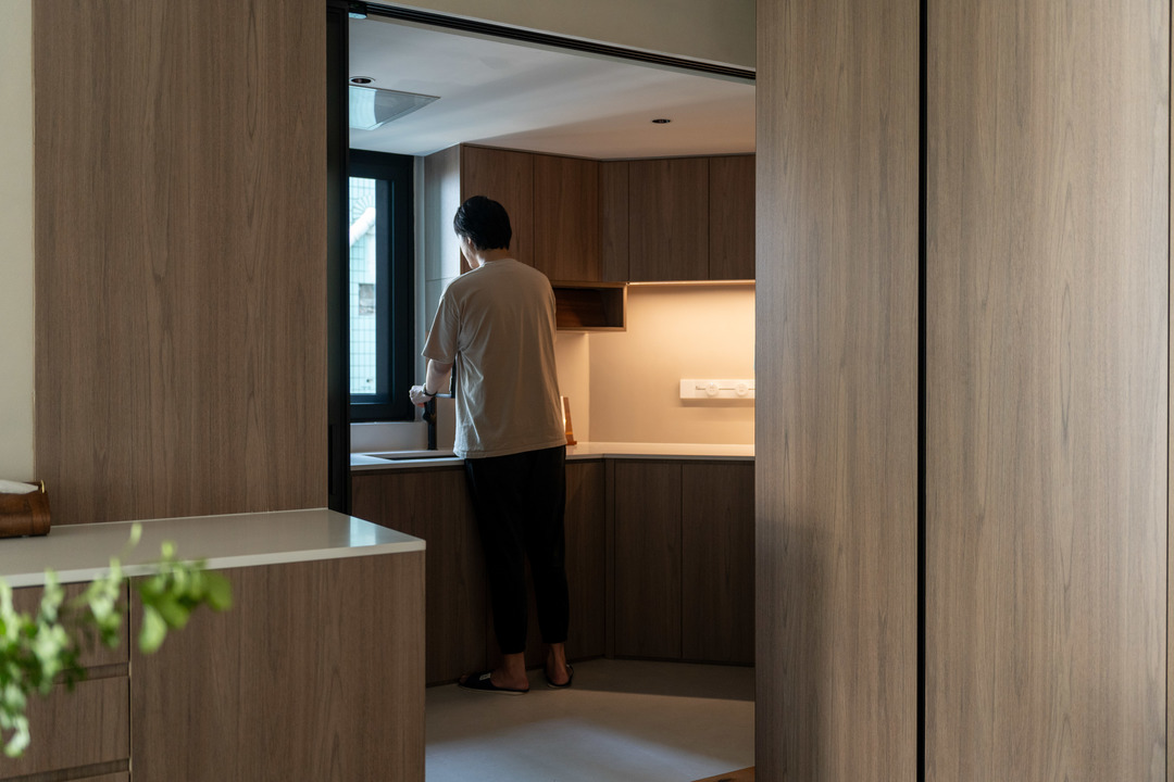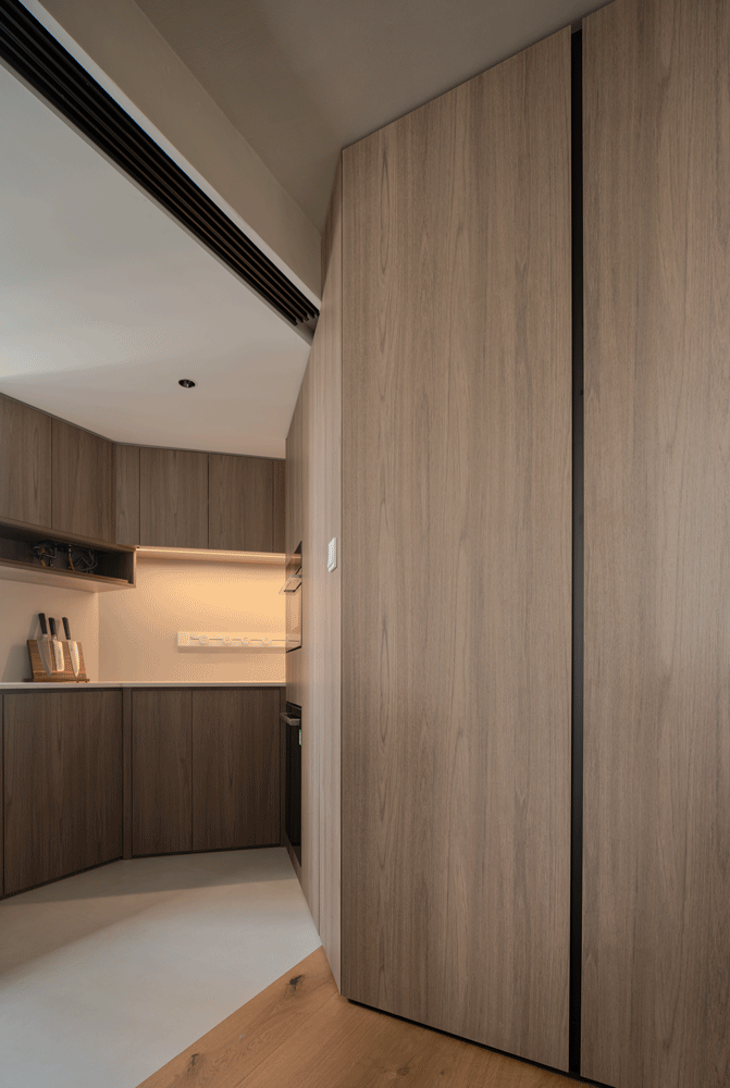 隐藏门平时暗藏收纳在柜体侧板内部,只有当爆炒的时候才需要将柜门拉出来,日常使用时可以权当开放式厨房使用。