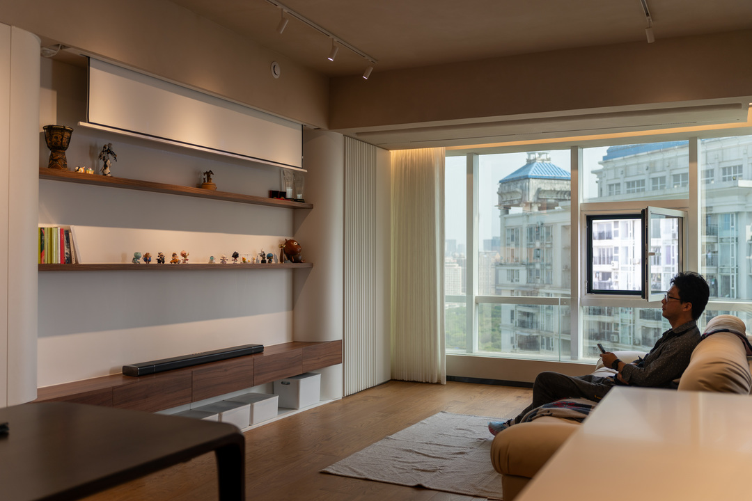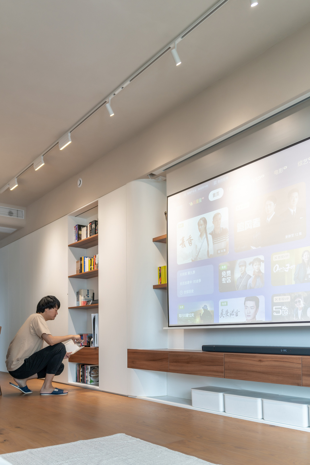 幕布和多余的线材也暗藏收纳柜体中,前期设计时精确计算好尺寸,幕布降下来后不会遮挡回音壁,形成完美的搭配。