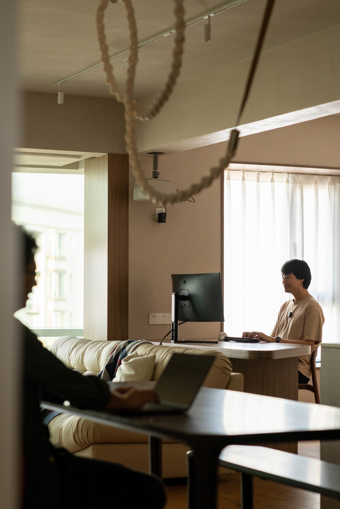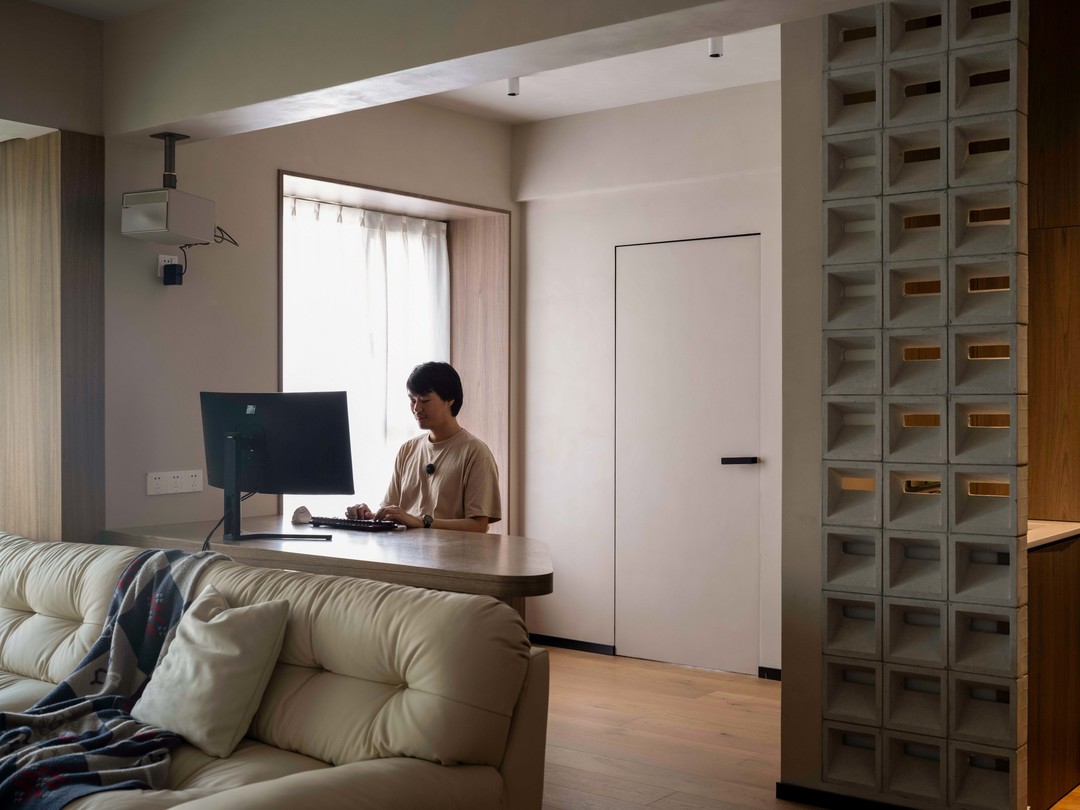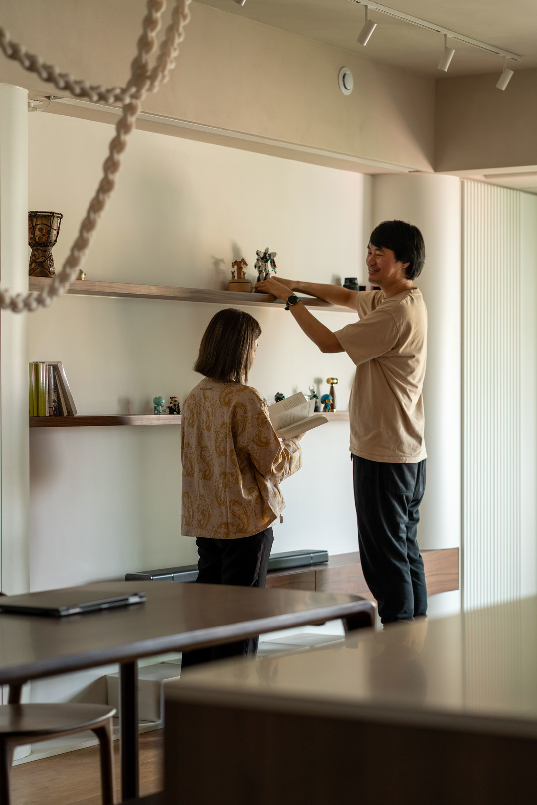 按理说开放书房与客厅之间会互相打扰,但屋主夫妇平时的生活节奏保持高度一致,要工作就一起工作,要休闲便一起娱乐,这样的布置自然也不会有什么问题了