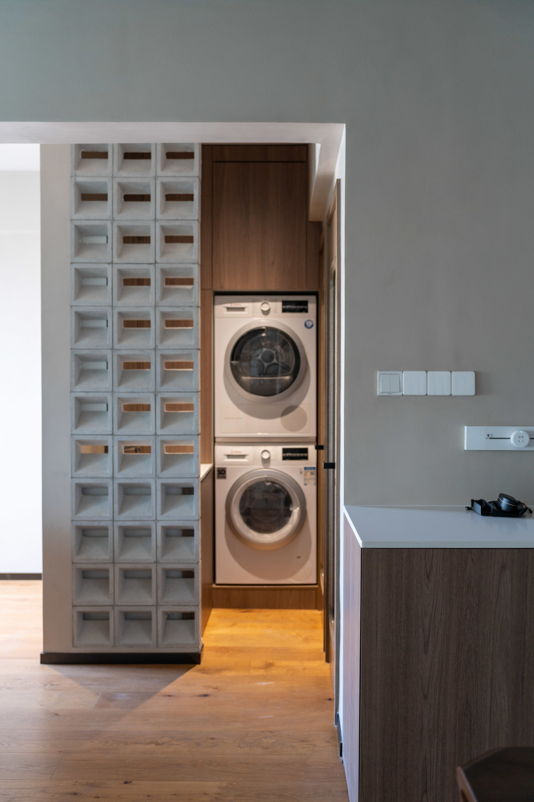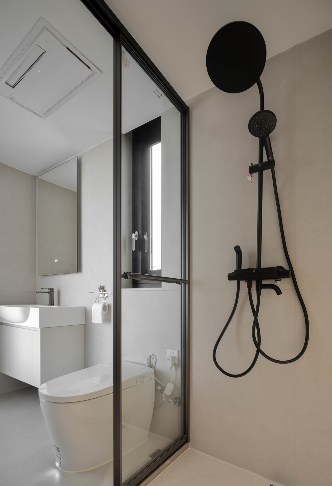 原本的两间洗手间合并后,只剩下一间洗手间。于是为洗手间打造一间专门的出入口,点缀客厅中独特的差异化