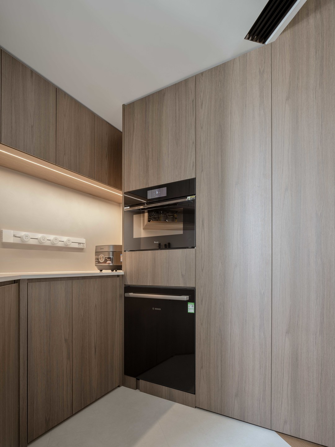 将厨房的空间延伸到外围来,餐边柜&电器柜,都采用与厨房相同的浅胡桃木,以表示柜体空间的区分。