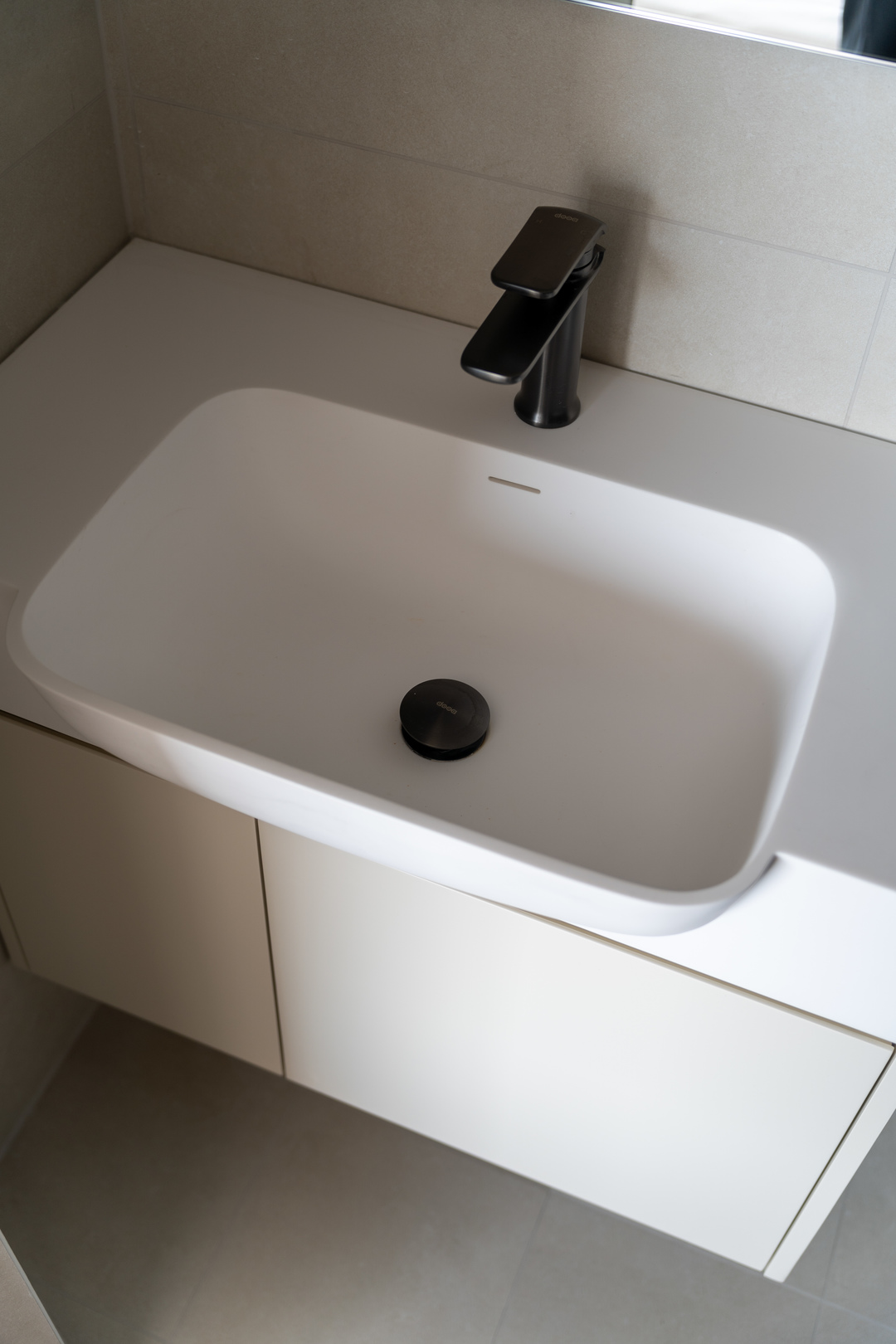 洗手间内部便是一切从简了,可丽耐独立制作的一体式洗手盆。