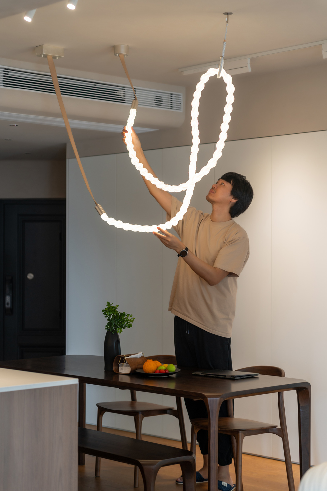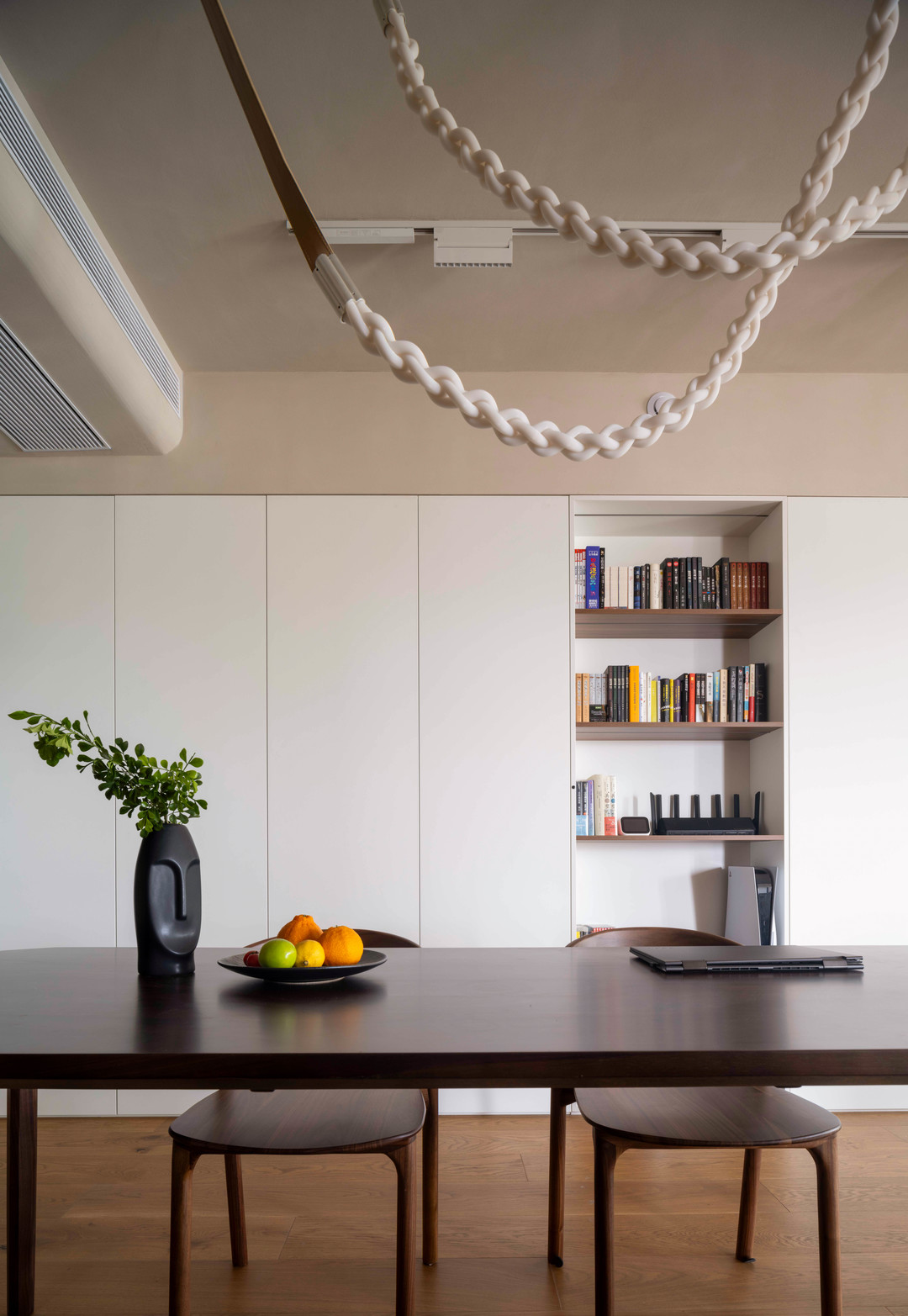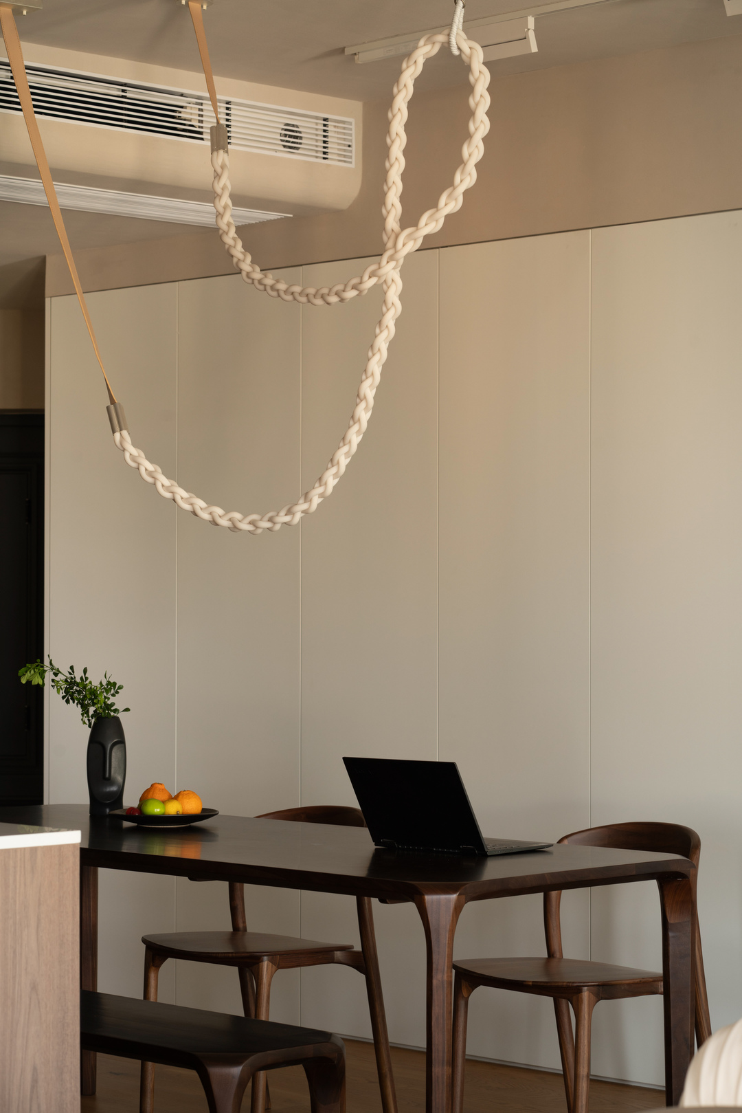 餐桌的吊灯选择了一盏非常少见的灯具,名为“光链”,编织灯具造型的结构在这个空间内与其他地方形成“简繁对比”。俗称,硬装基础软配就不基础。