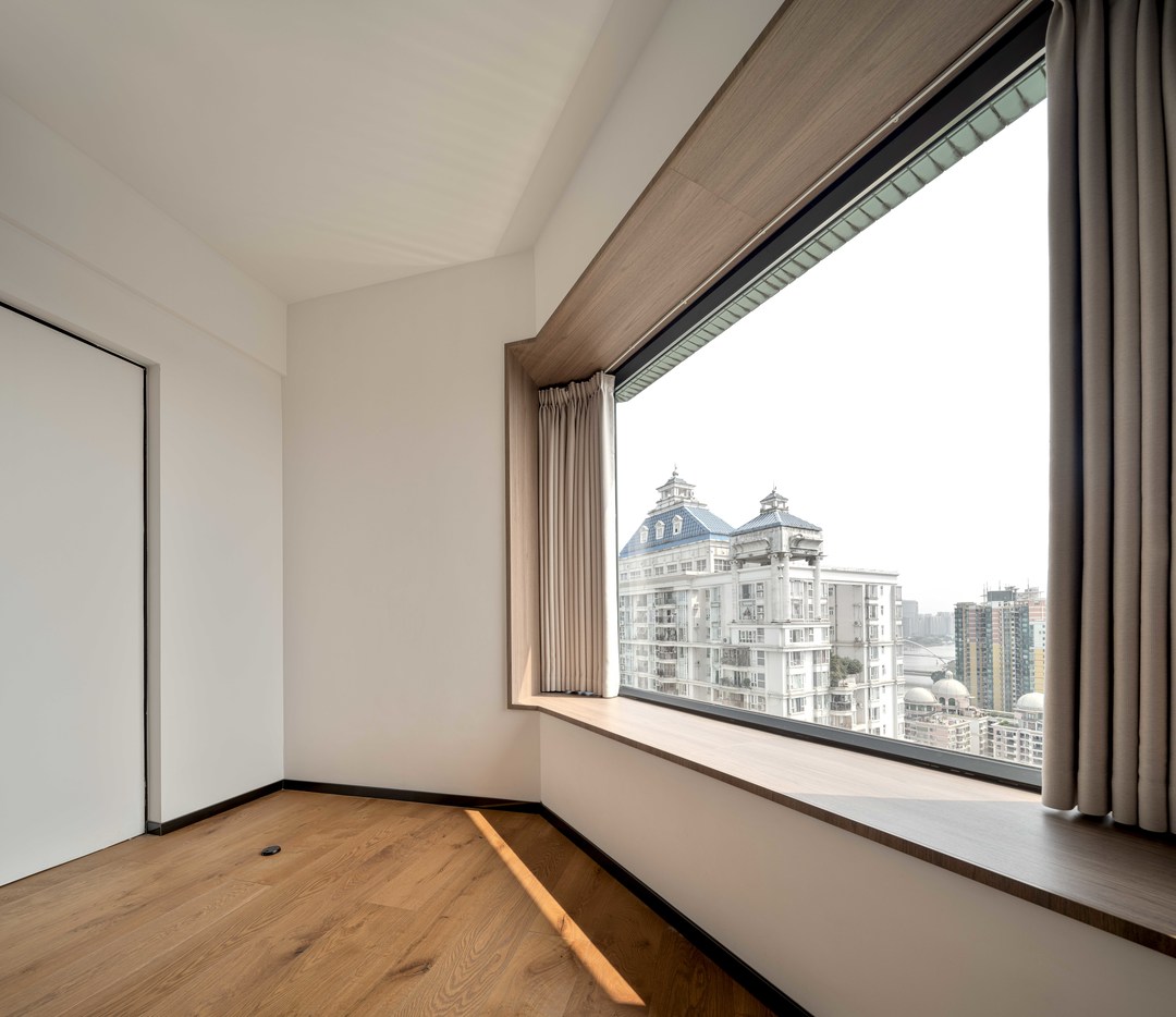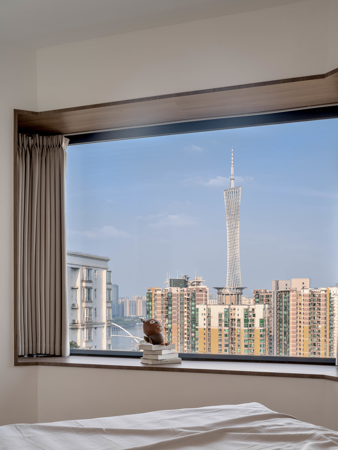 值得一提的是主卧室中的窗套,基于窗外超好的风景,特意定制窗套包裹全部区域。