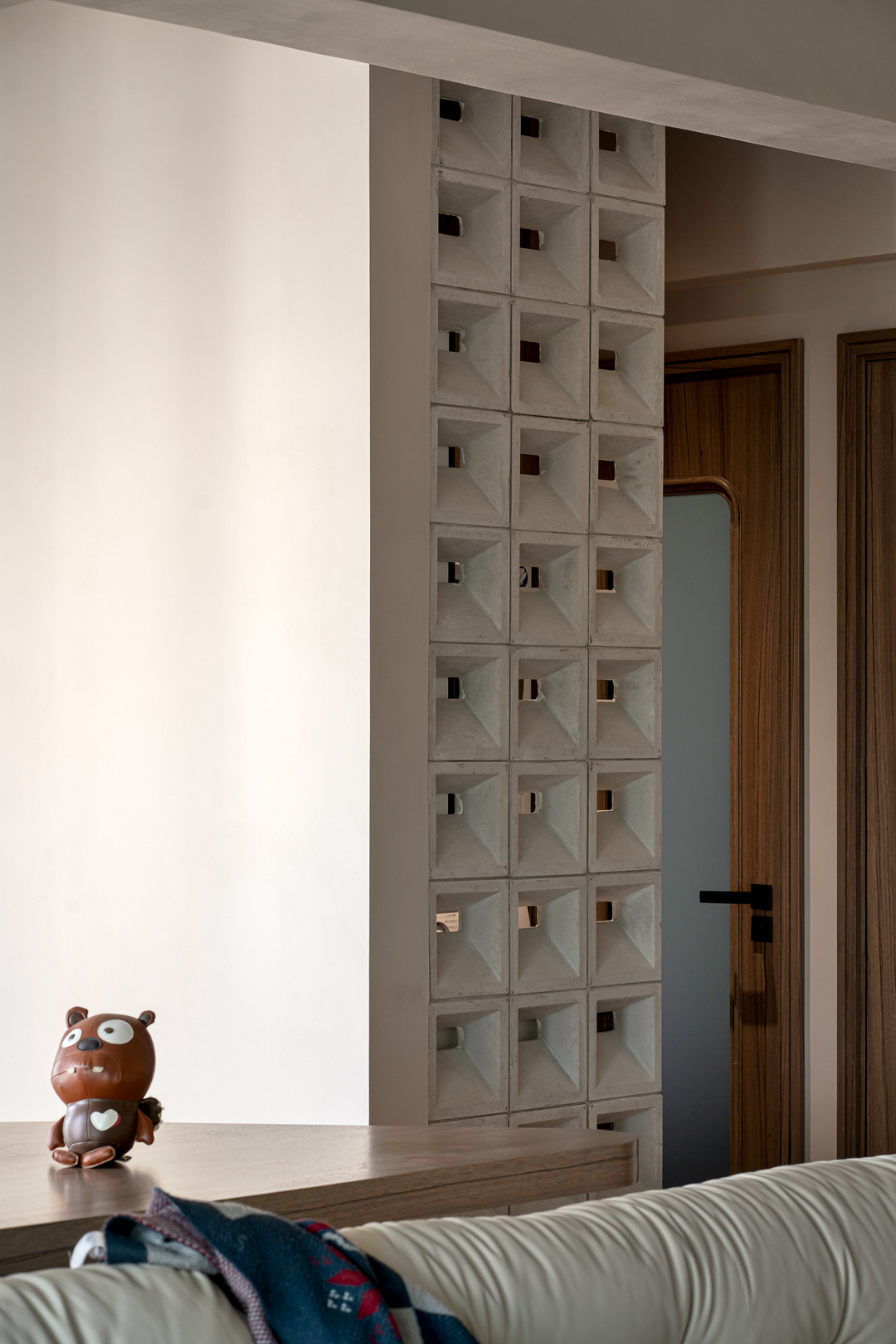 黏土本身具备吸光的能力,内部细小的孔径具备吸光性,即使是最靠近床边的客厅,也可以被这个材料把空间中的光感压下来