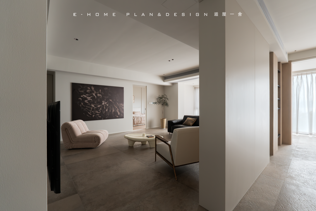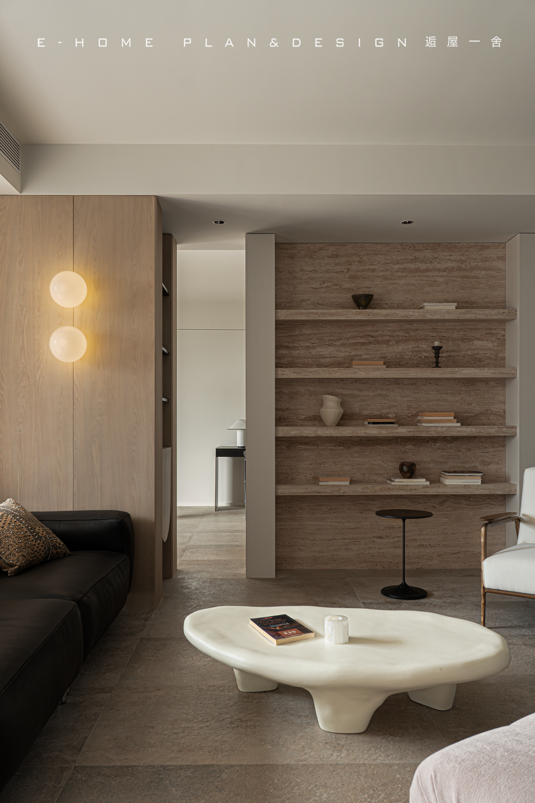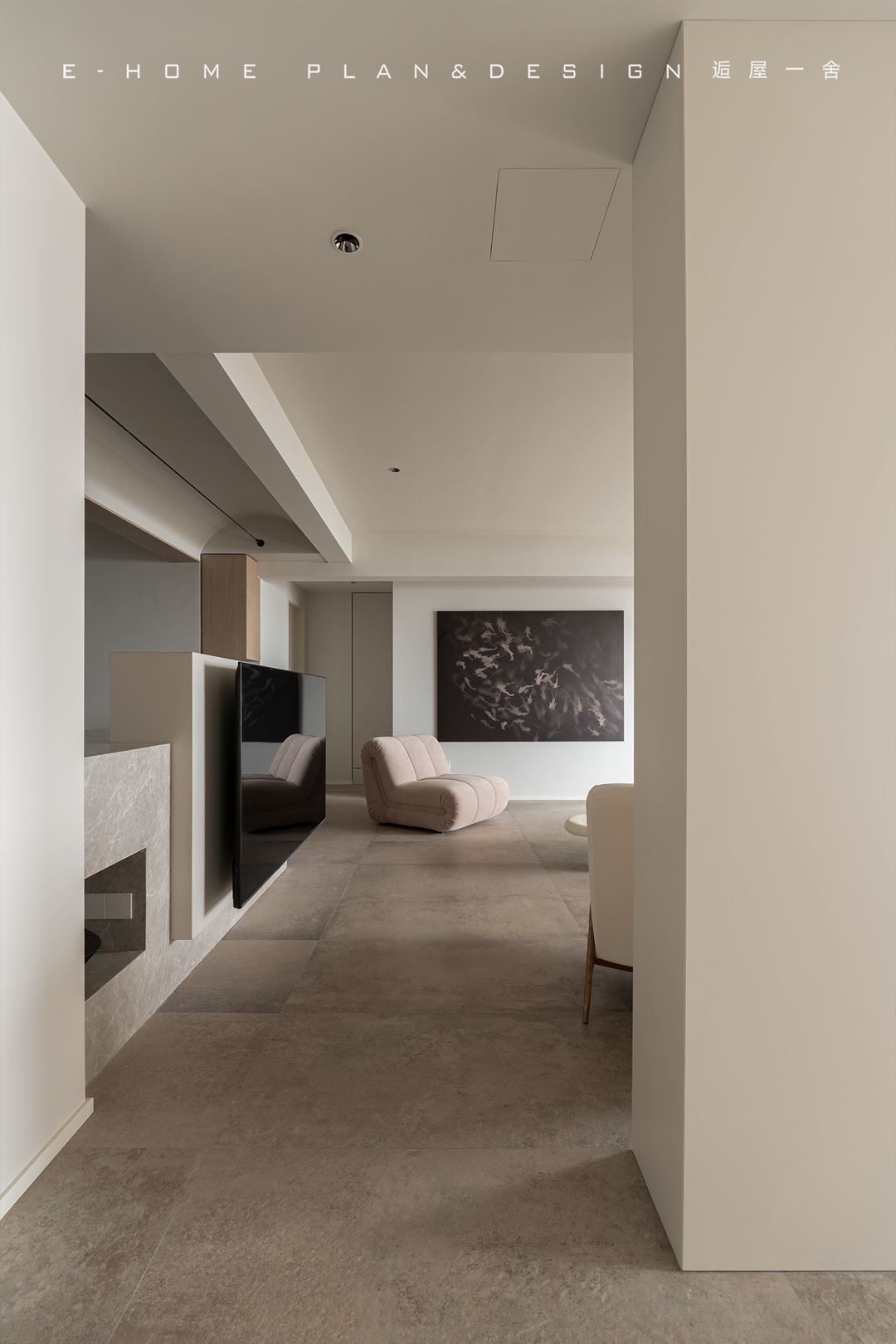 拆除不必要的隔墙后,设计师没有急于完全袒露空间,而是借由墙体之间的各种切口串联成通透的视觉走廊,切口的做法并不影响各区域的独立使用,反而增添了整体流动的自由感,洞石的运用让外露的展示变得异常温柔,继续向家的更深处探索。