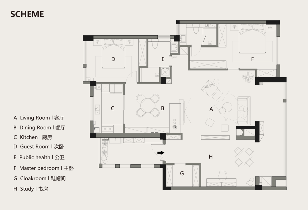 事实上,它给我们最大的颠覆从进门处就开始了,入户不是常见的客厅,而是一个通透开放的多功能厅,既能当书房,也可以作为棋牌活动室使用,客厅倒像是一个掩起来的世外桃源……
