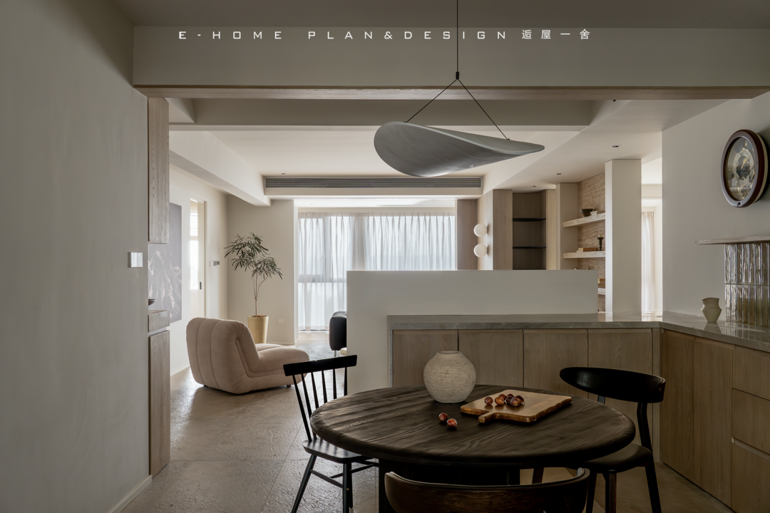 明亮的家庭核心区和无阻碍动线契合了长辈偏爱的实用,一些侘寂元素的加入,比如手工砖的点缀,是平衡两代人之间的连接,这里会是三代人都喜欢的用餐氛围。