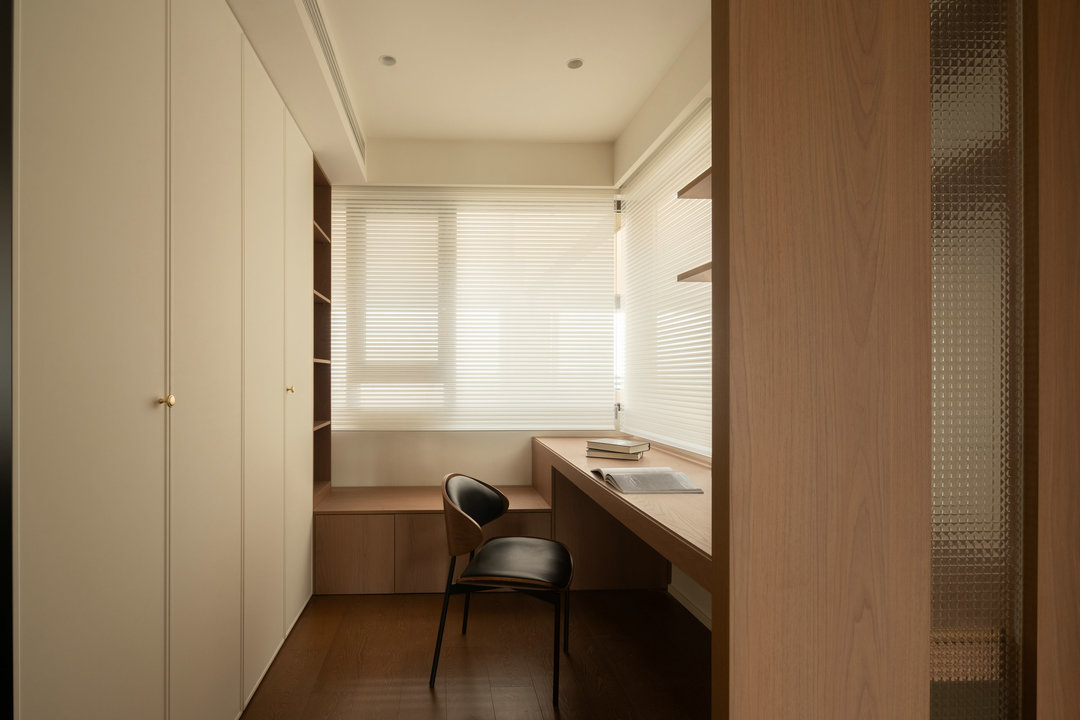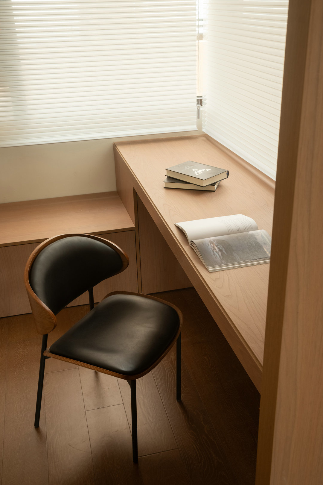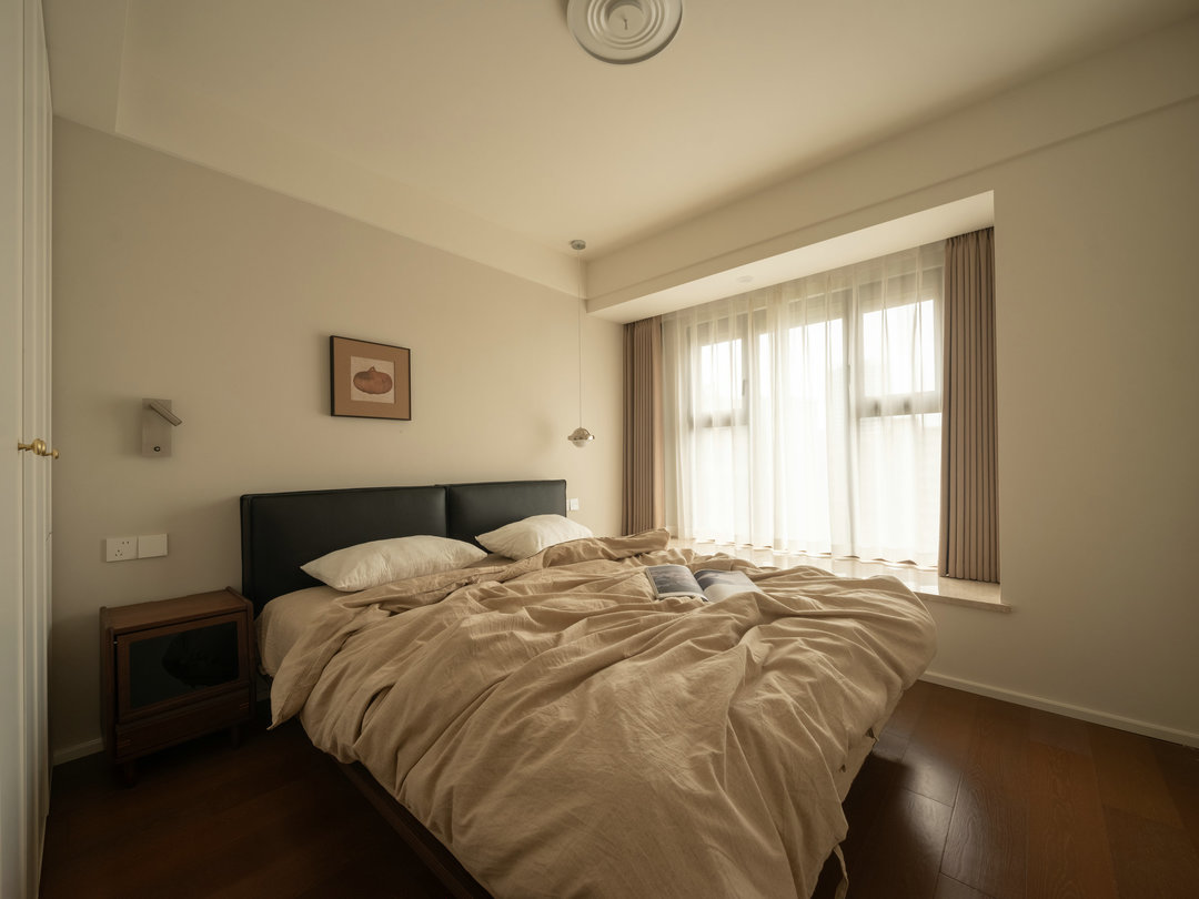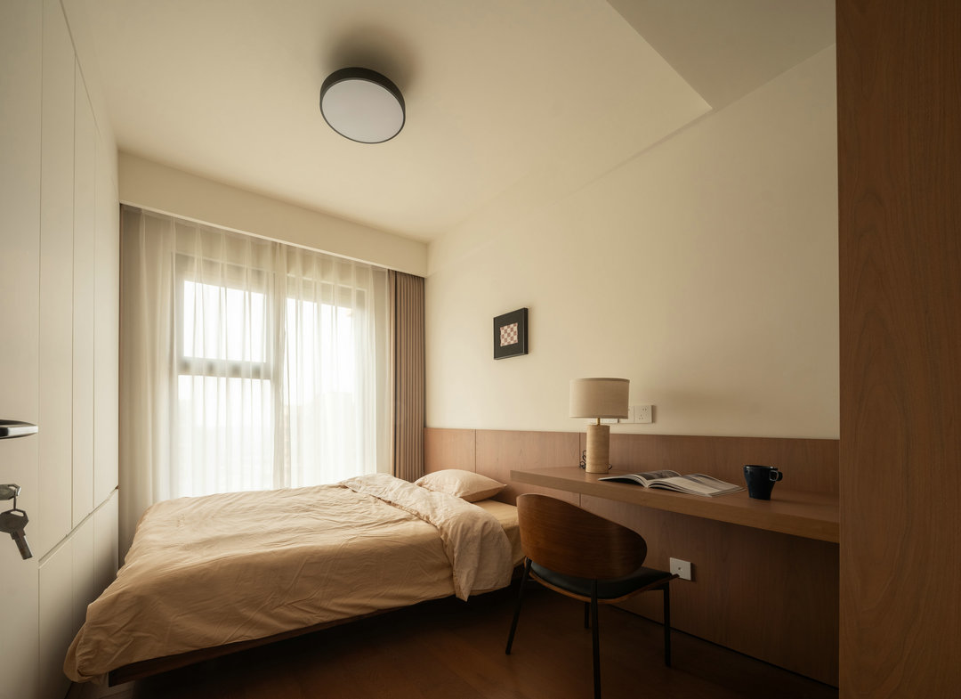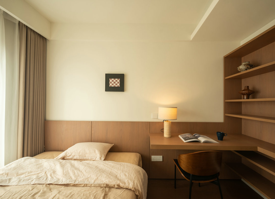 主卧的设计也减到极致,一切只为让人彻底放松。当空间里只剩下最必要的物品——一张床,一个利落的小柜——视觉上没有了任何多余的干扰,大脑才能从纷杂的信息中抽离,真正进入休息的状态。这是一种 “视觉上的静音”。