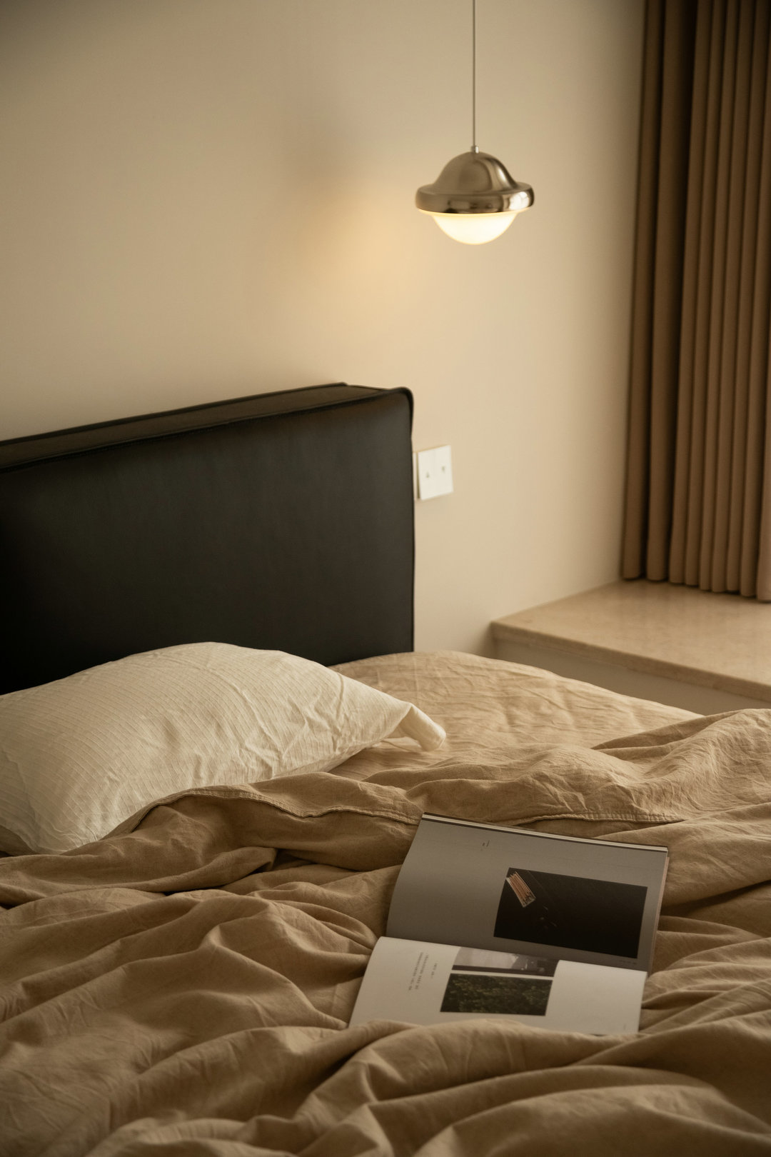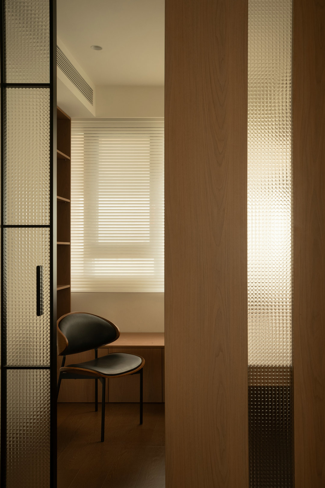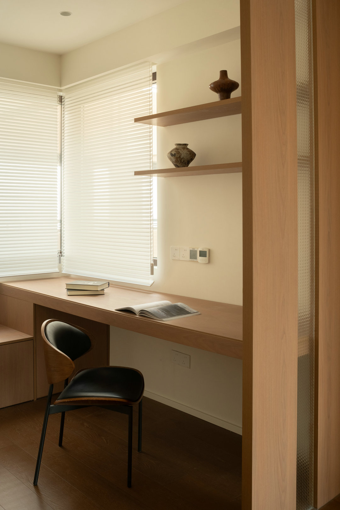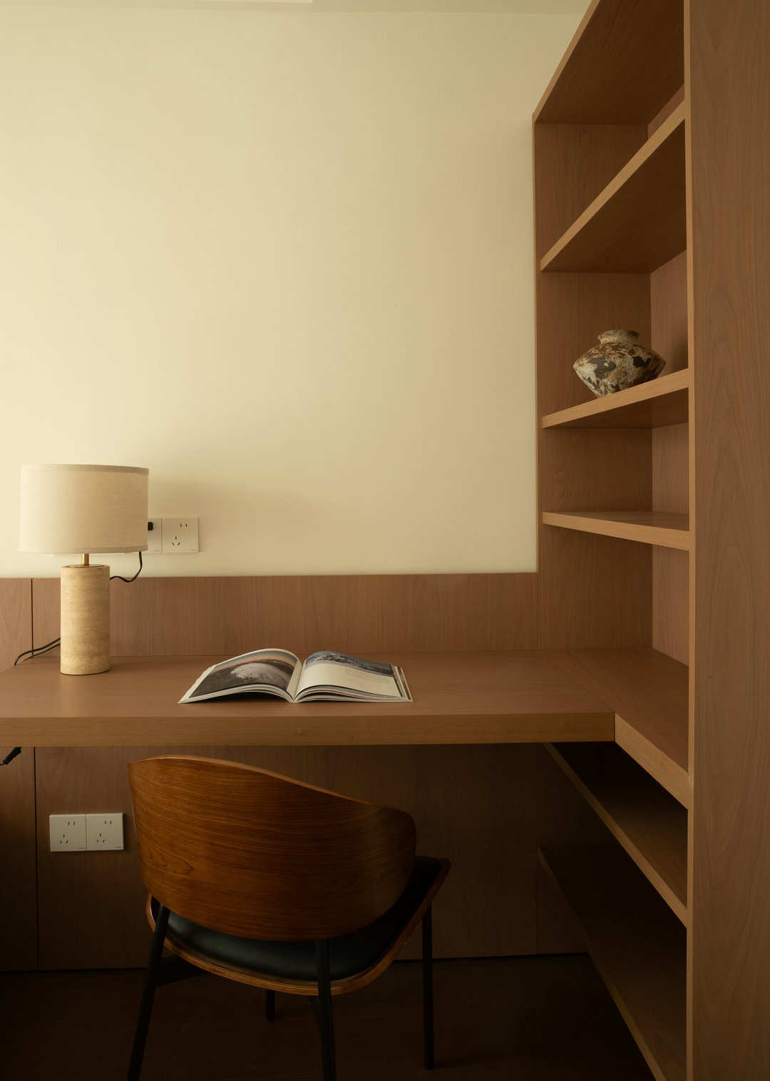 主卧的设计也减到极致,一切只为让人彻底放松。当空间里只剩下最必要的物品——一张床,一个利落的小柜——视觉上没有了任何多余的干扰,大脑才能从纷杂的信息中抽离,真正进入休息的状态。这是一种 “视觉上的静音”。