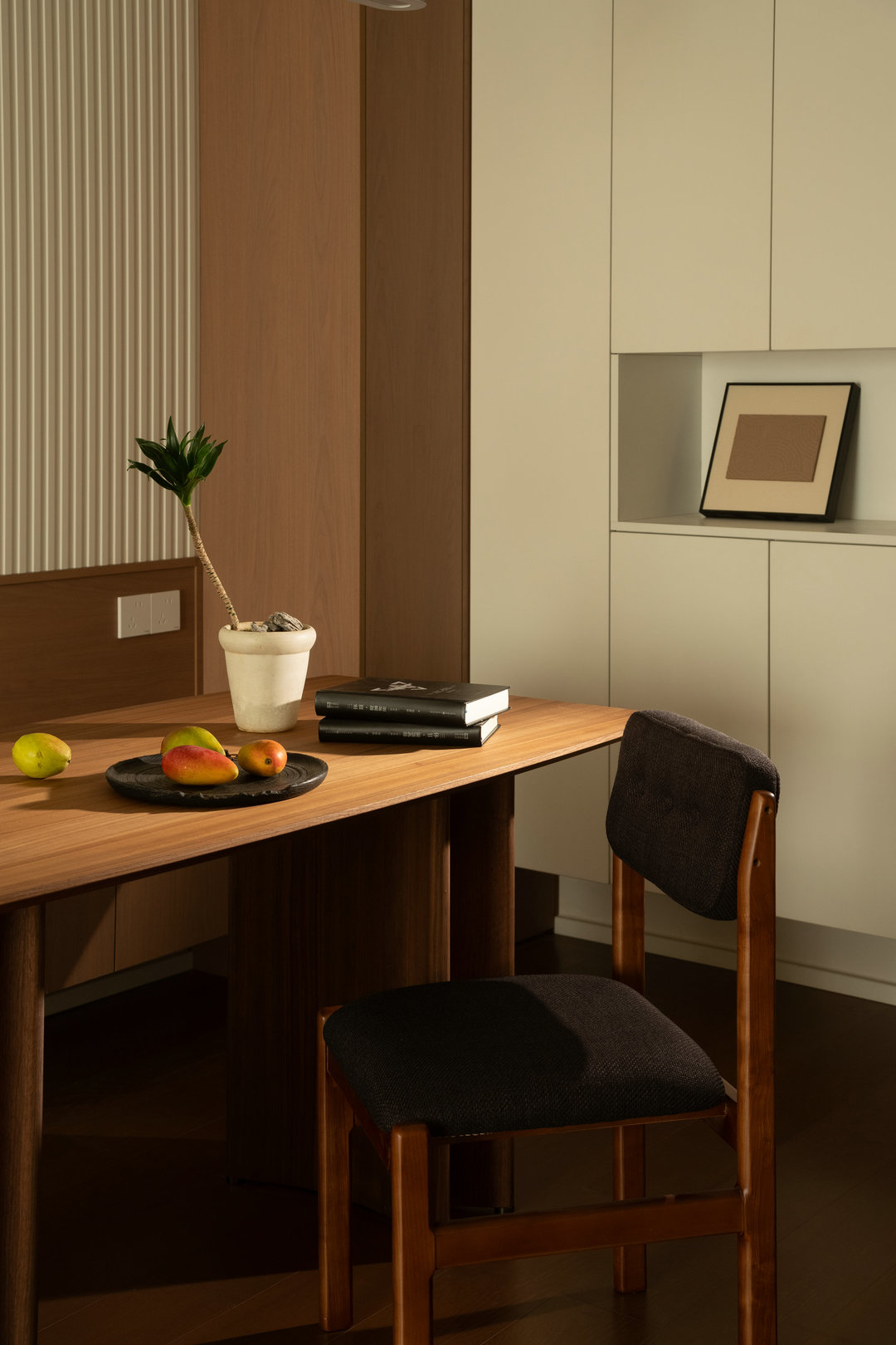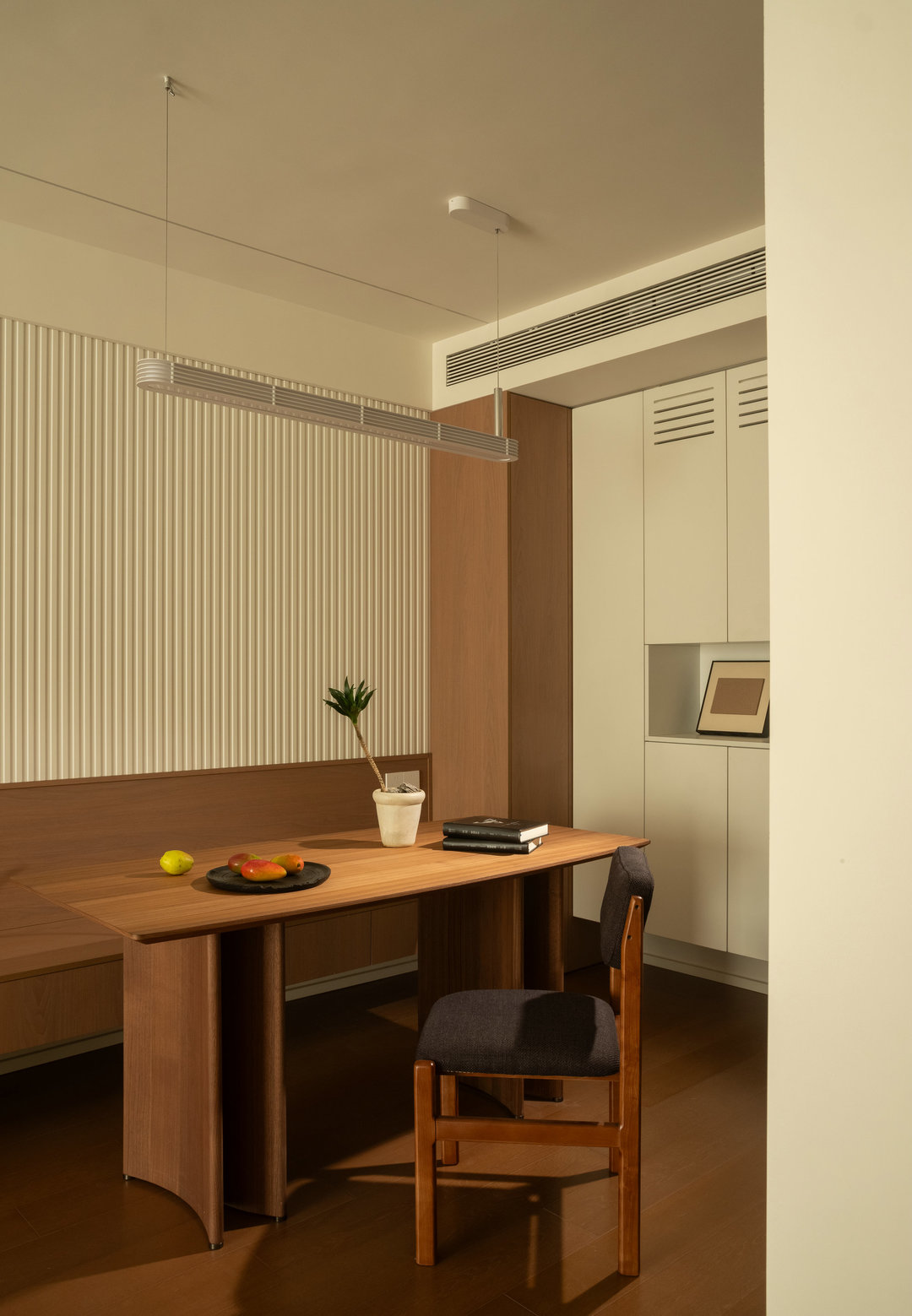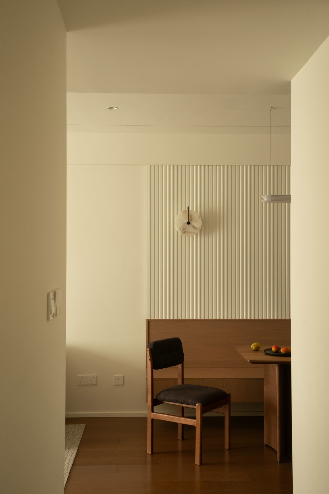 半格栅背景墙,刚好成为卡座的“靠山”,“木与白”的简约基调下,格栅的竖向线条带来了丰富的肌理感和韵律感。它打破了大面积墙面的单调,瞬间“层次感拉满”。