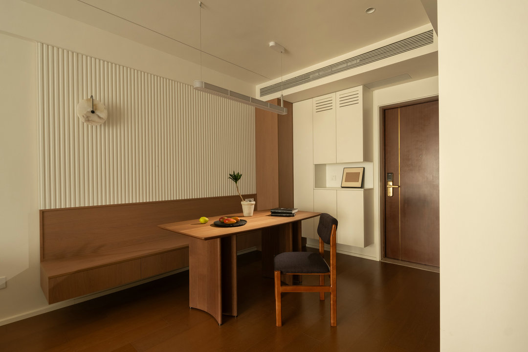 强化设计整体性,玄关没有冗余的装饰,只用收纳做设计,“看不见”的空调系统巧妙隐蔽起来,以为是这个样式的柜门其实是“出风口”
